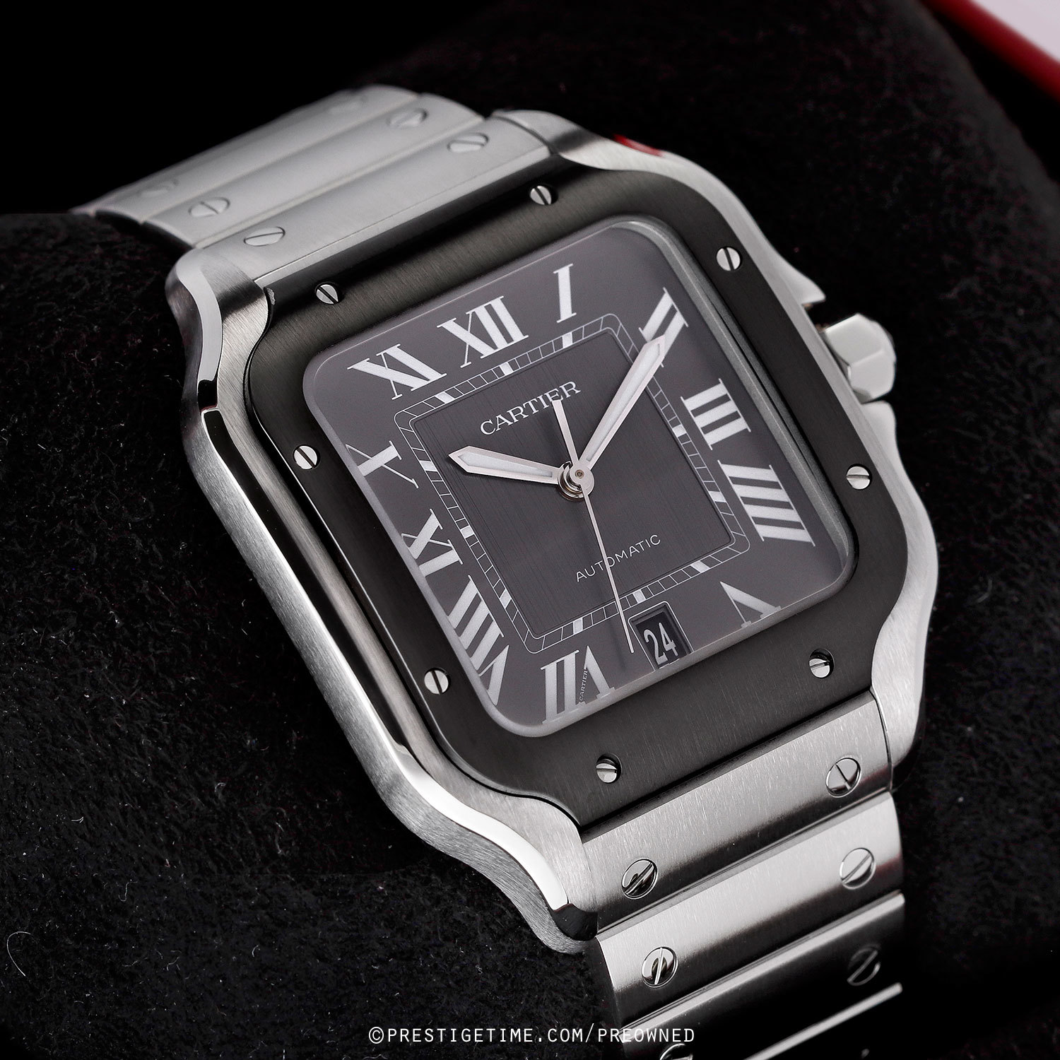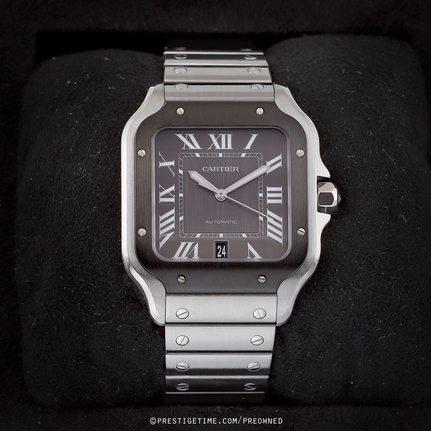 Case: Brushed & polished stainless steel case. Brushed & polished grey ADLC coated stainless steel bezel. The crown is set with a black faceted synthetic spinel. Anthacite grey dial with a linear brushed finished center. Polished hands, the hour & minute hands with luminous fill. Luminous Roman numeral & index hour markers. Fine printed minutes/seconds track. Date window at 6 o'clock.