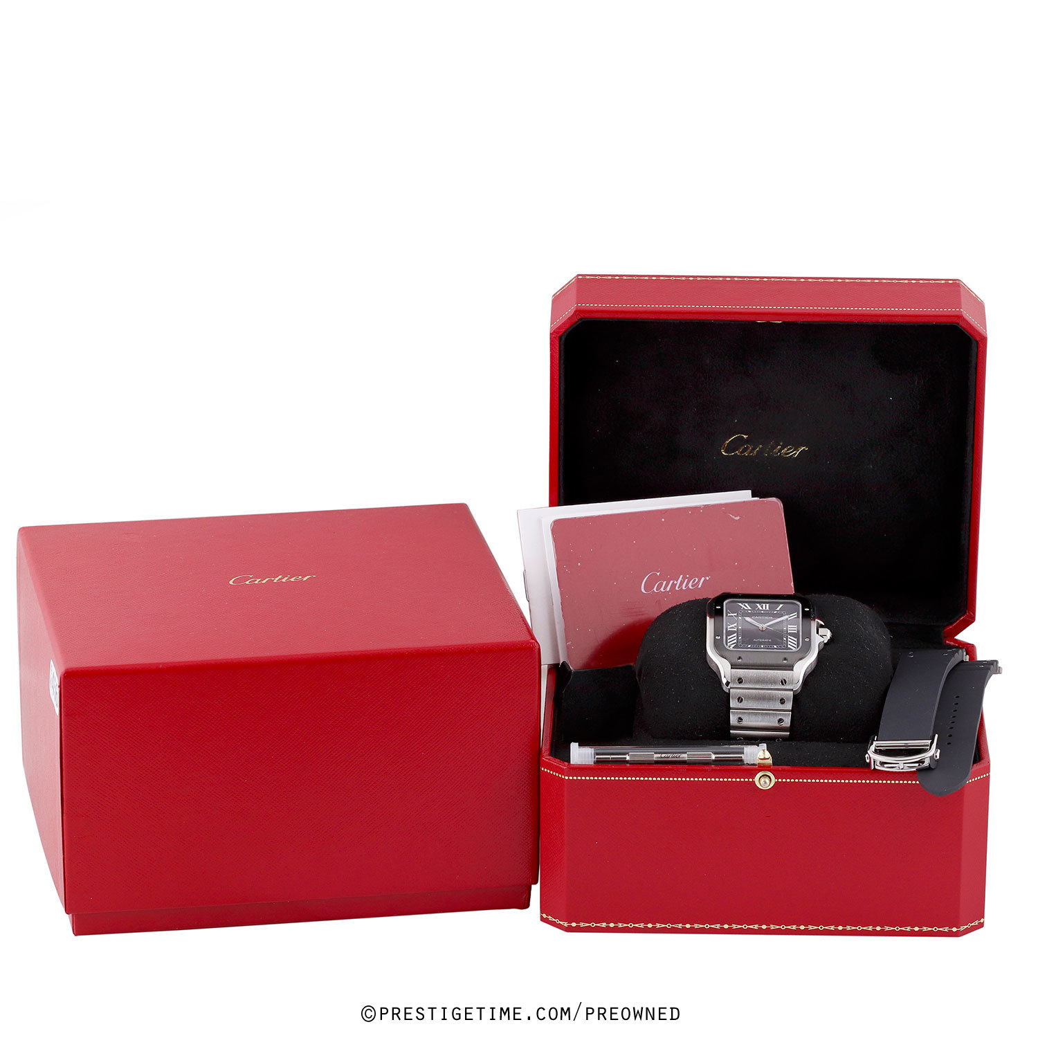 - Delivered with an addition Cartier original black rubber strap, featuring polished screw accents and with an interchangeable stainless deployant buckle. The strap is excellent near-new condition with only very light signs of wear & with its full wear lifespan remaining. We would be comfortable rating this strap as in 98% condition.