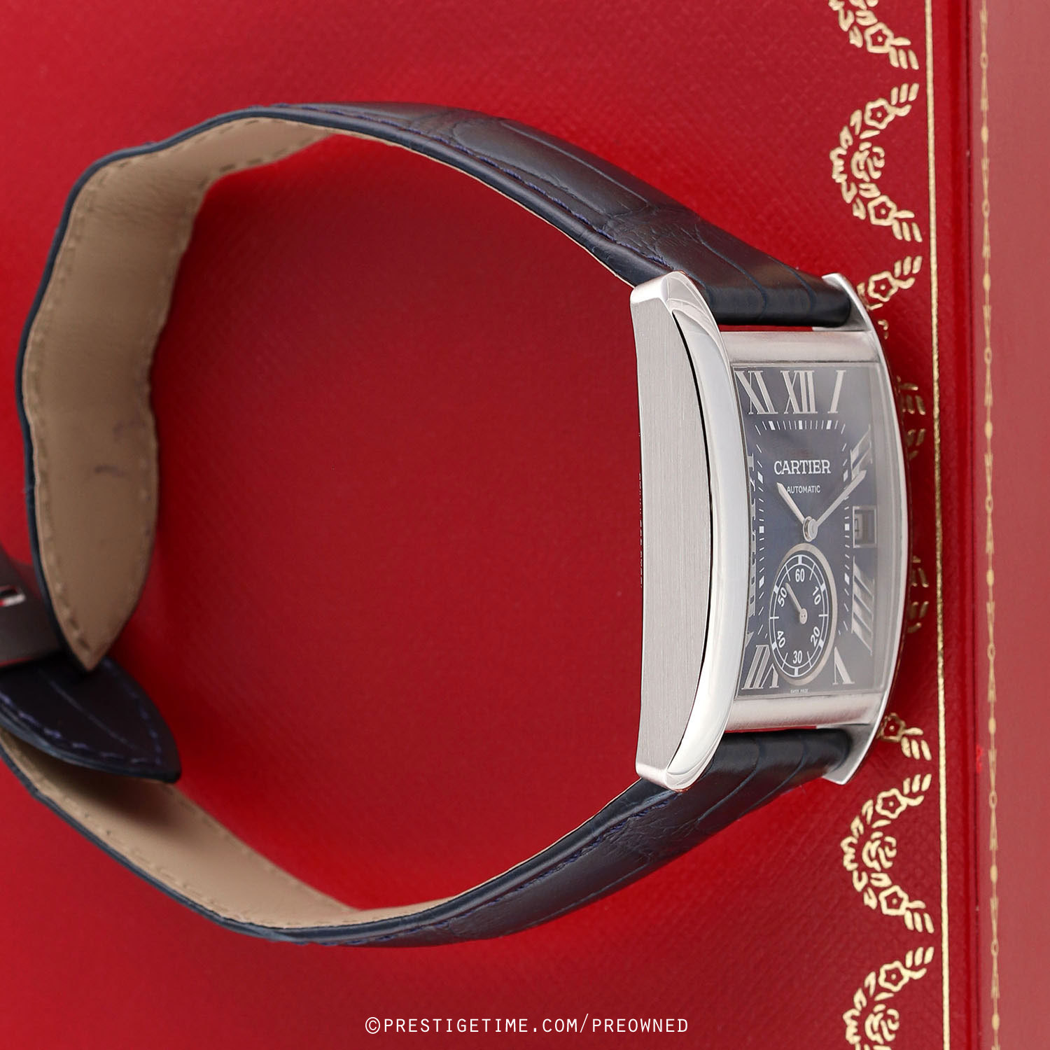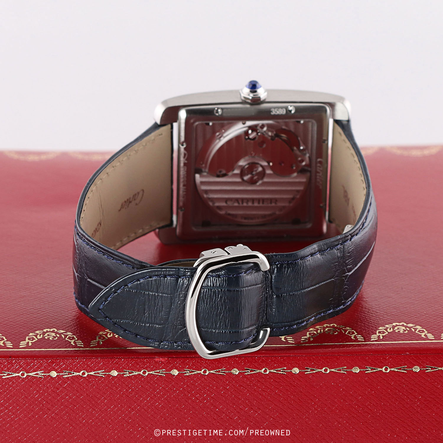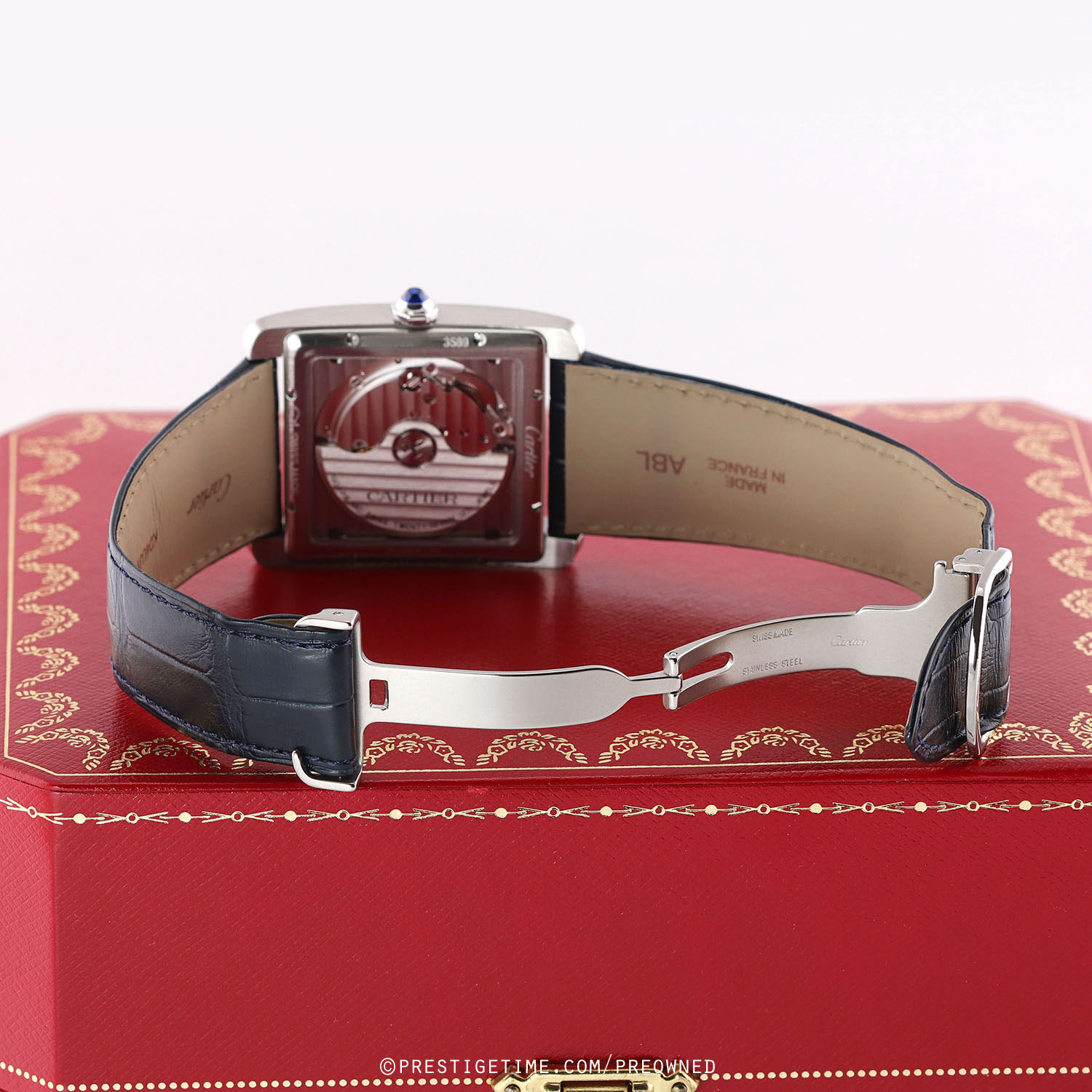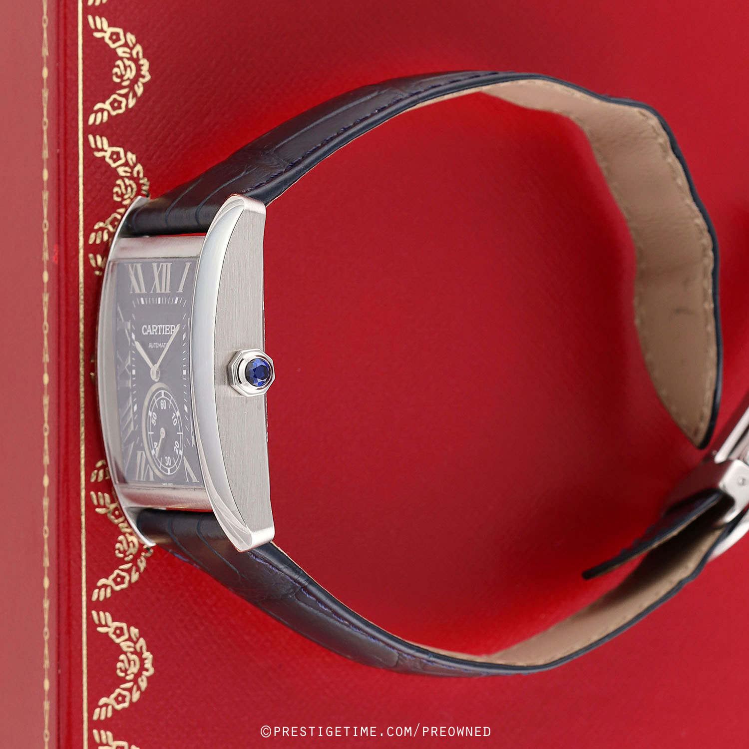 Strap: Fitted on a Cartier original blue alligator leather strap with a stainless steel folding buckle. The strap is in excellent near-new condition with the majority of its wear lifespan remaining. We would rate the strap as in 95% condition.