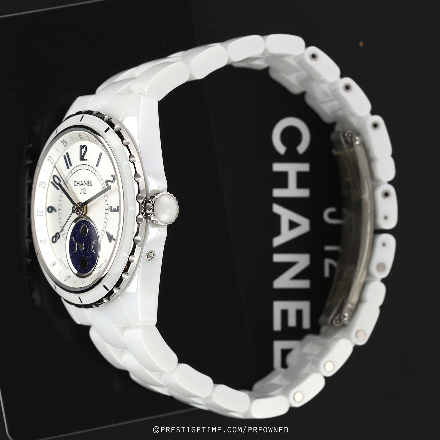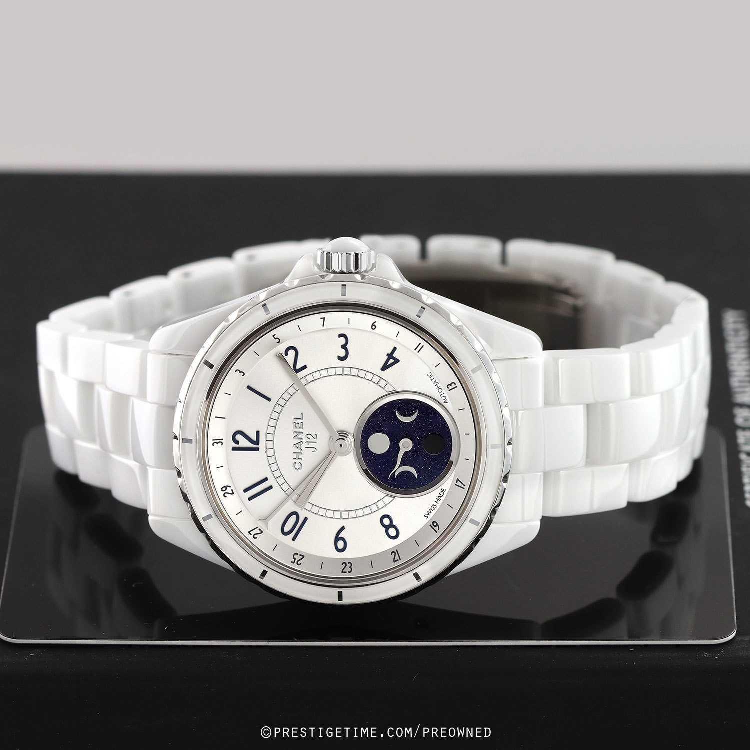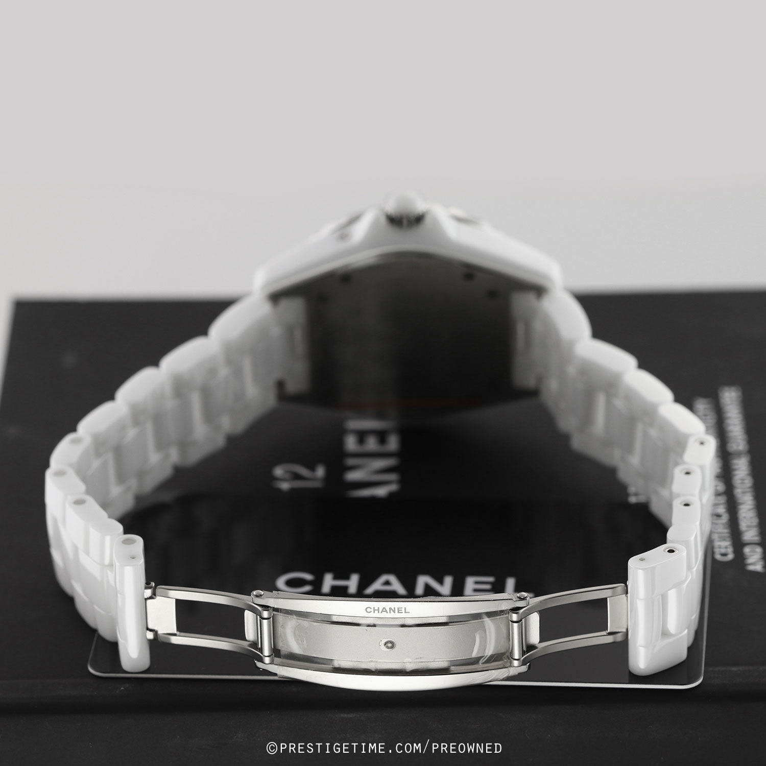 Case: White ceramic case. Polished stainless steel bezel with white ceramic inlay & polished finished 5 minute scale. Matte opaline silver-white dial. Polished hands. Applied dark blue numeral hour markers. Fine printed minutes track.