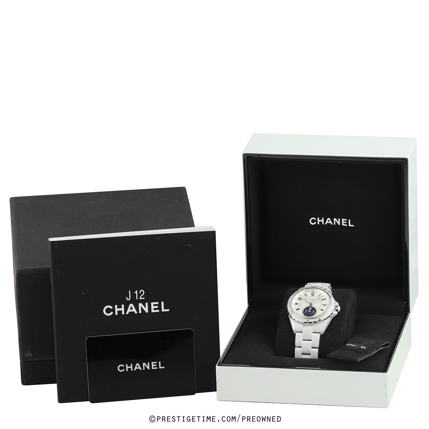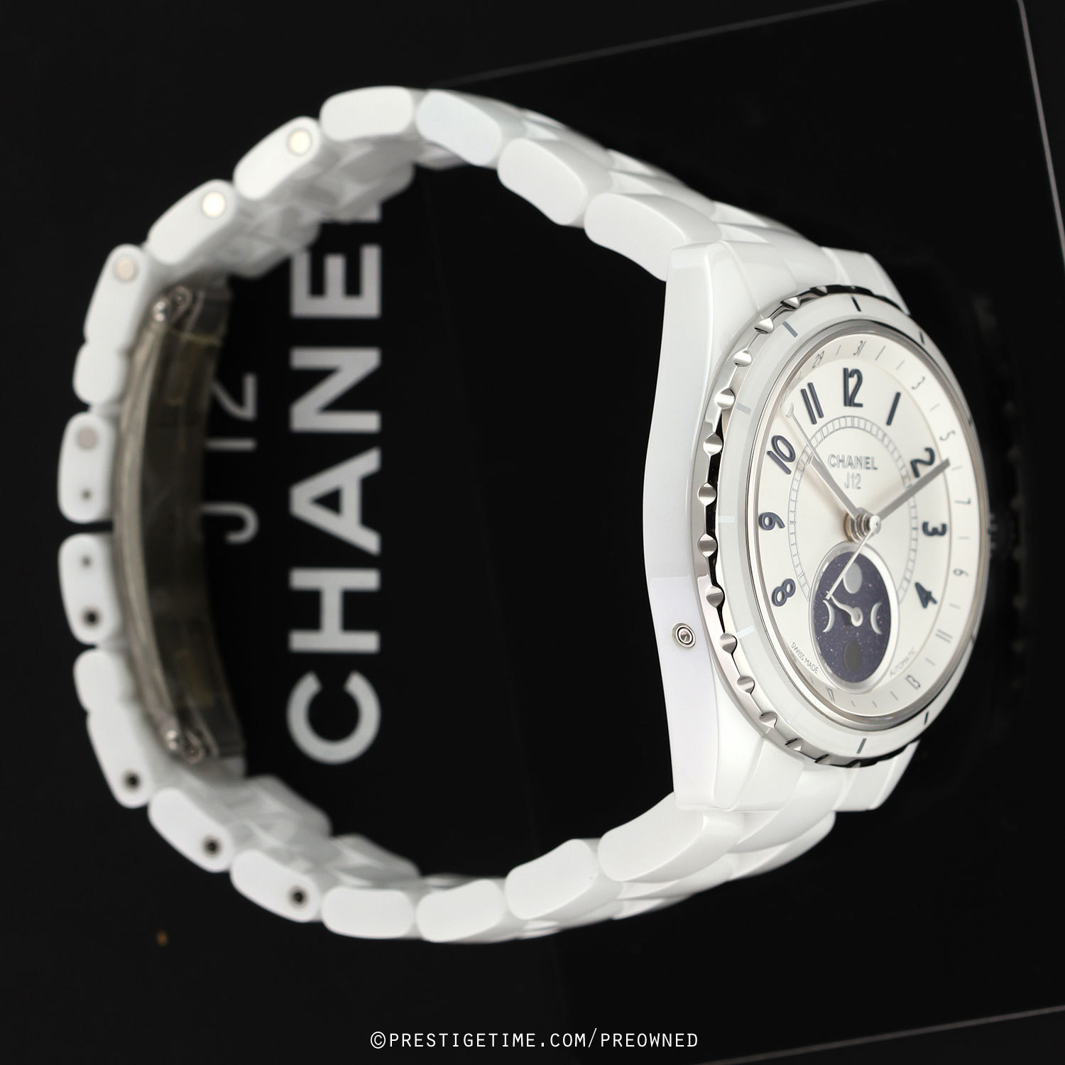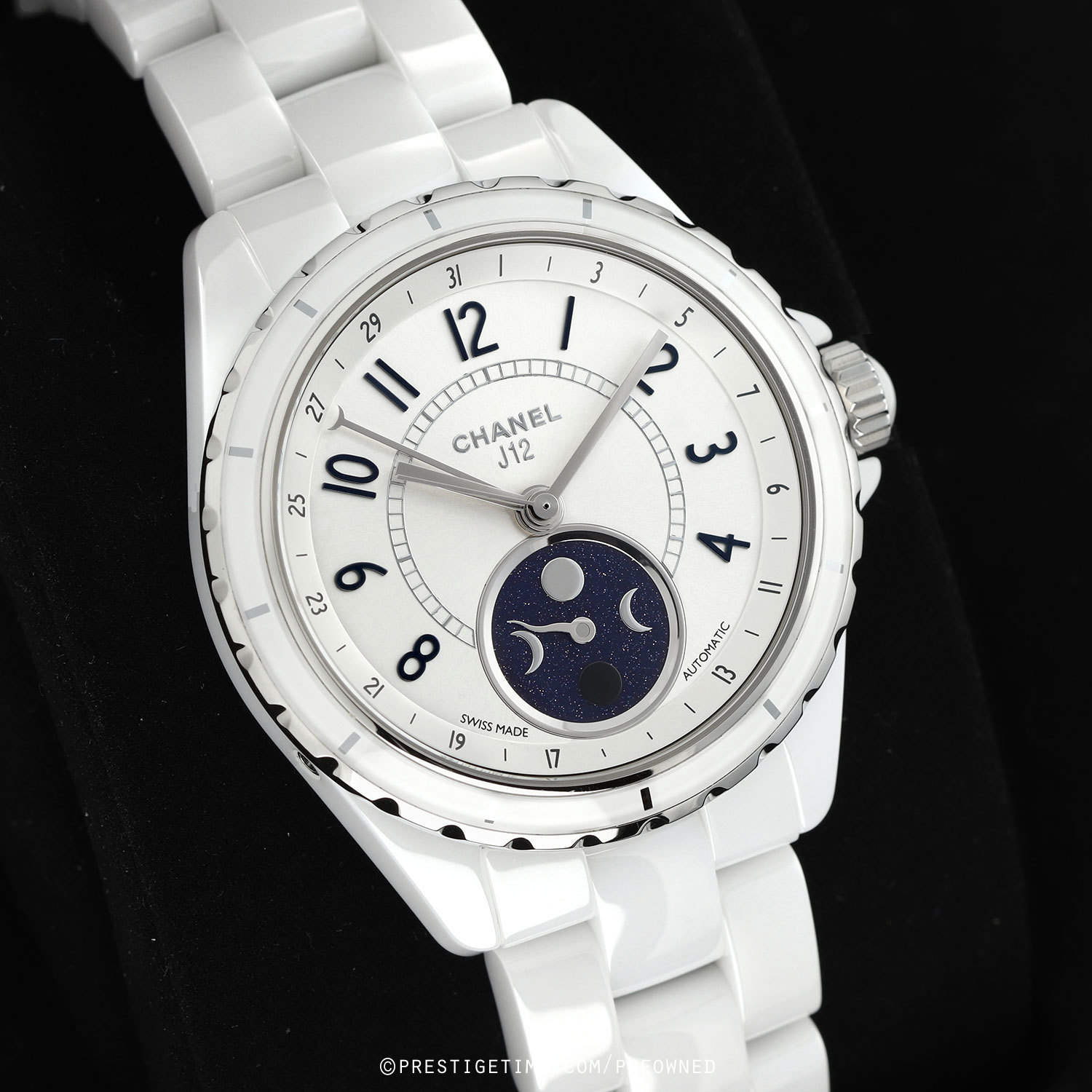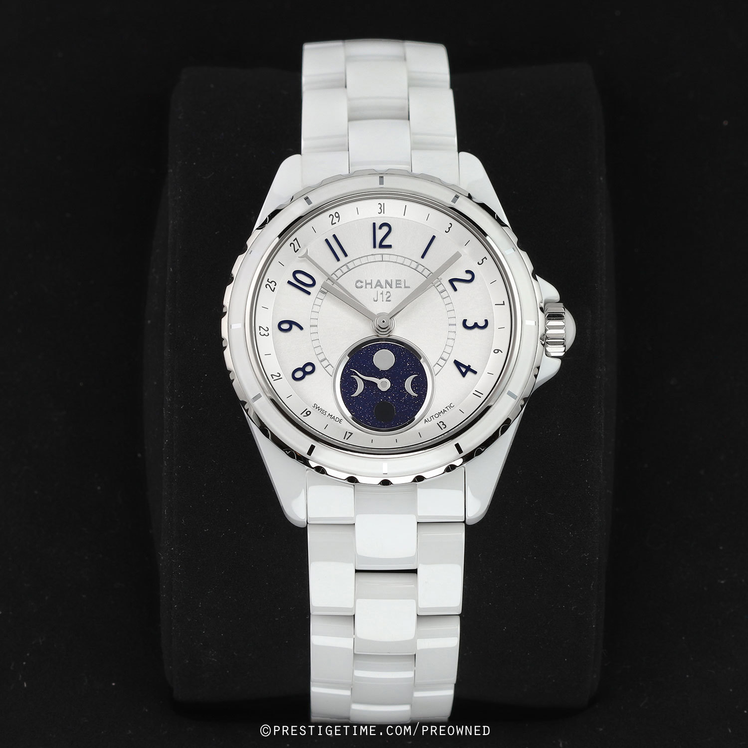 Case: White ceramic case. Polished stainless steel bezel with white ceramic inlay & polished finished 5 minute scale. Matte opaline silver-white dial. Polished hands. Applied dark blue numeral hour markers. Fine printed minutes track.