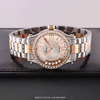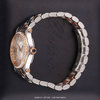 Case: Polished stainless steel & 18kt rose gold case. Crown set with a single single sapphire cabochon weighing 0.17 carats. Silver dial with a spiral patterned guilloche center. Polished rose gold hands. Applied polished rose gold hour markers. Fine printed minutes/seconds track.