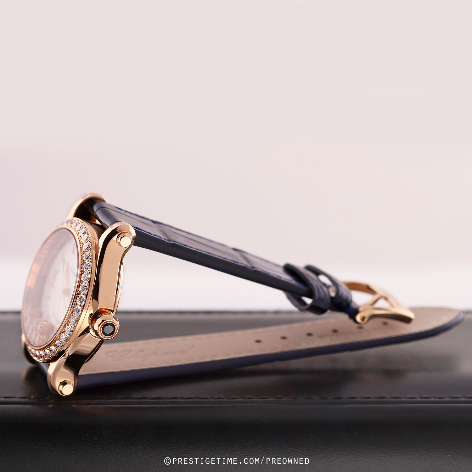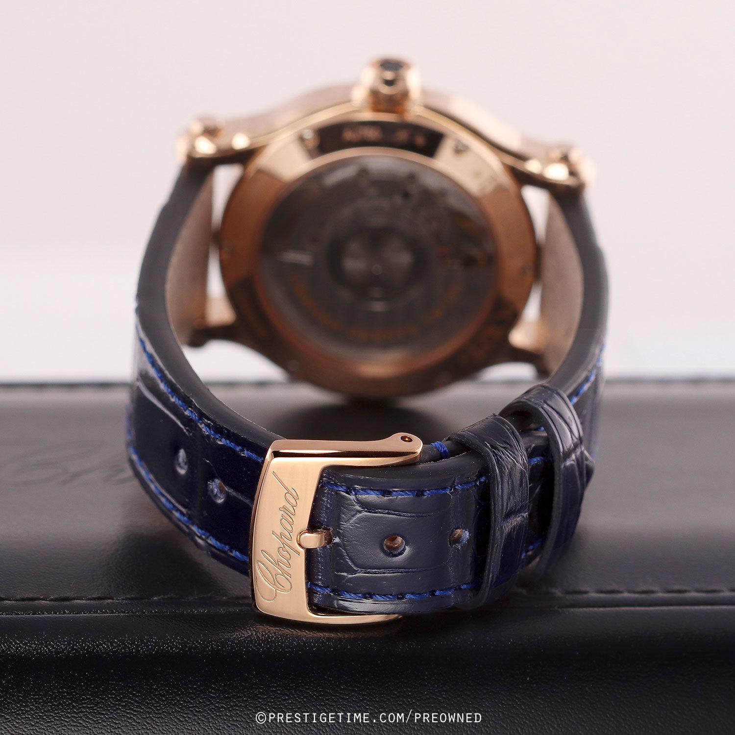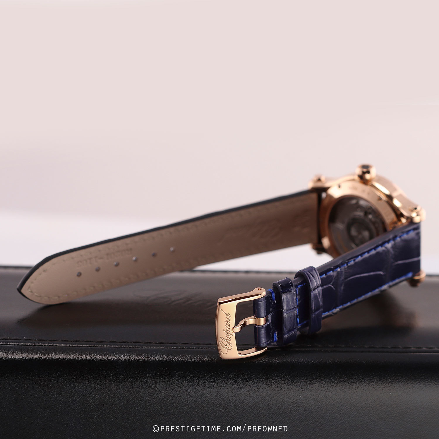 Strap: Fitted on a brand new & unworn Chopard original dark blue alligator leather strap with a polished 18kt rose gold tang buckle.