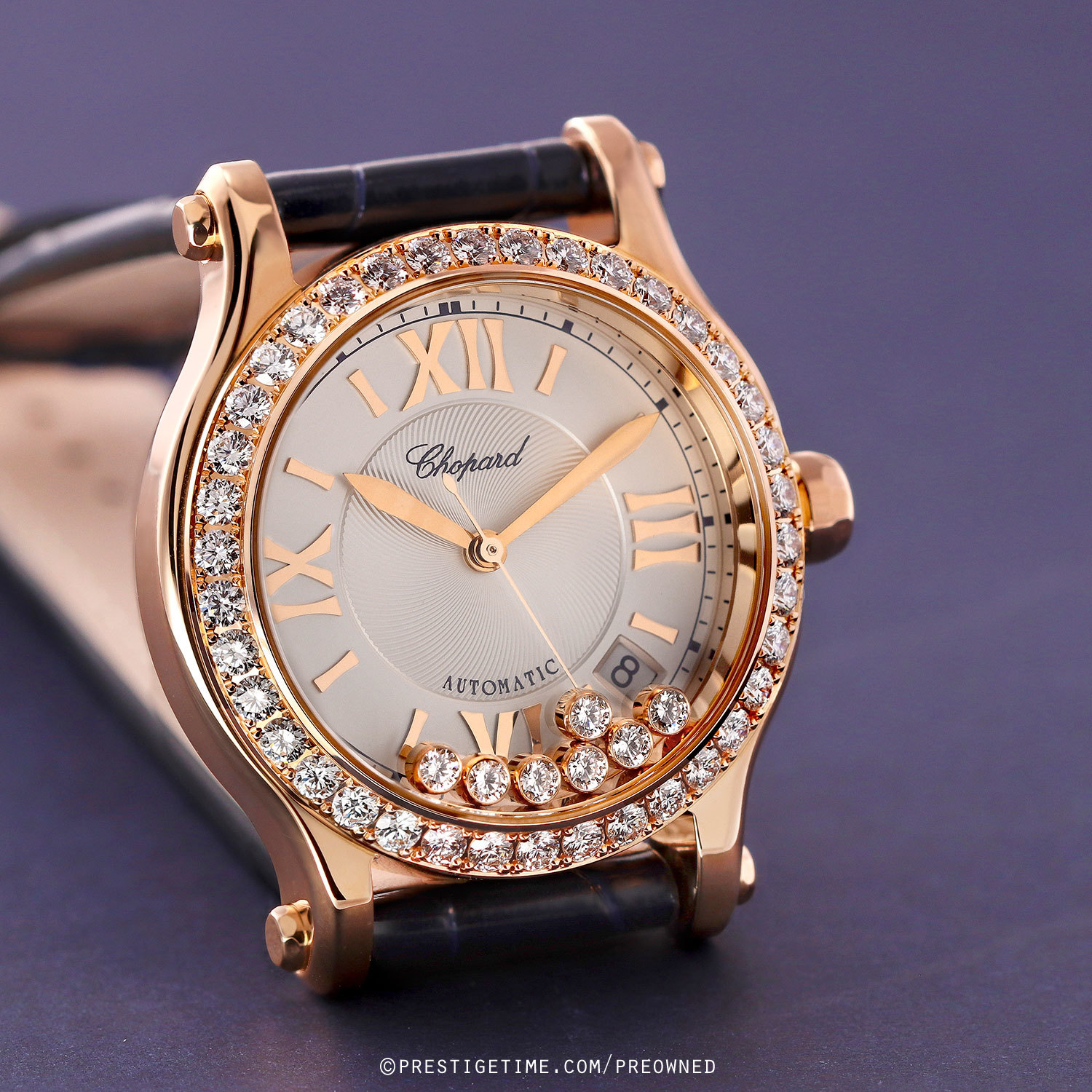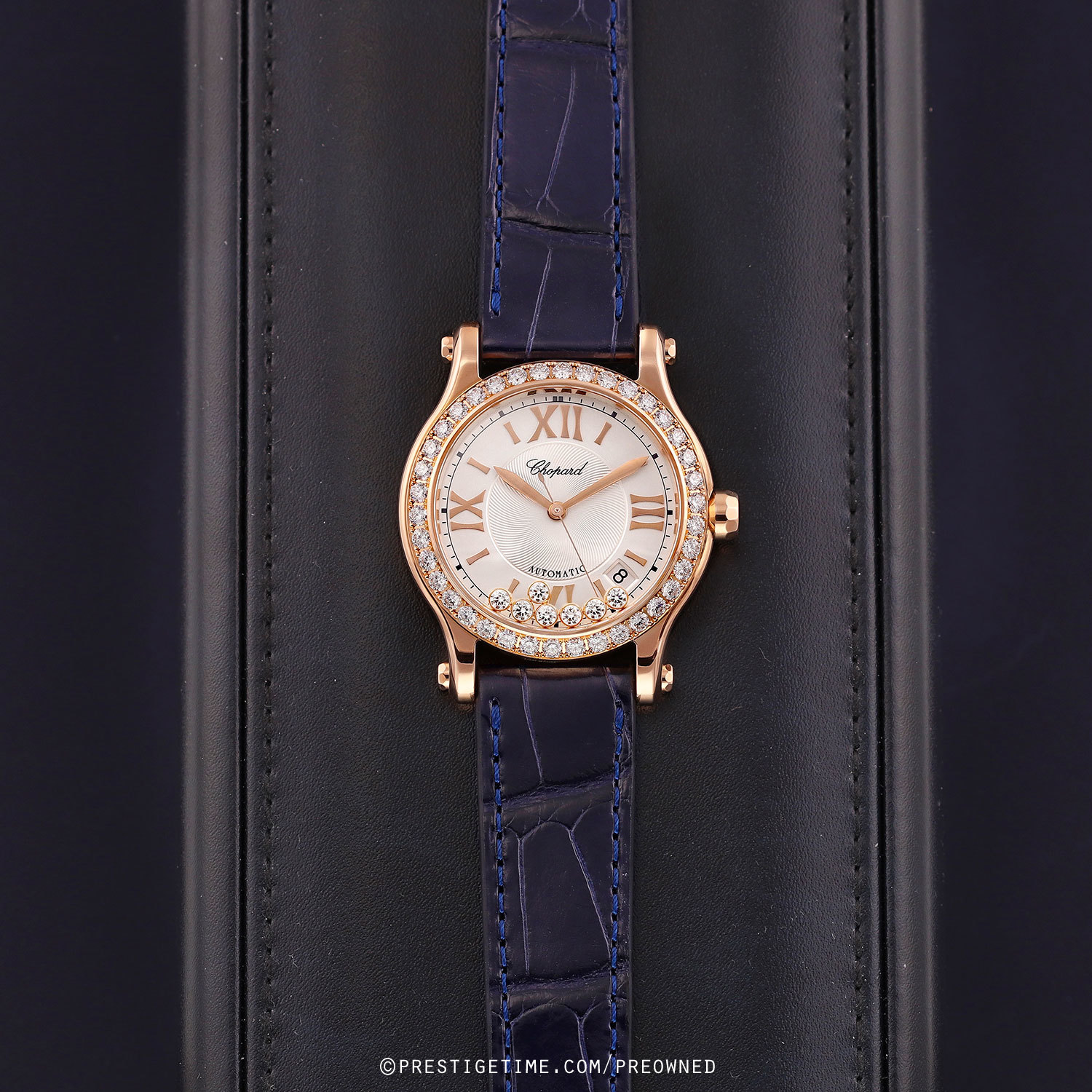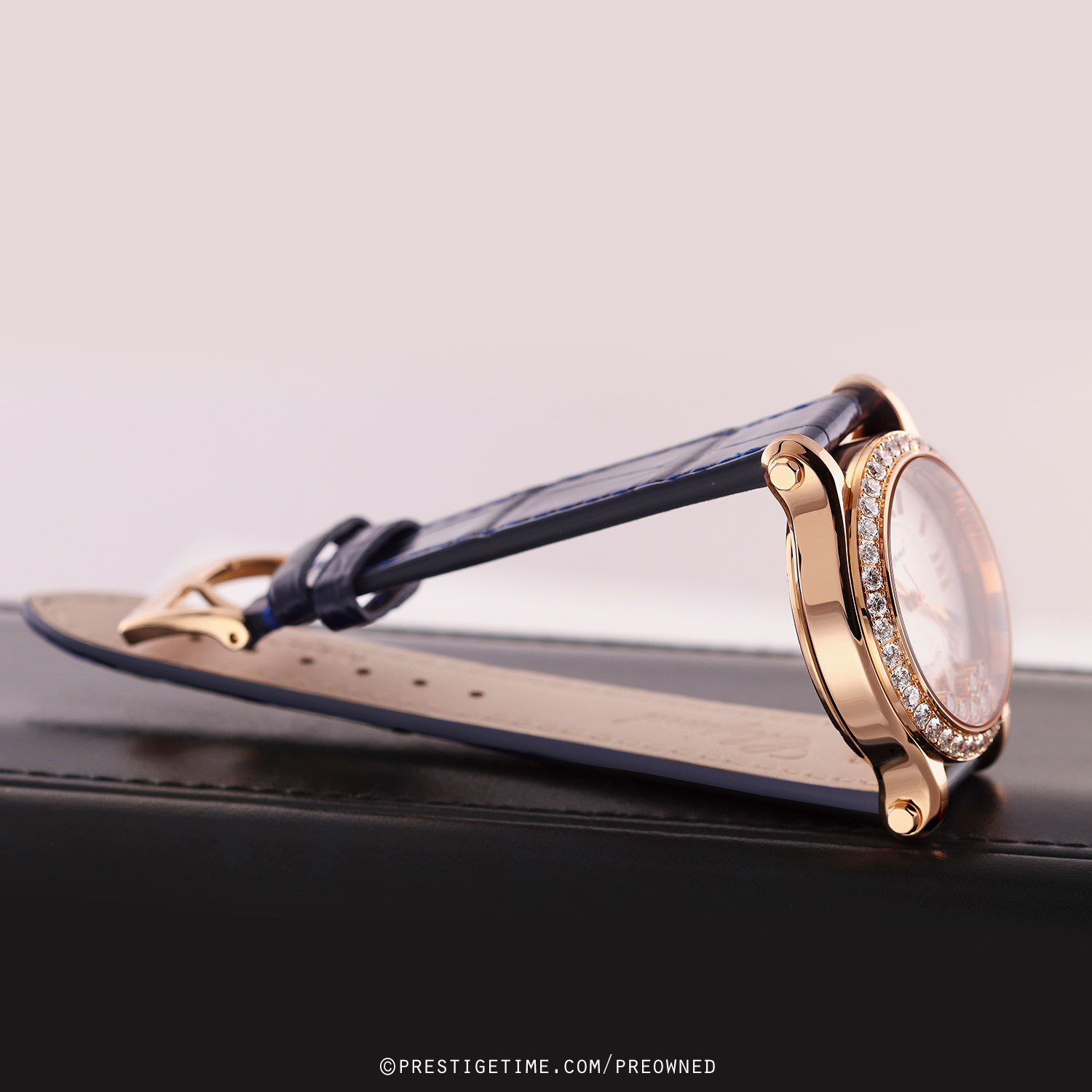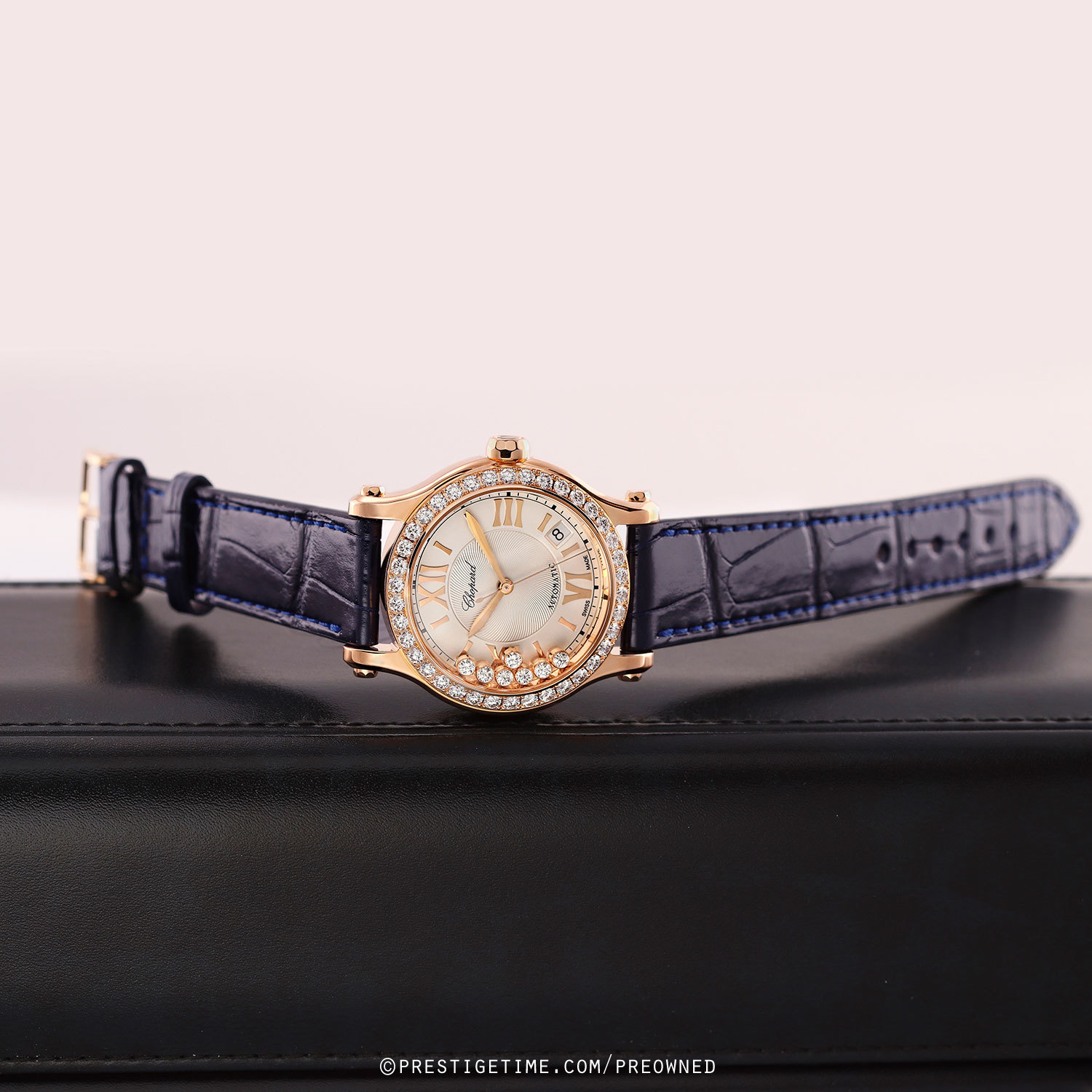 Strap: Fitted on a brand new & unworn Chopard original dark blue alligator leather strap with a polished 18kt rose gold tang buckle.