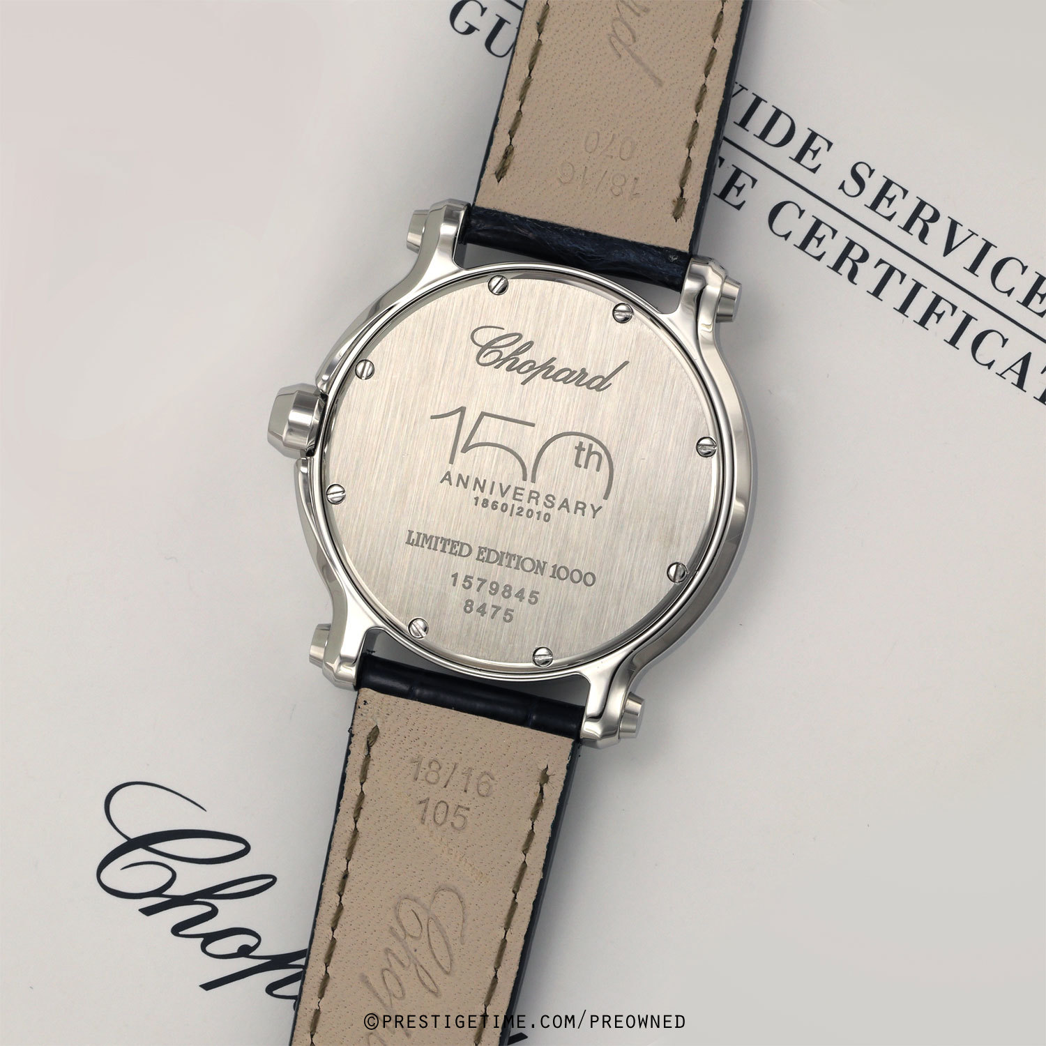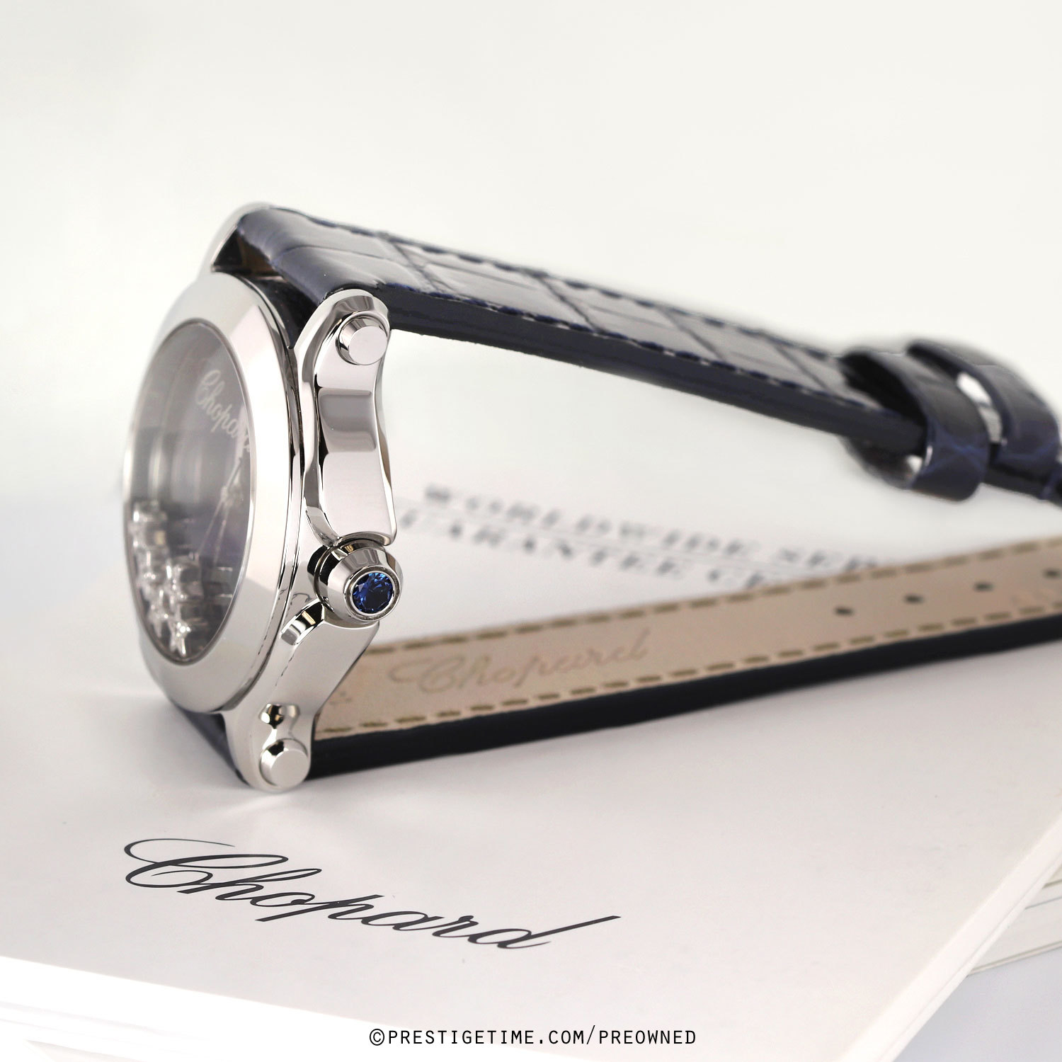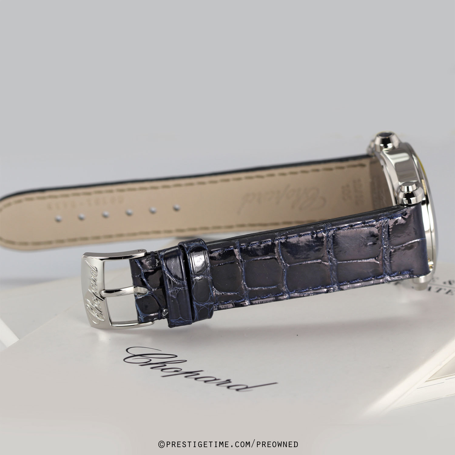 Condition: This watch came into us in 95% condition, with very very light signs of wear & it was fitted on a delicate satin strap. We had the watch lightly biffed to remove mist signs of wear & fitted on a brand new gorgeous blue OEM Chopard alligator strap. The watch is now in near perfect condition, we can comfortably categorize this as in 98% condition.