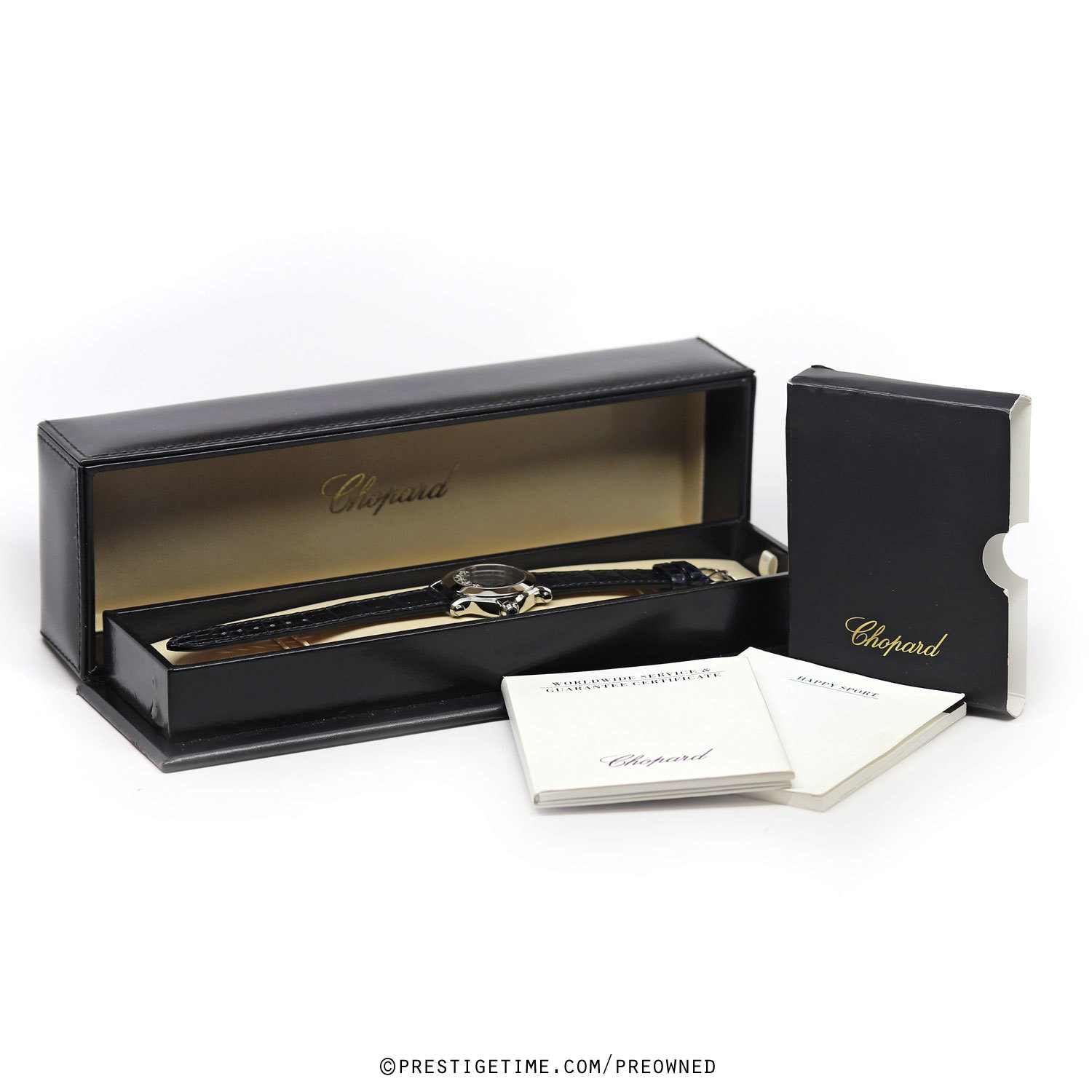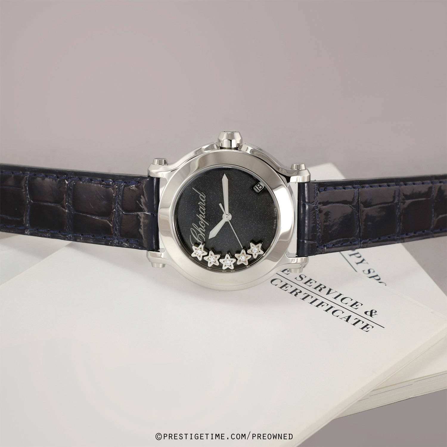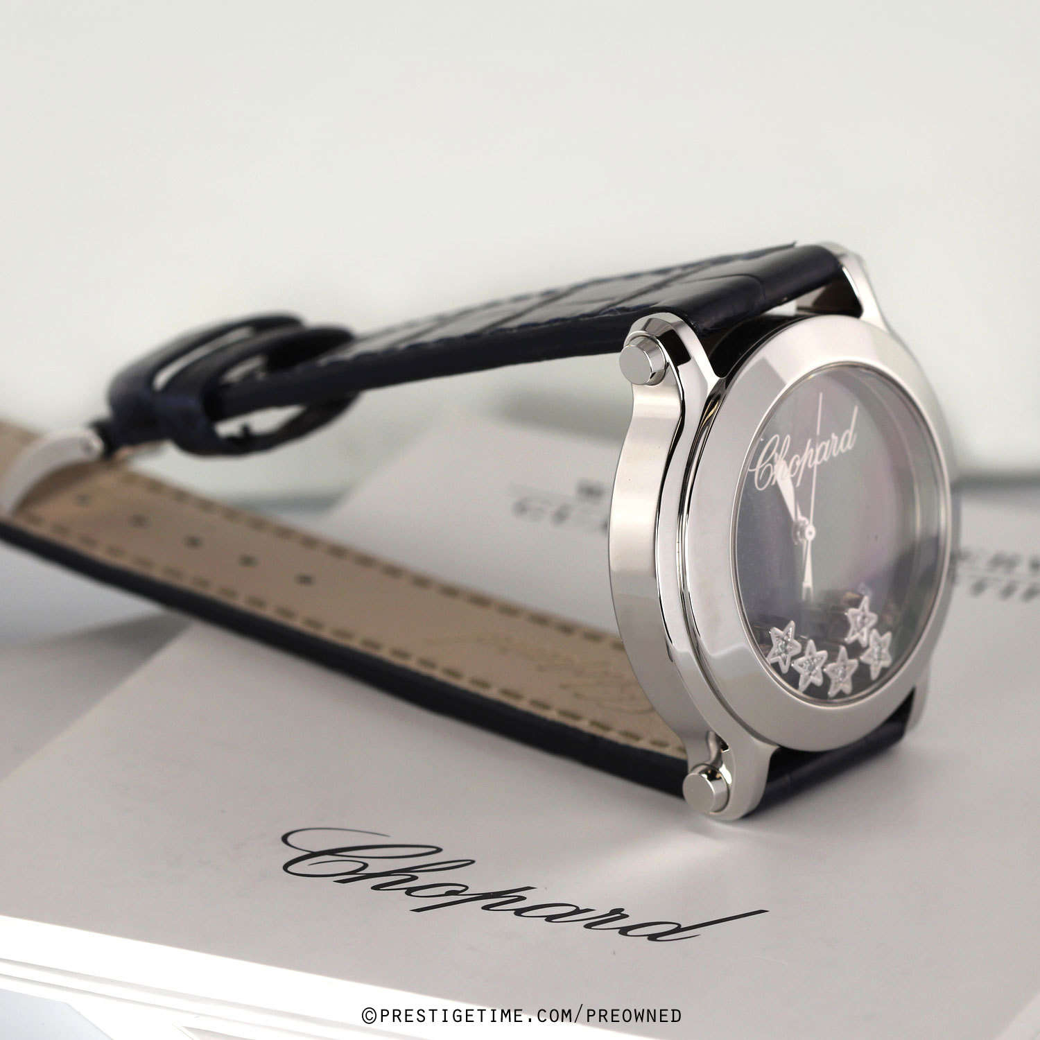 Condition: This watch came into us in 95% condition, with very very light signs of wear & it was fitted on a delicate satin strap. We had the watch lightly biffed to remove mist signs of wear & fitted on a brand new gorgeous blue OEM Chopard alligator strap. The watch is now in near perfect condition, we can comfortably categorize this as in 98% condition.