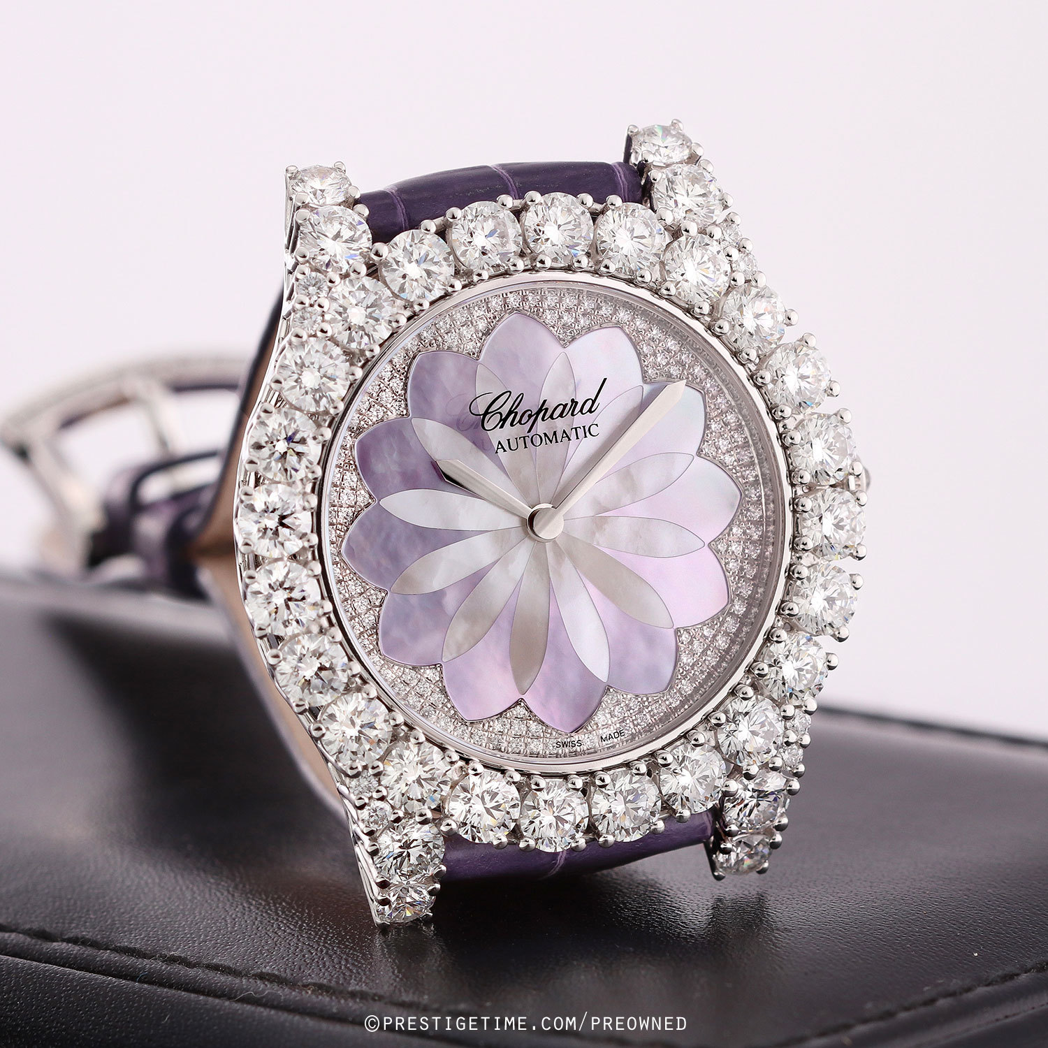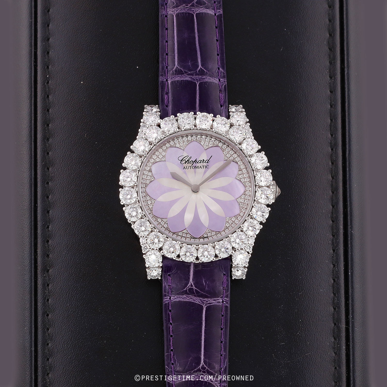 Case: Polished 18kt white gold case. Natural purple & white mother of pearl dial with a petalled flower pattern.