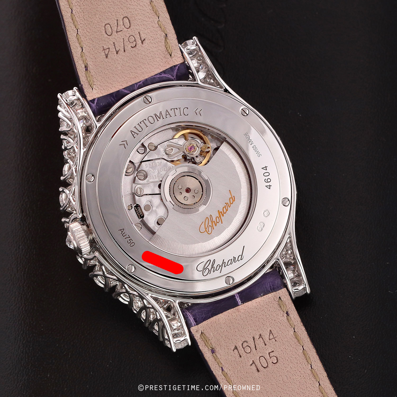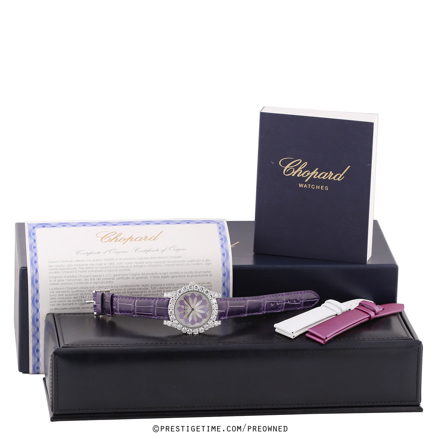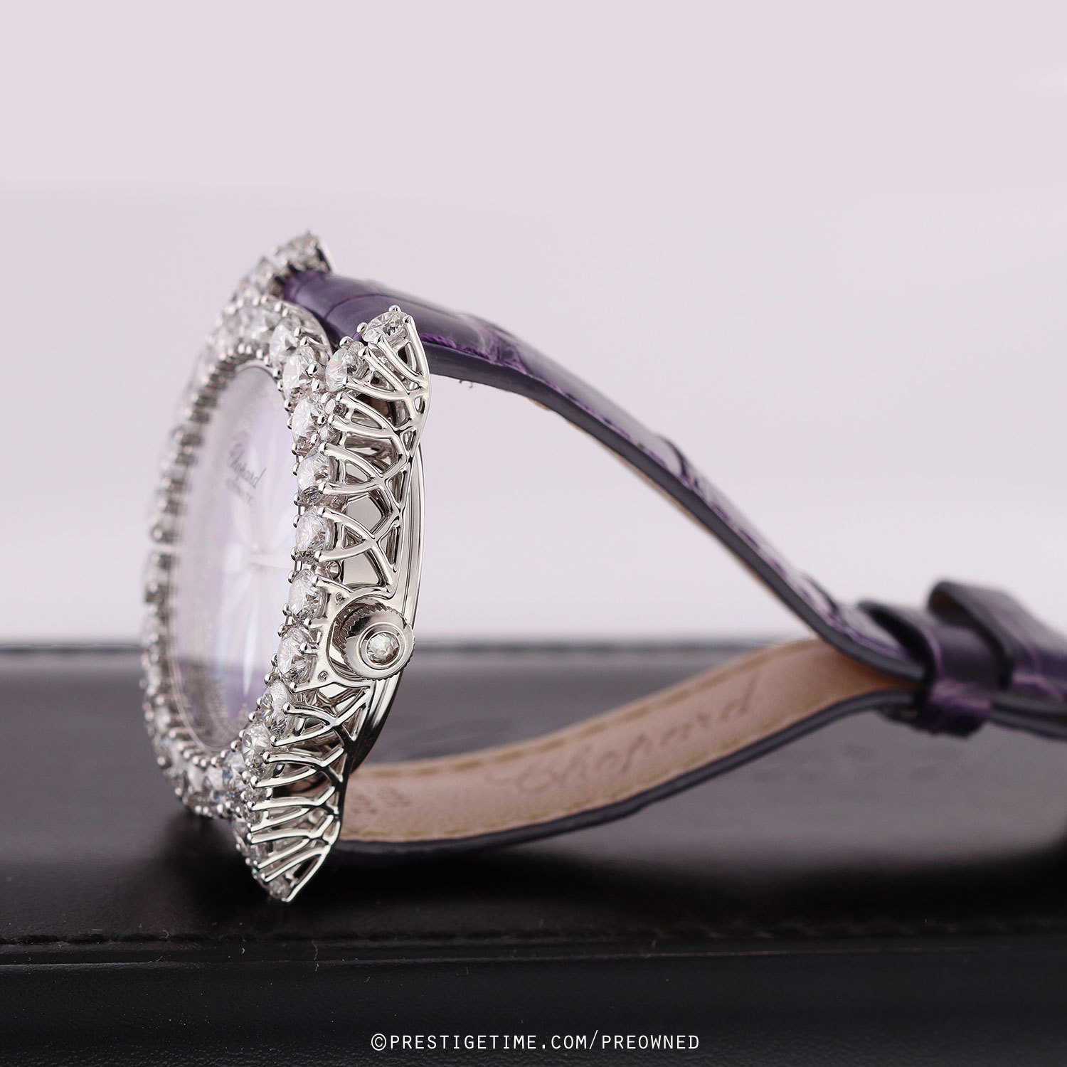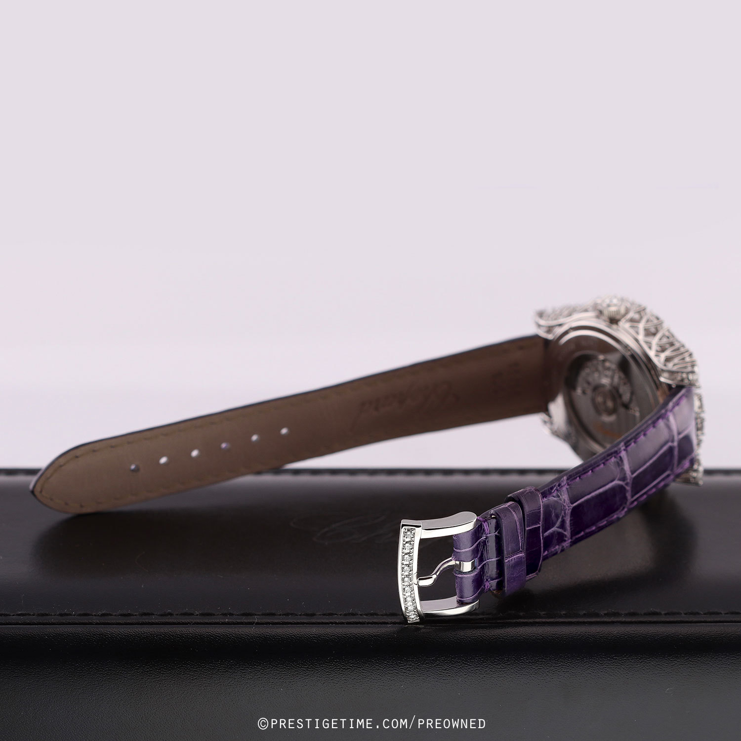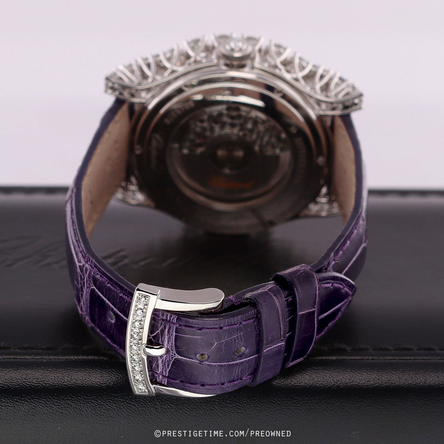 - Fitted on its original Chopard purple alligator leather strap with a polished 18kt white gold tang buckle. This strap is in excellent, near new condition with its full wear lifespan remaining. We would be comfortable rating the strap as in 98%+ condition.