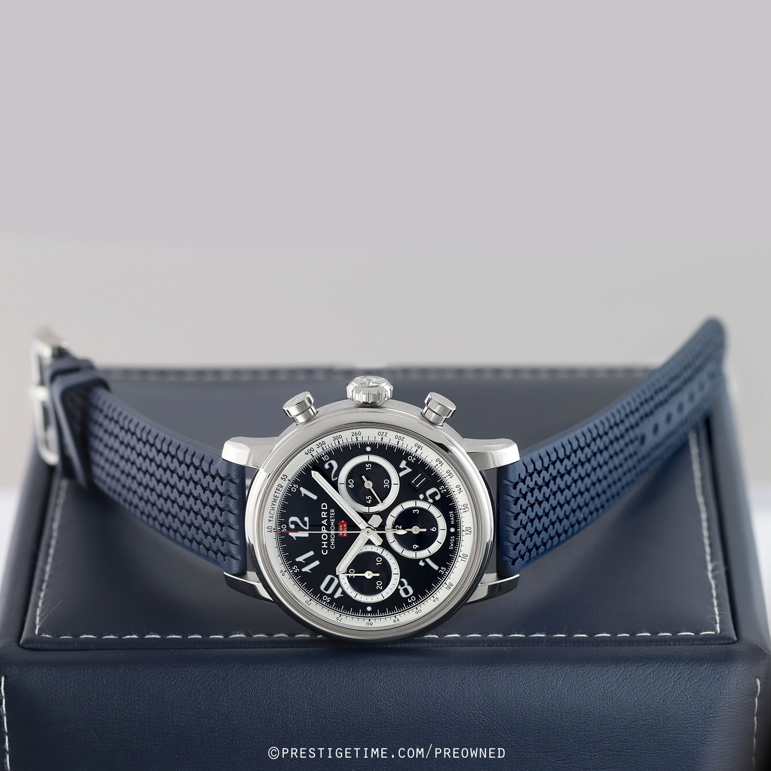 Strap: Fitted on its original Chopard dark blue rubber tire-tread style strap with a stainless steel tang buckle. The strap is in excellent near new condition with its full wear lifespan remaining. We would grade this trap in 98%+ condition.