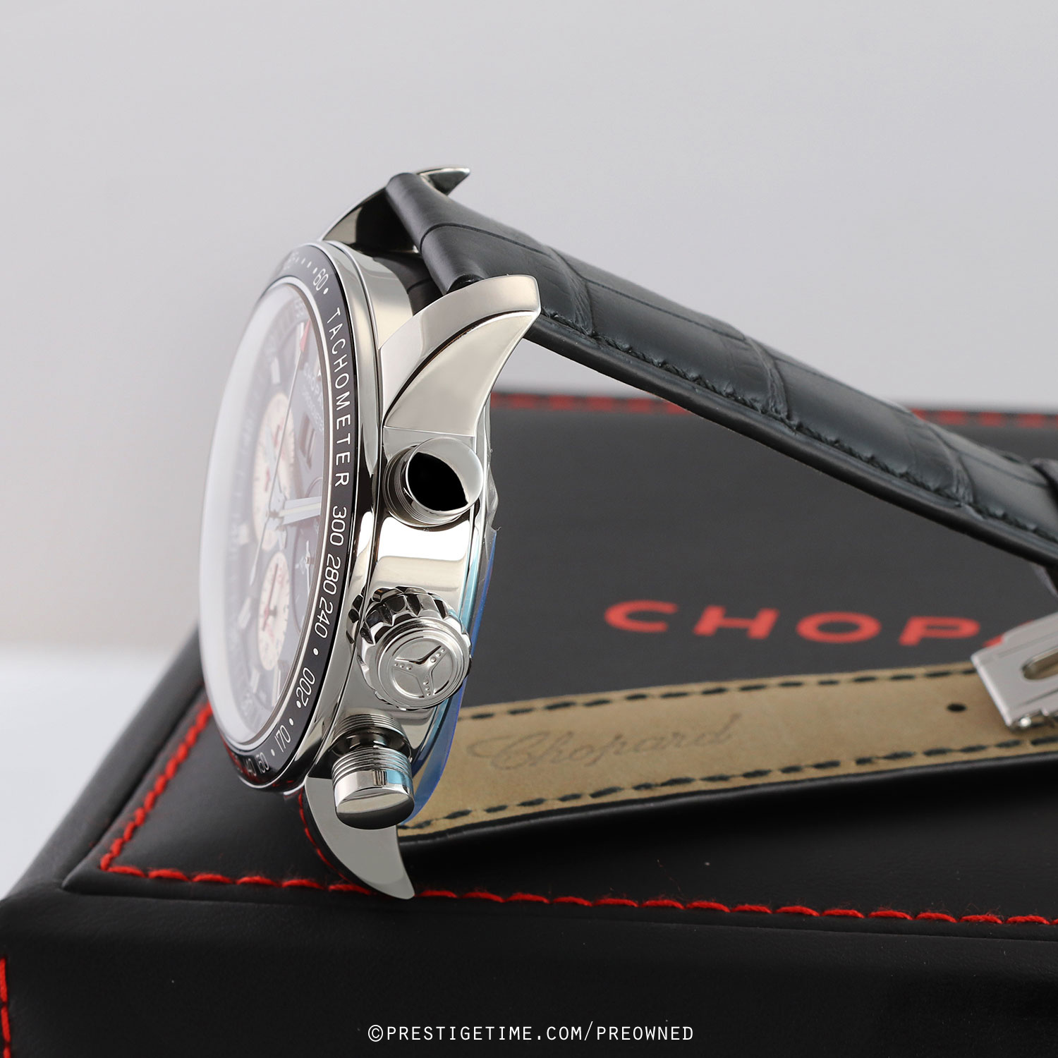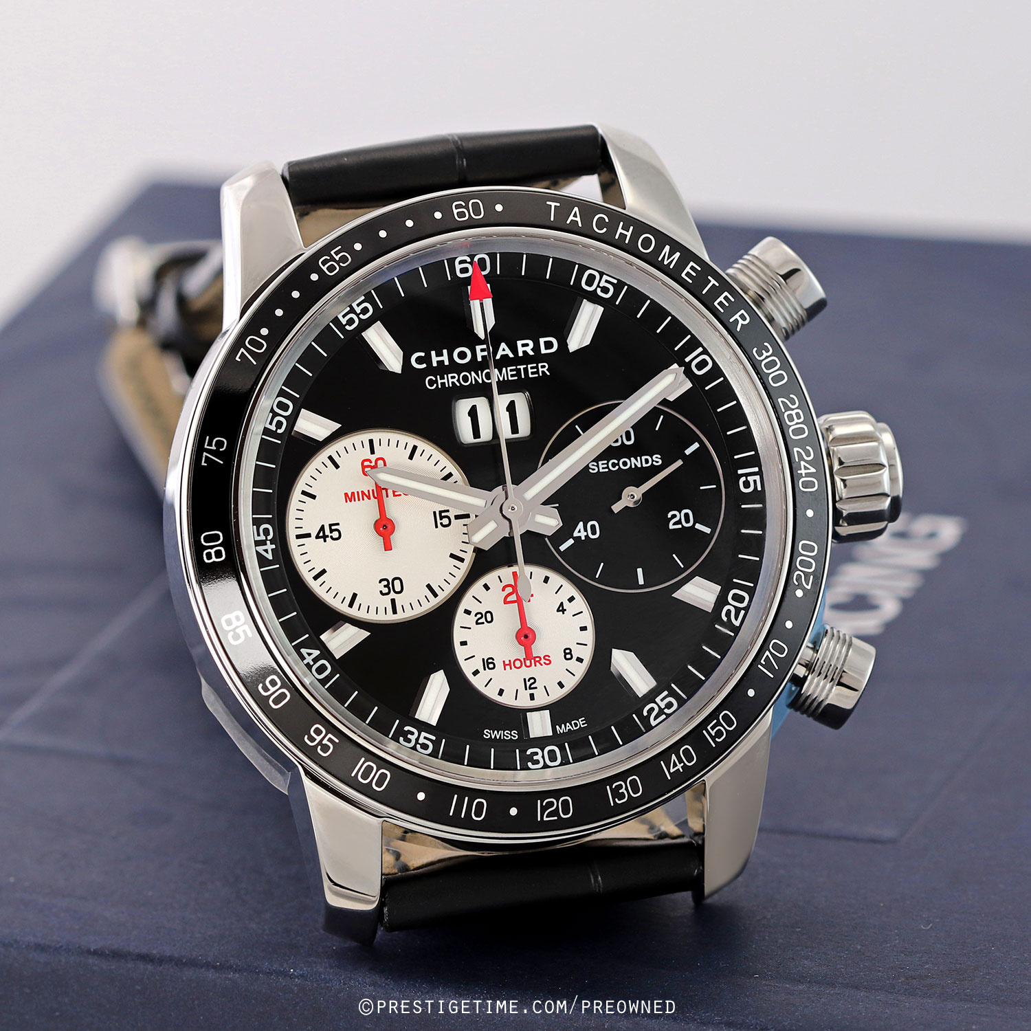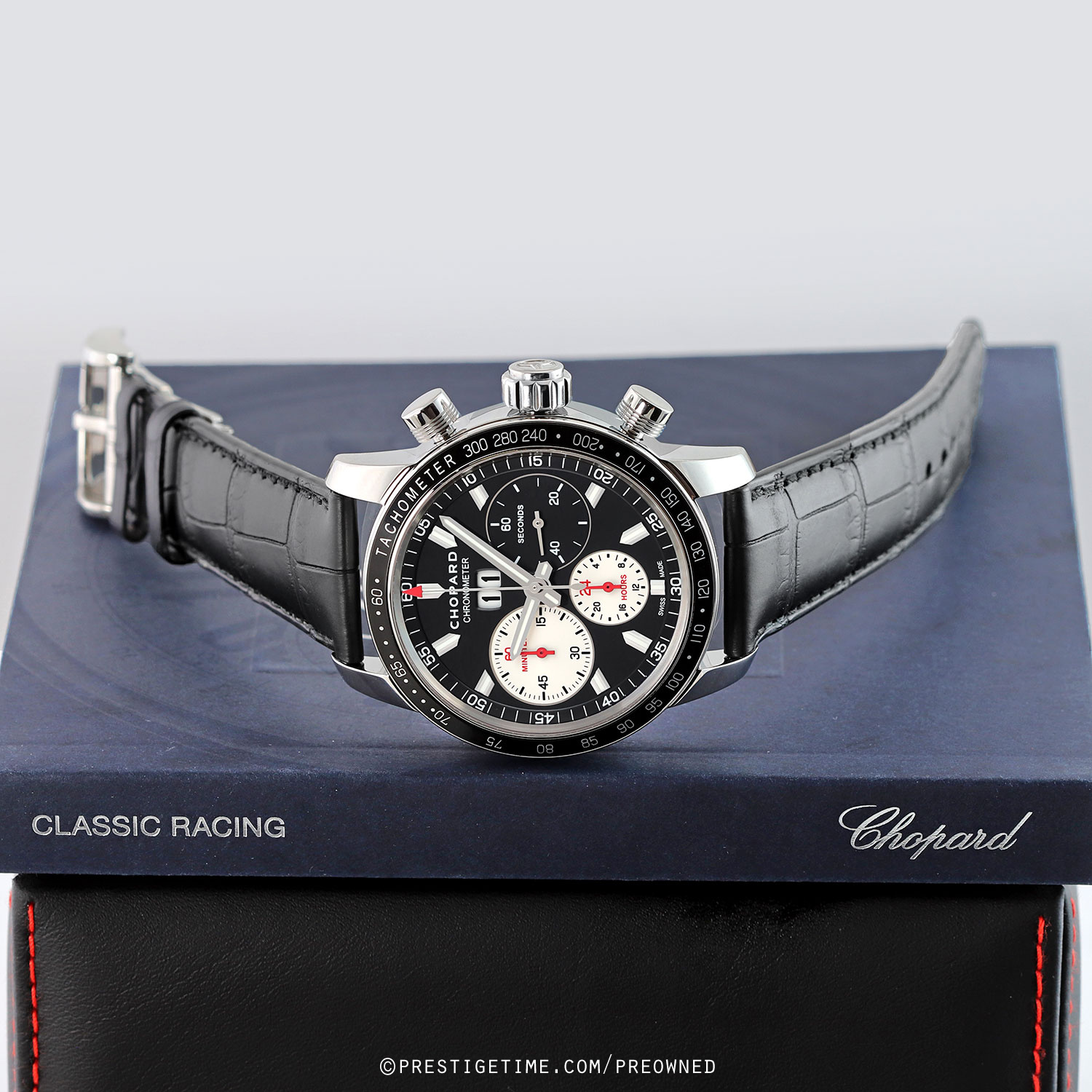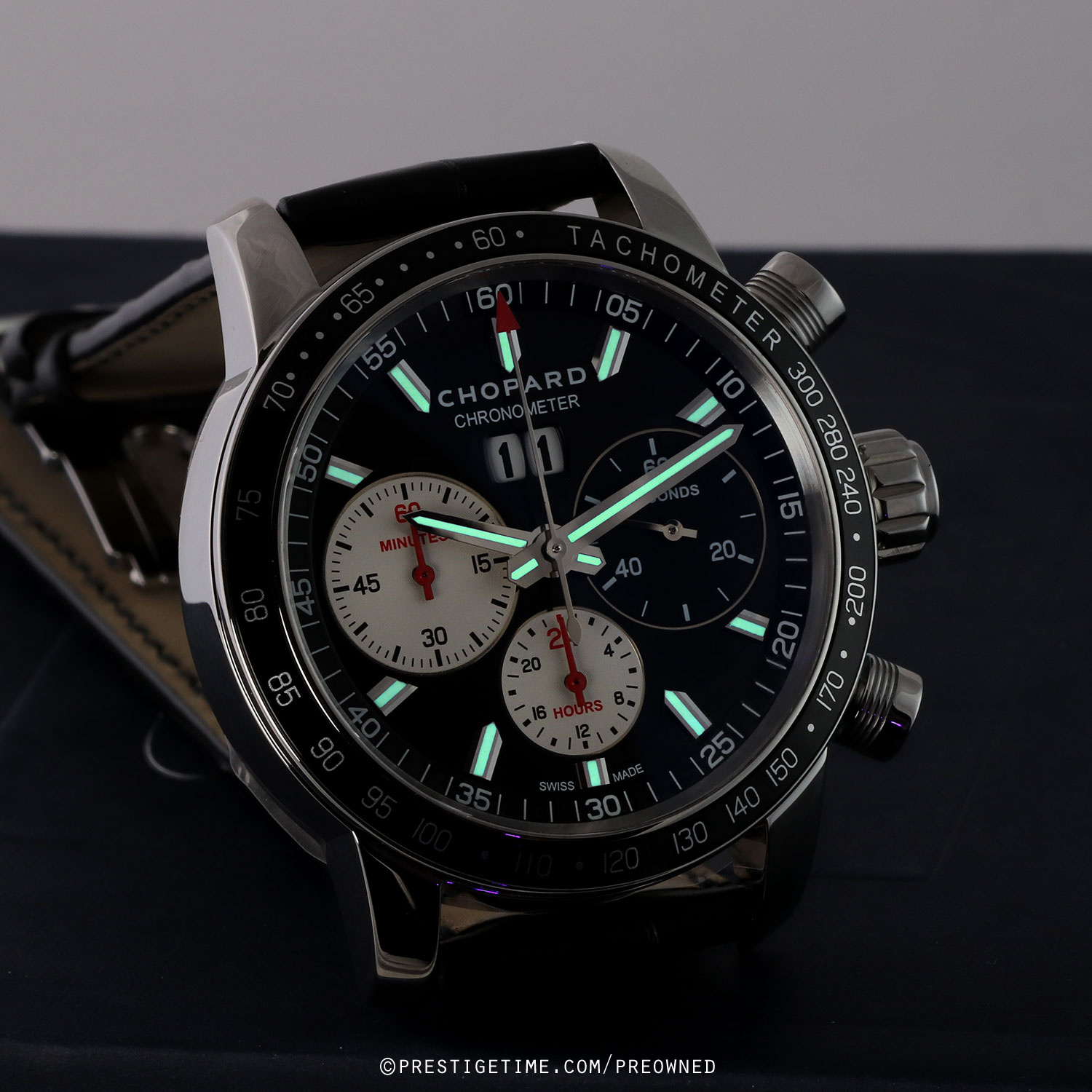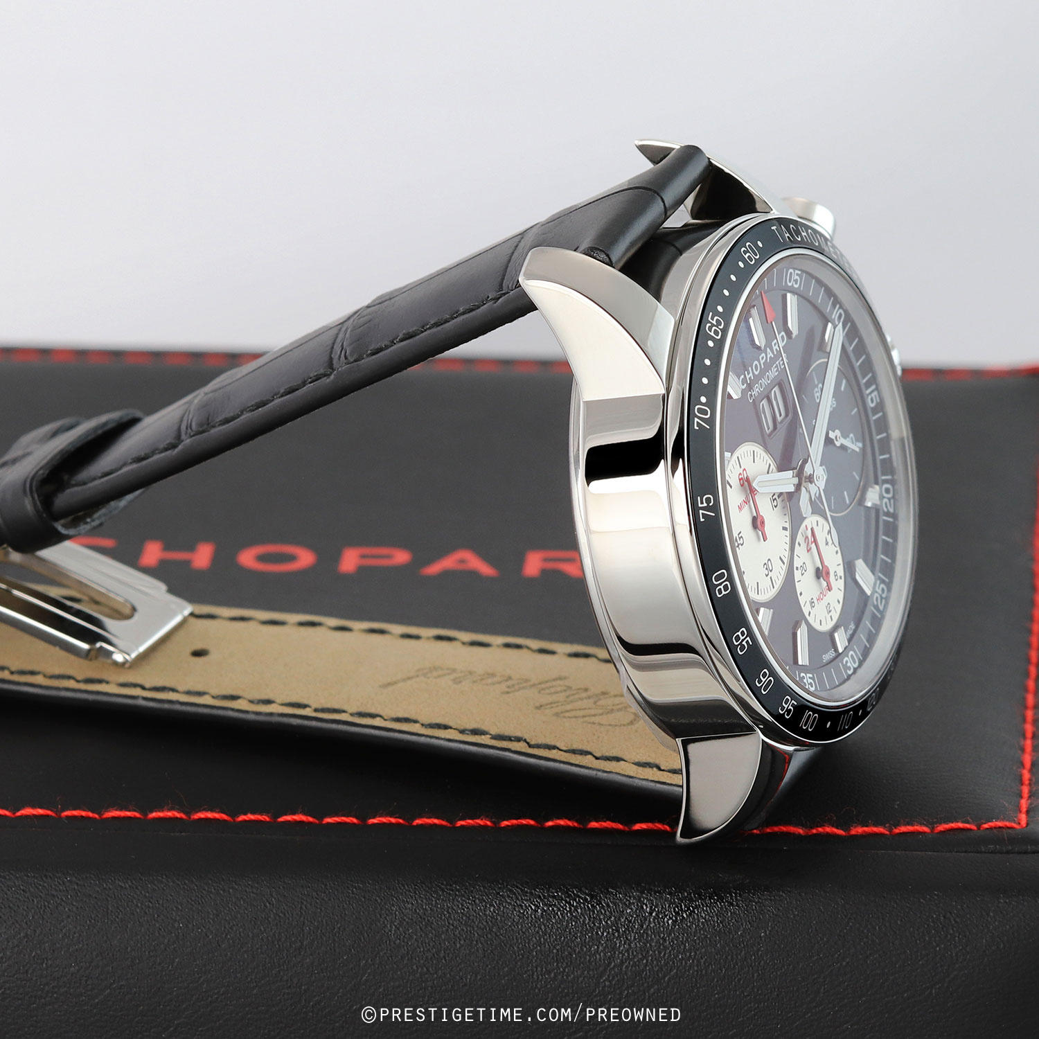 Strap: Fitted on its original Chopard black alligator leather strap with a stainless steel deployant buckle. The strap is unworn in new condition with its full wear lifespan remaining.