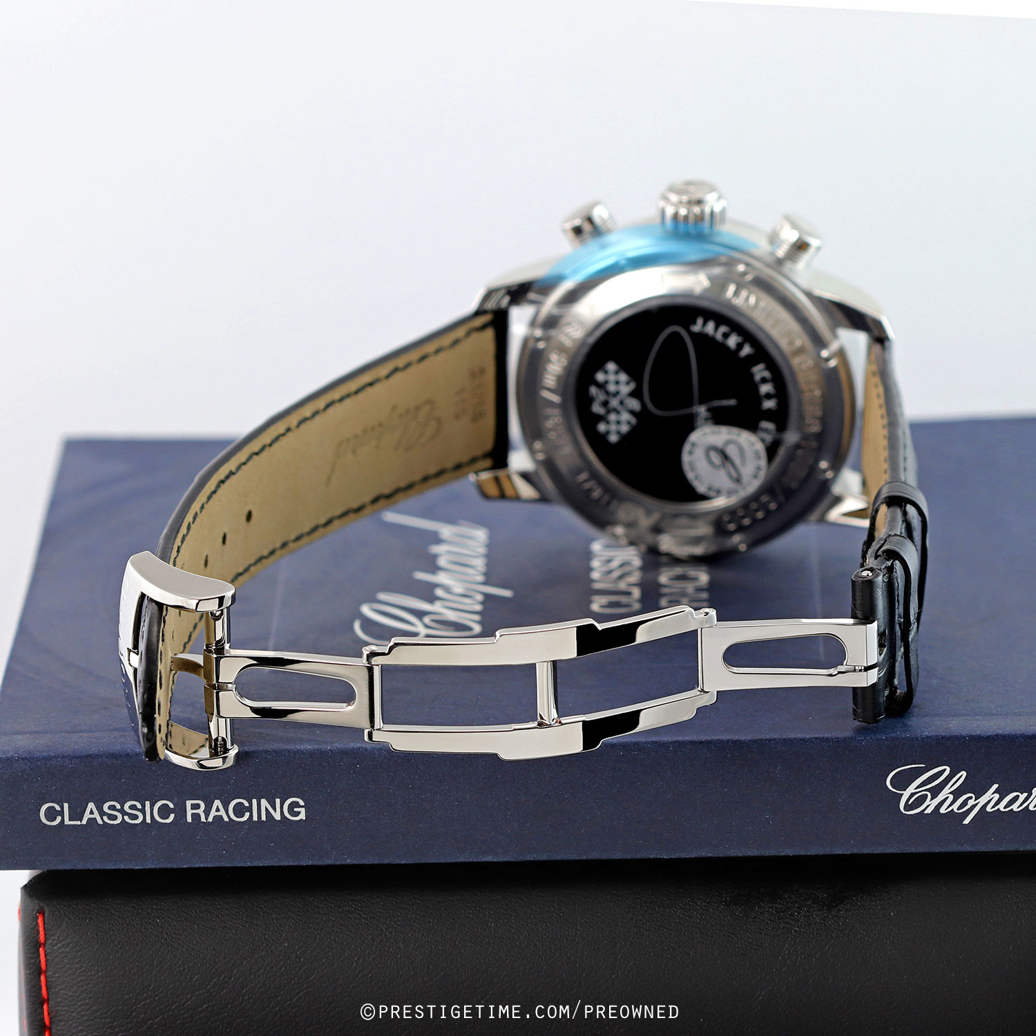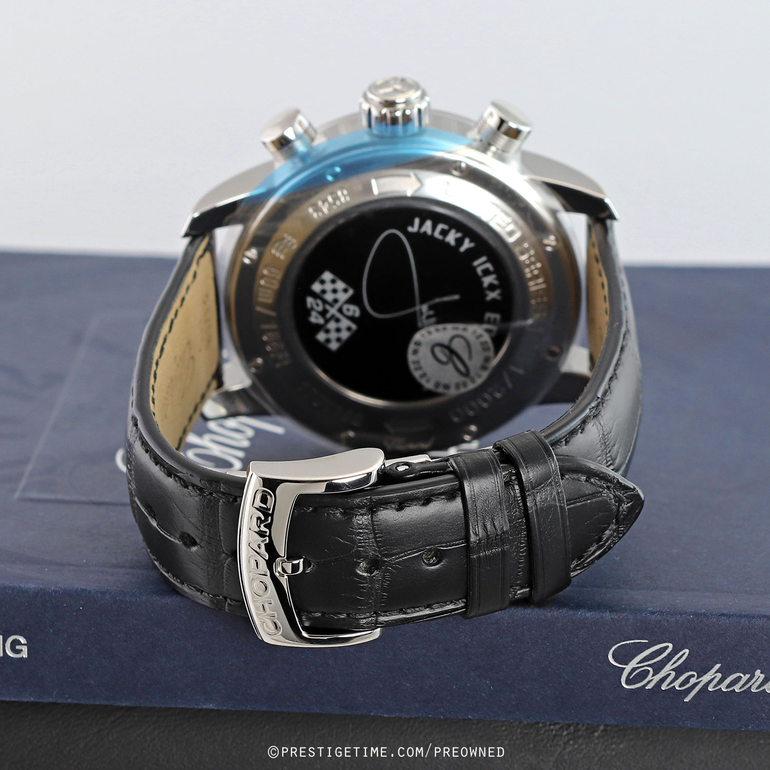 The Chopard Mille Miglia Jacky Ickx Edition V is a limited & numbered edition of 2000 pieces, created in tribute to Jacky Ickx’s legendary motorsport career and his record-setting six victories at the 24 Hours of Le Mans.! This special edition features a sapphire crystal case back with black underside printing, showcasing Jacky Ickx’s signature alongside the commemorative “6/24” motif framed by racing flags.