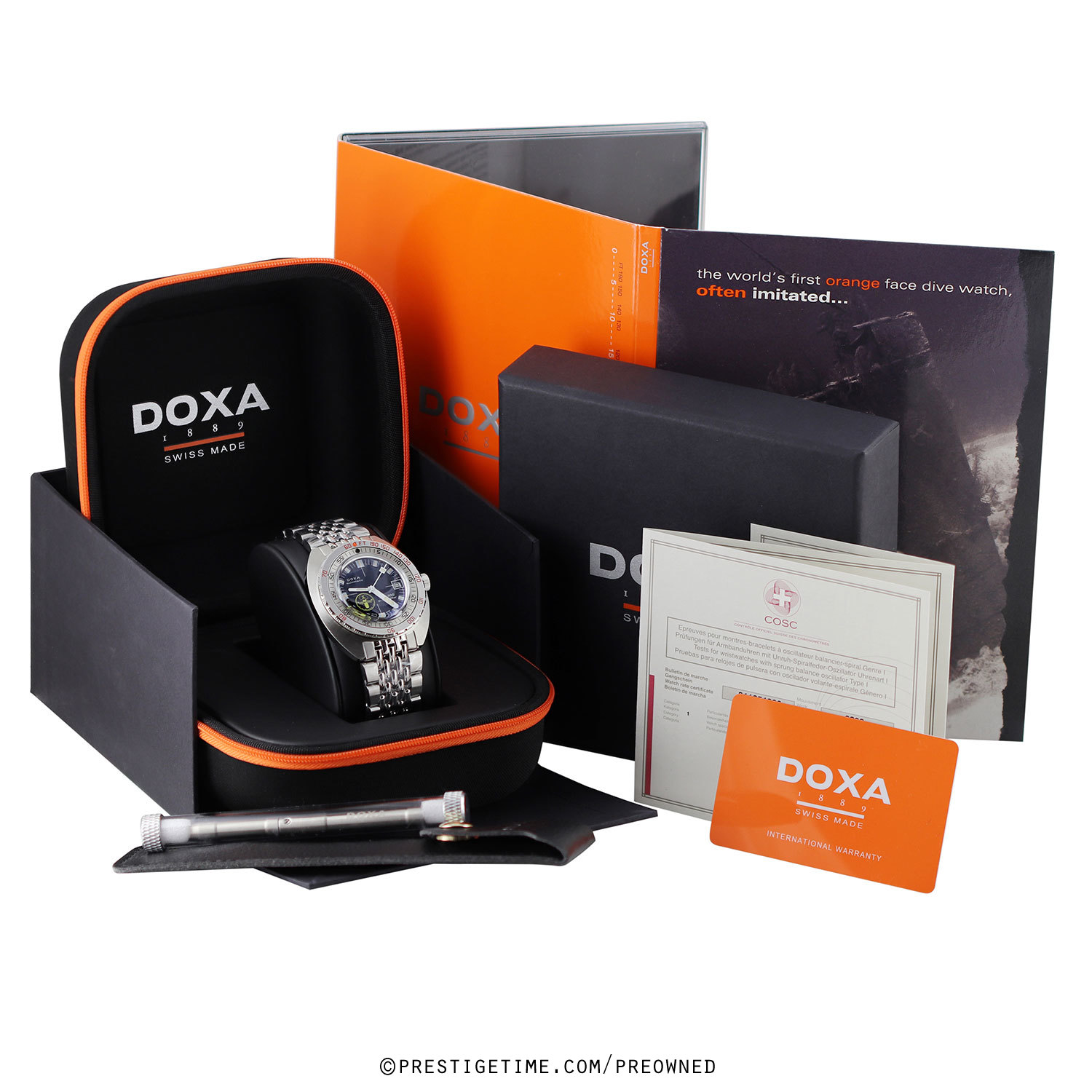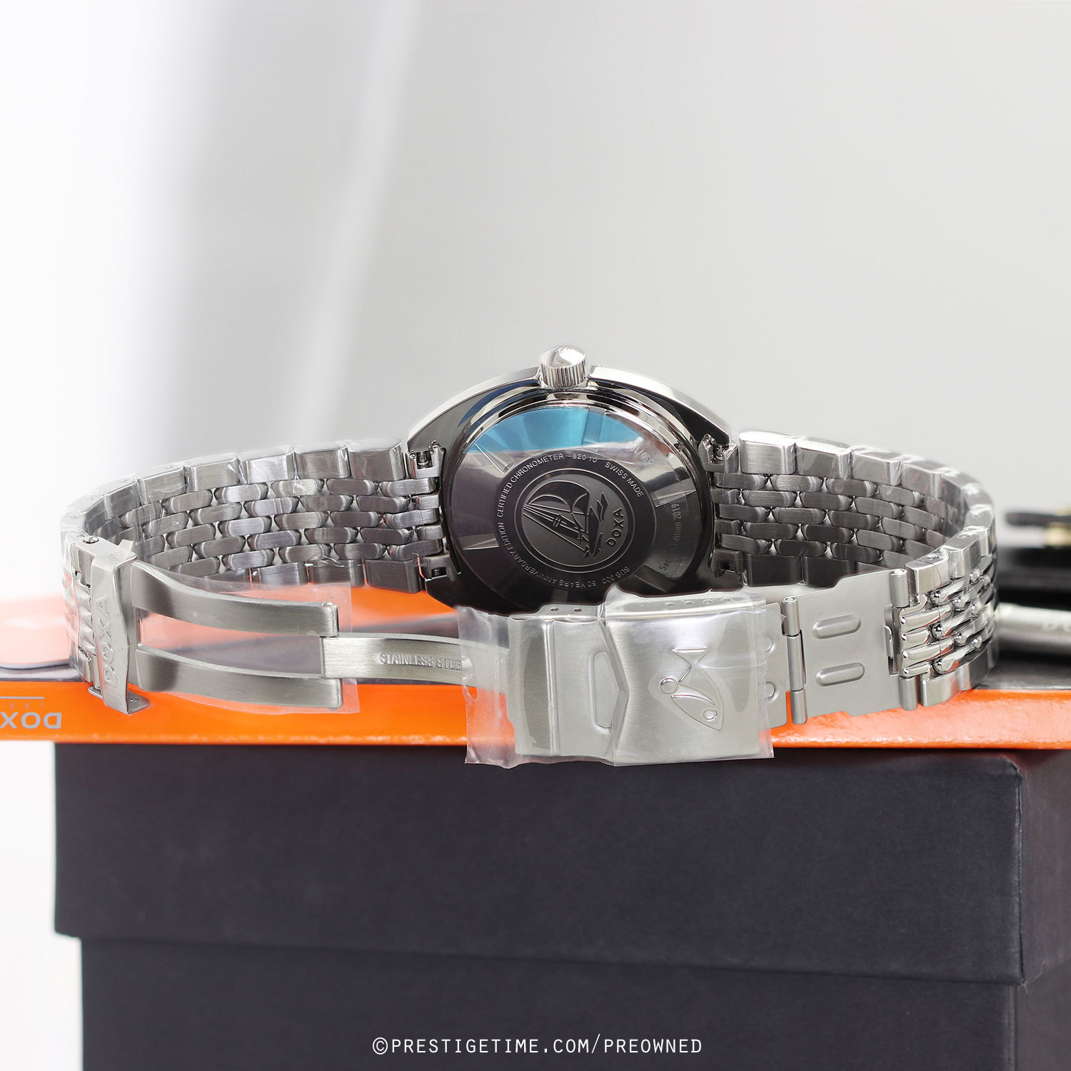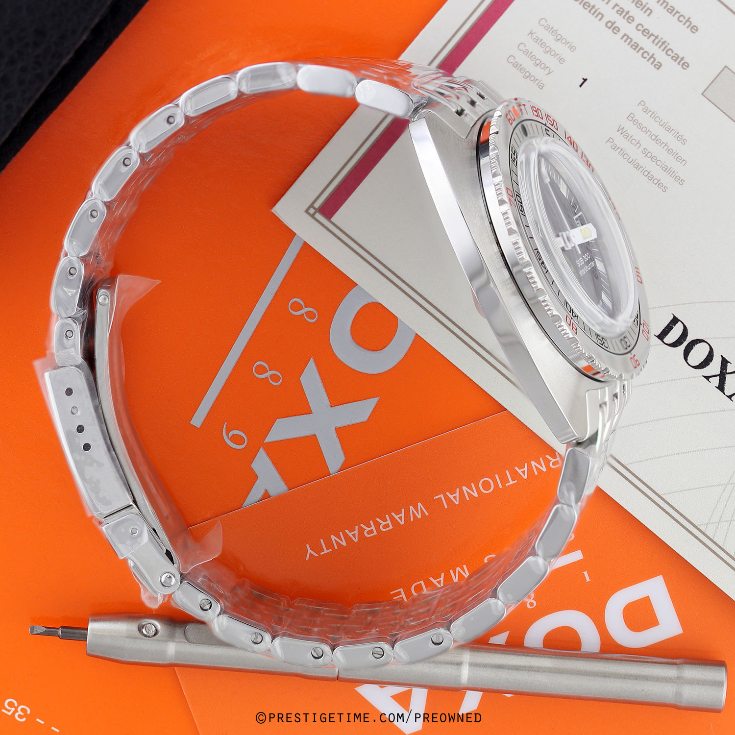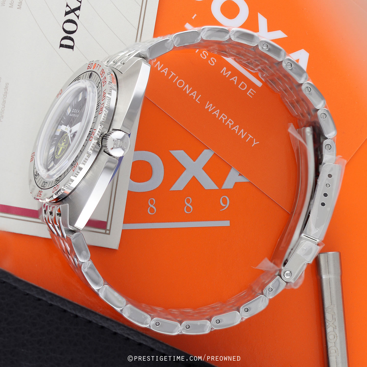 Strap: Brushed & polished stainless steel bracelet with the DOXA SUB "Beads of Rice" design, folding safety clasp with a wet-suit extension. The bracelet is fully linked. Provided with a branded tool to remove links.