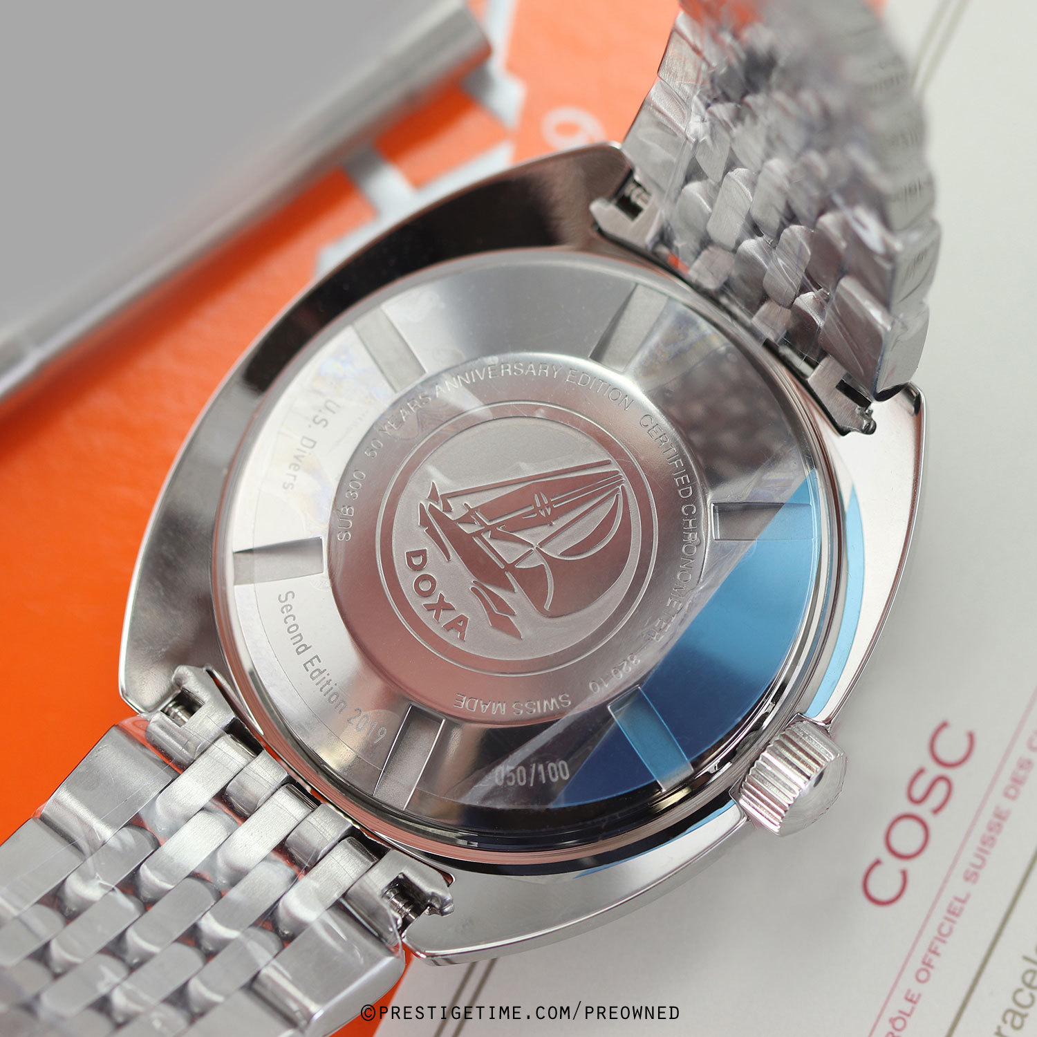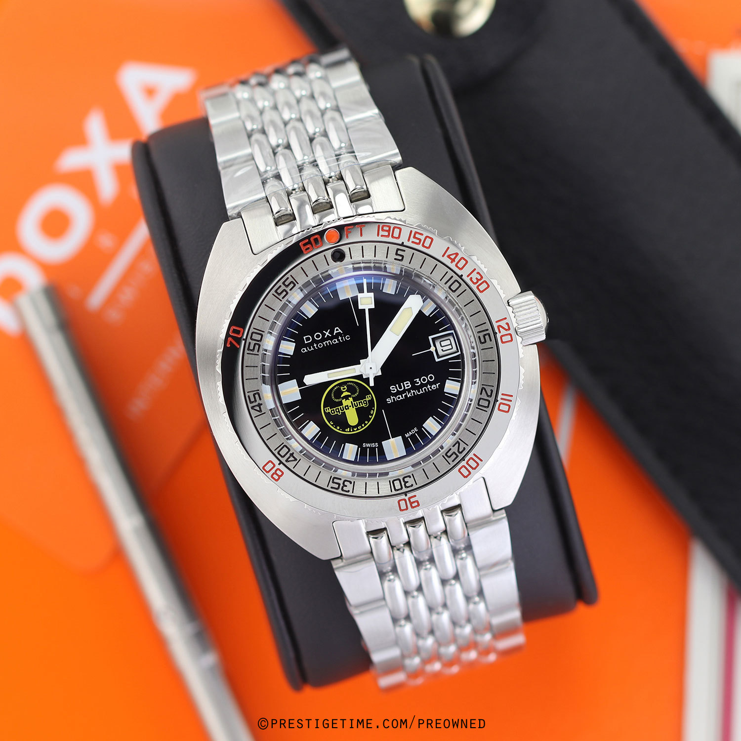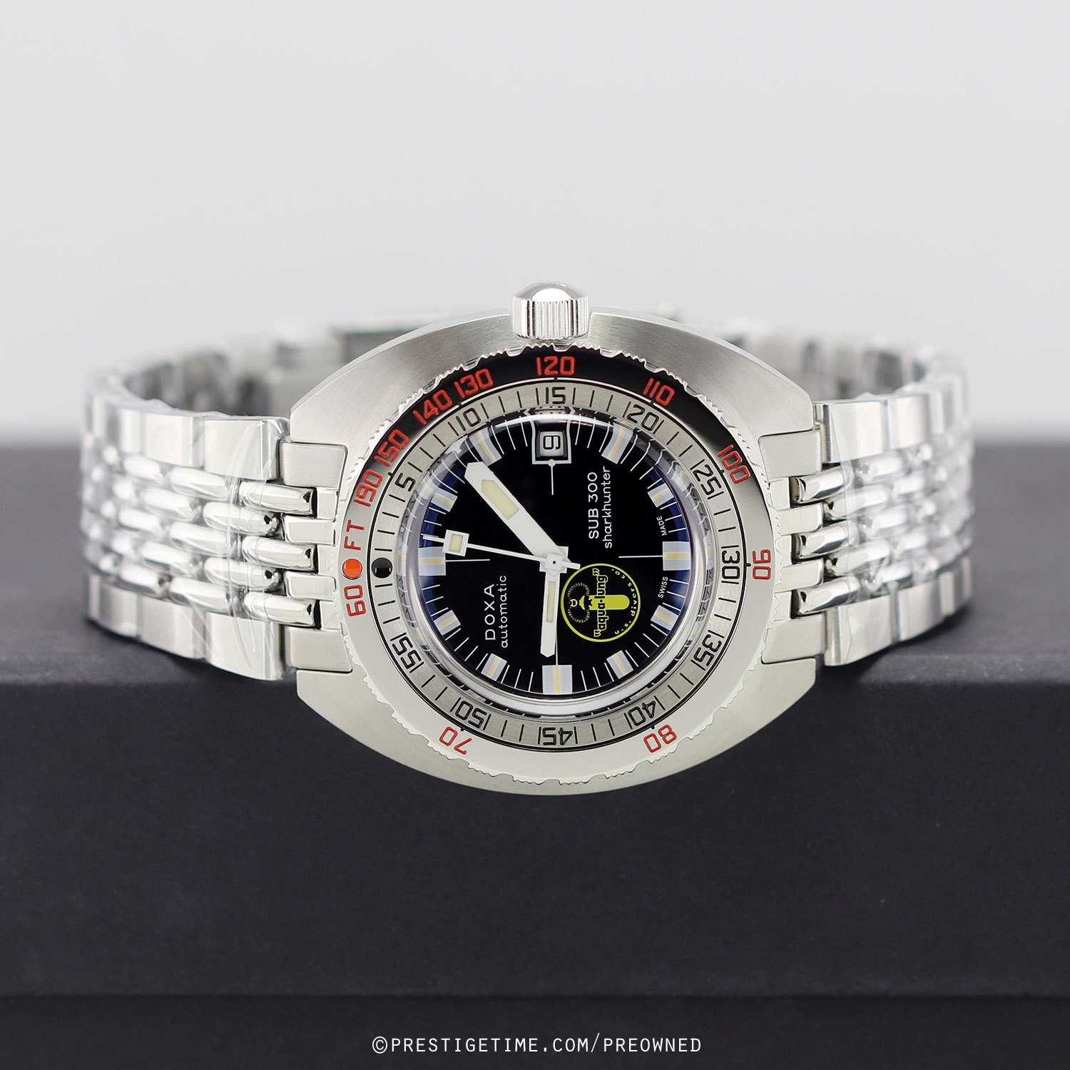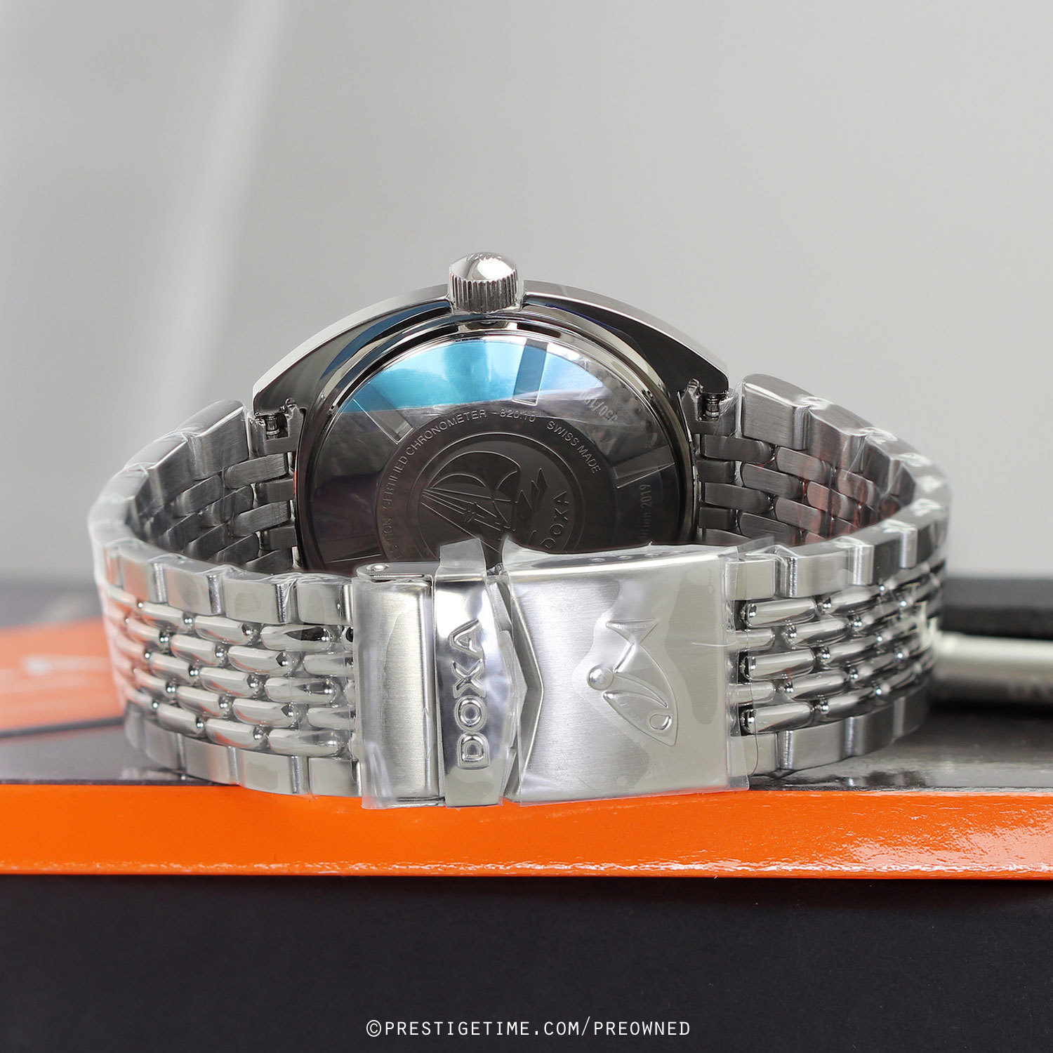 Strap: Brushed & polished stainless steel bracelet with the DOXA SUB "Beads of Rice" design, folding safety clasp with a wet-suit extension. The bracelet is fully linked. Provided with a branded tool to remove links.