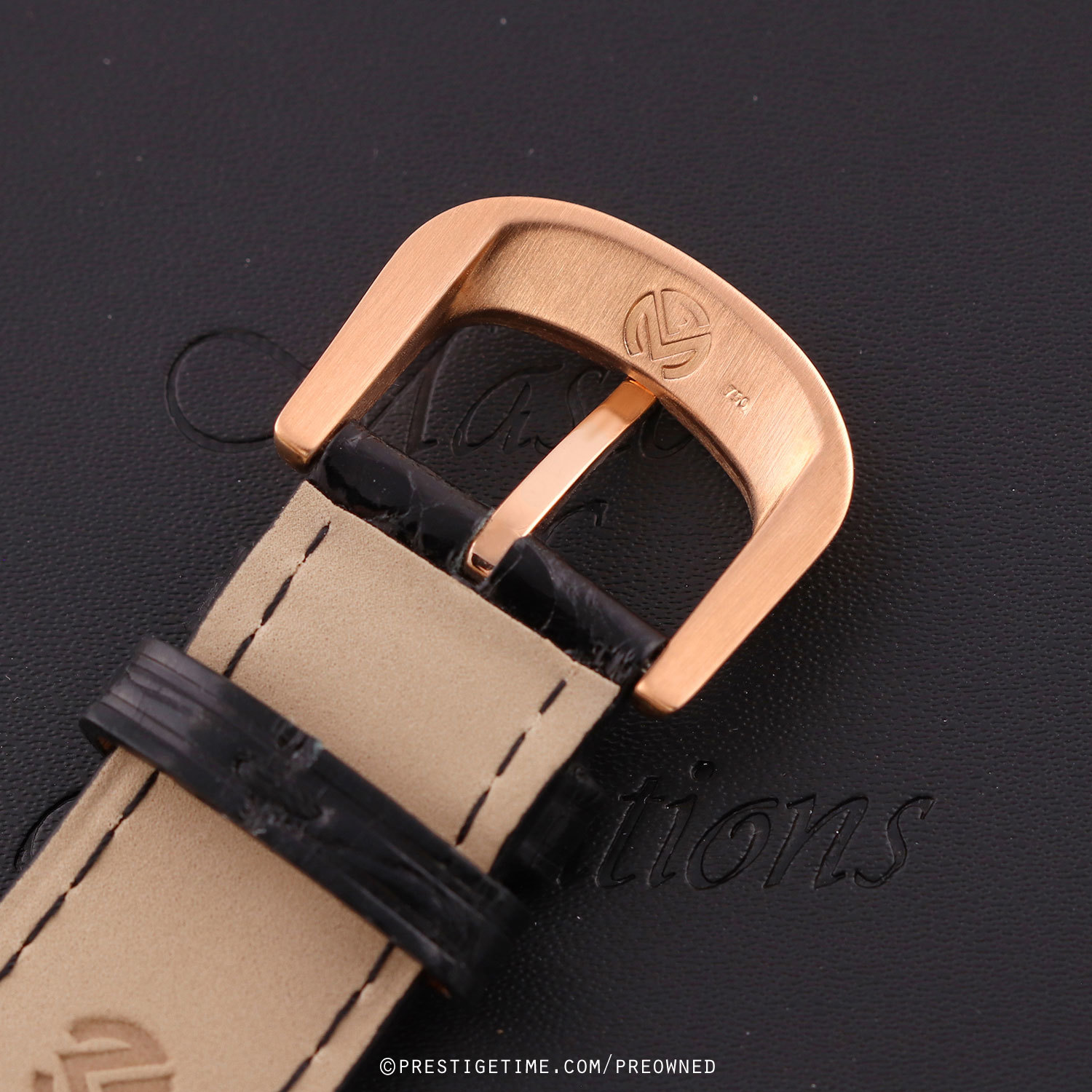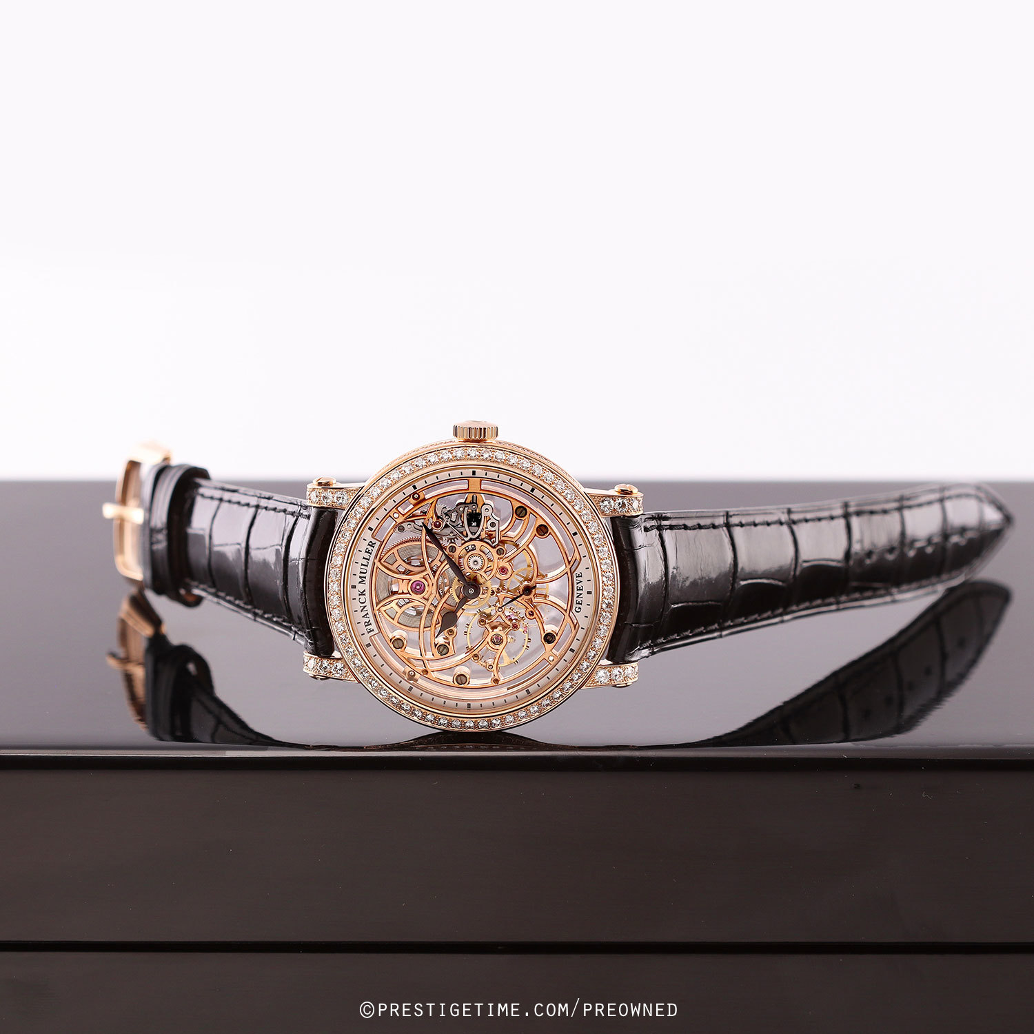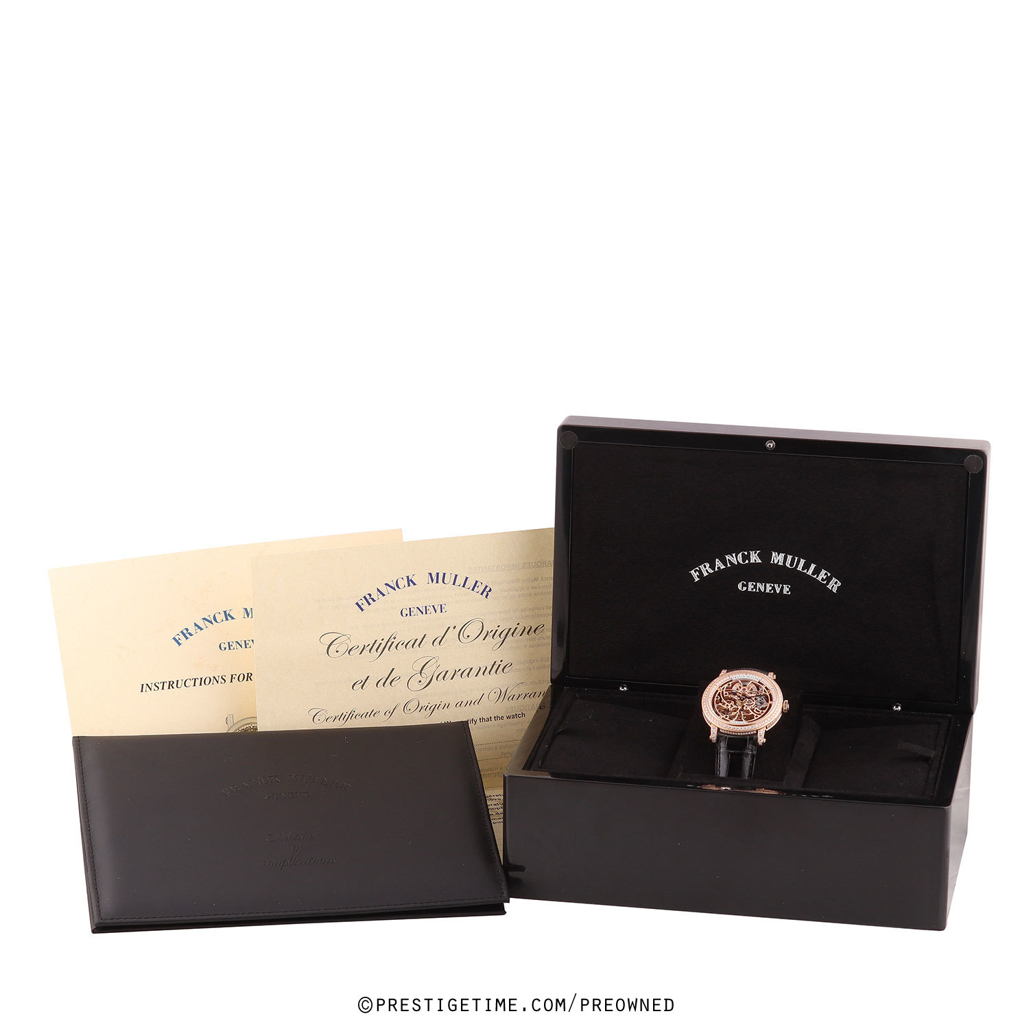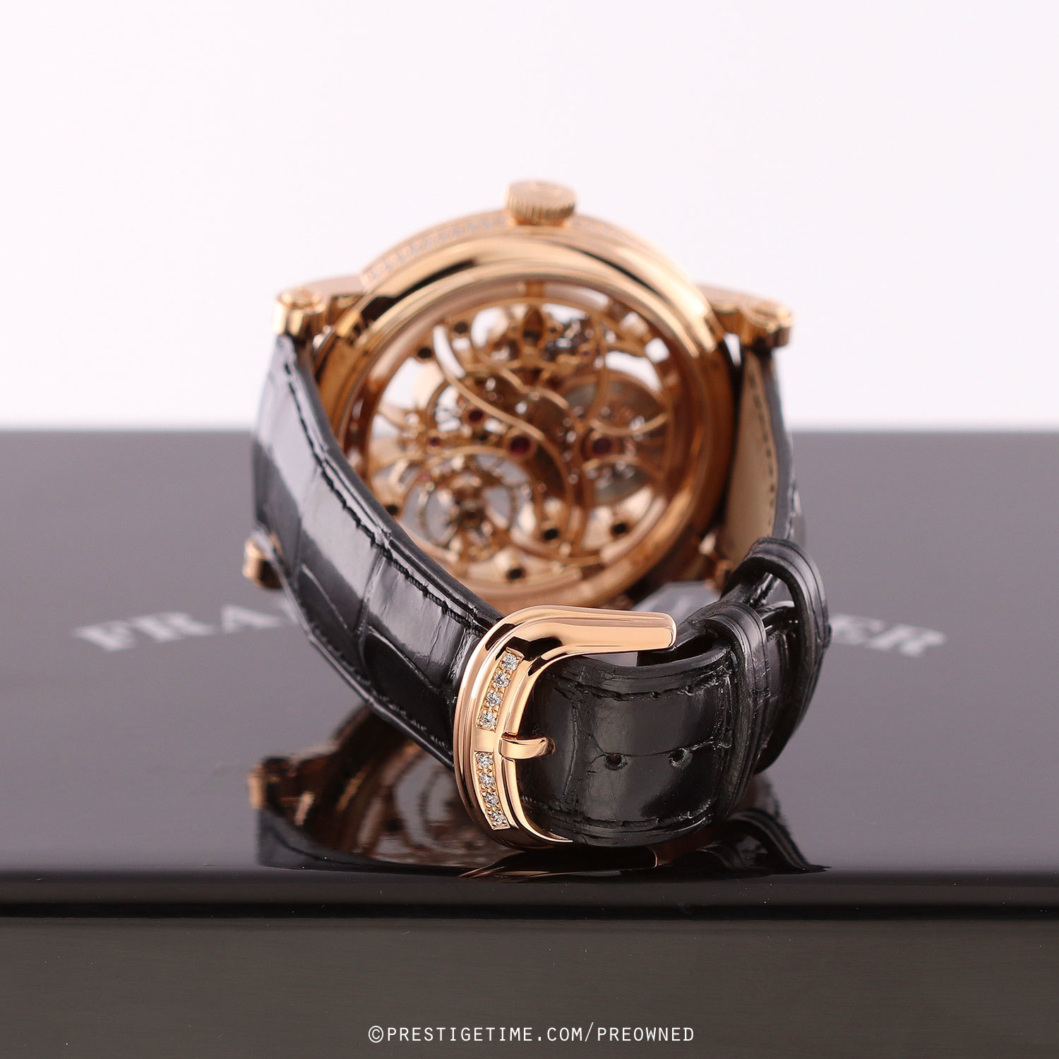 Strap: Fitted on its original Franck Muller black alligator leather strap & a solid 18kt rose gold tang buckle set with 8 brilliant cut diamonds . The strap is unworn, in new condition, with its full wear lifespan remaining.