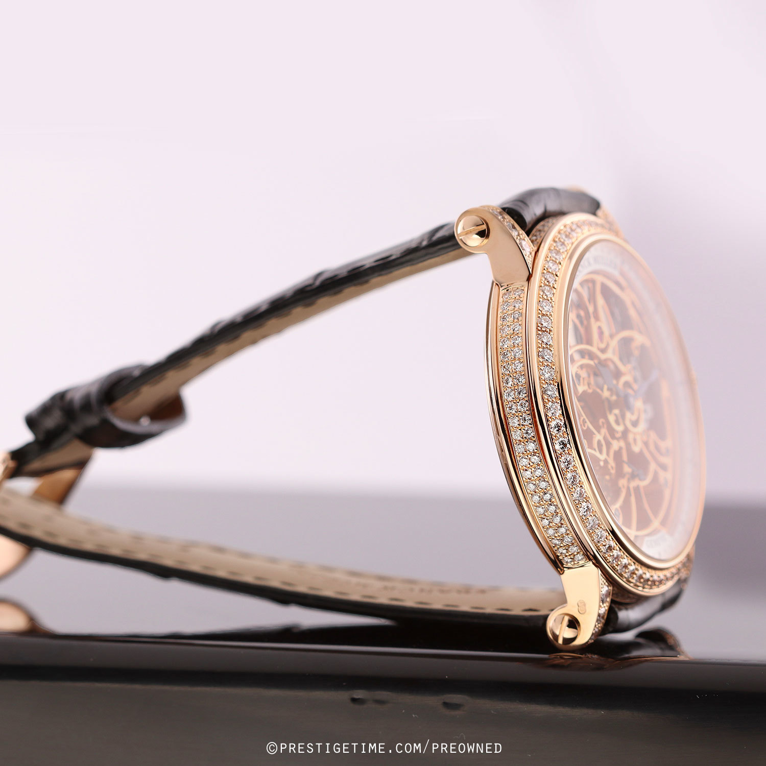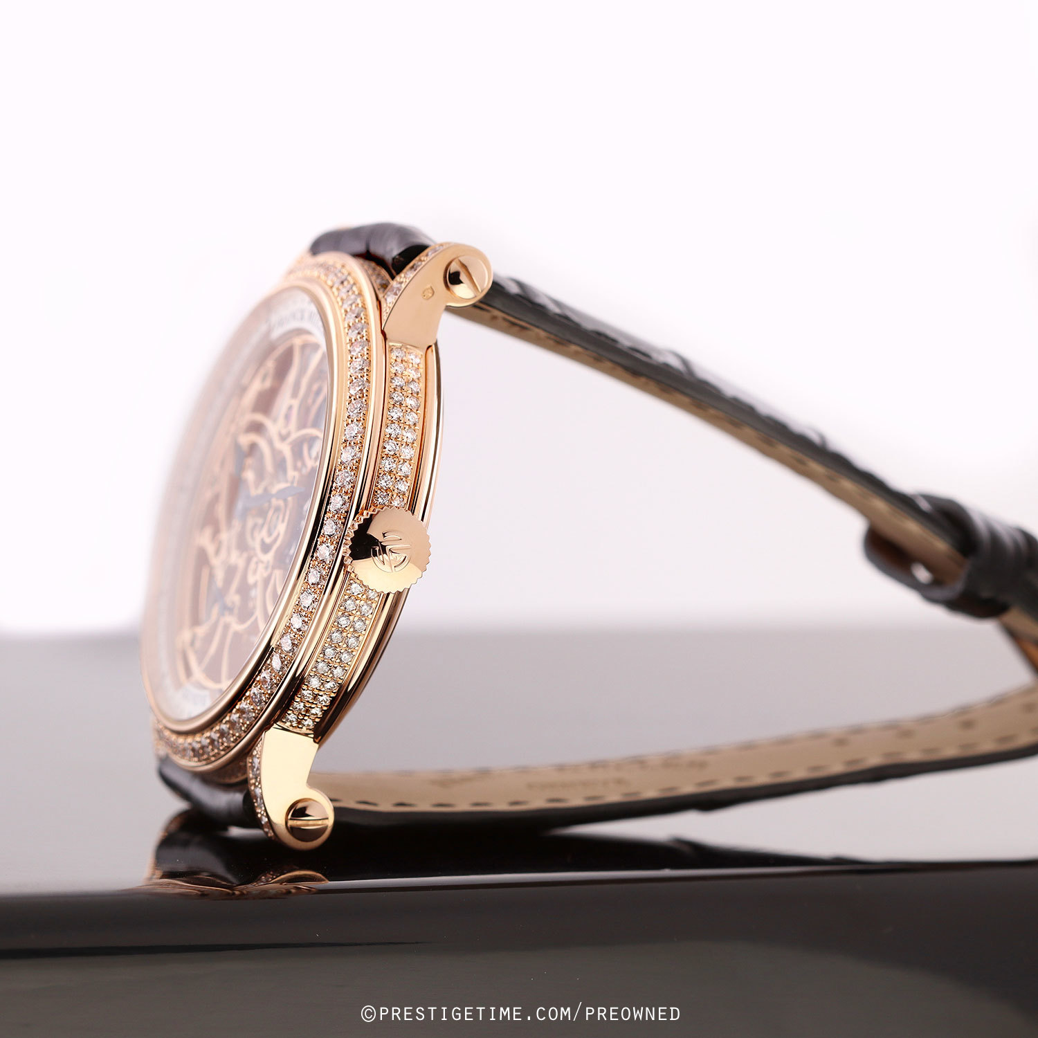 Case: Polished 18kt rose gold case. Case band, lugs & bezel factory set with 166 diamonds. Skeletonized movement with 18kt rose gold bridges. Blackened hands. Silver dial flange with fine printed hour & minute track. Small seconds sub-dial at 6 o'clock.
