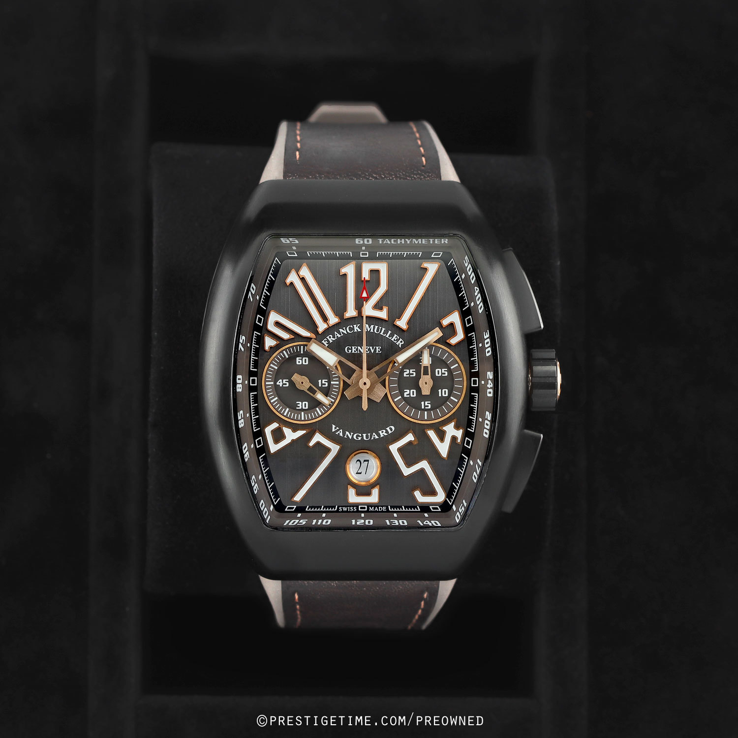 Case: Black, matte, PVD coated stainless steel case with polished rose gold case side inserts. The crown is black PVD coatedwith a rose gold end-cap featuring the FM logo. Dark slate grey dial with a fine vertical brushed finish. Grey dial flange with tachymeter scale. Brushed rose gold hands with luminous filled tips. Applied brushed finished rose gold Arabic numeral hour markers with white fill (not luminous). Minute/seconds & fractions of a seconds track on a thin black dial rim. Small seconds sub-dial at 9 o'clock. Date window at 6 o'clock.