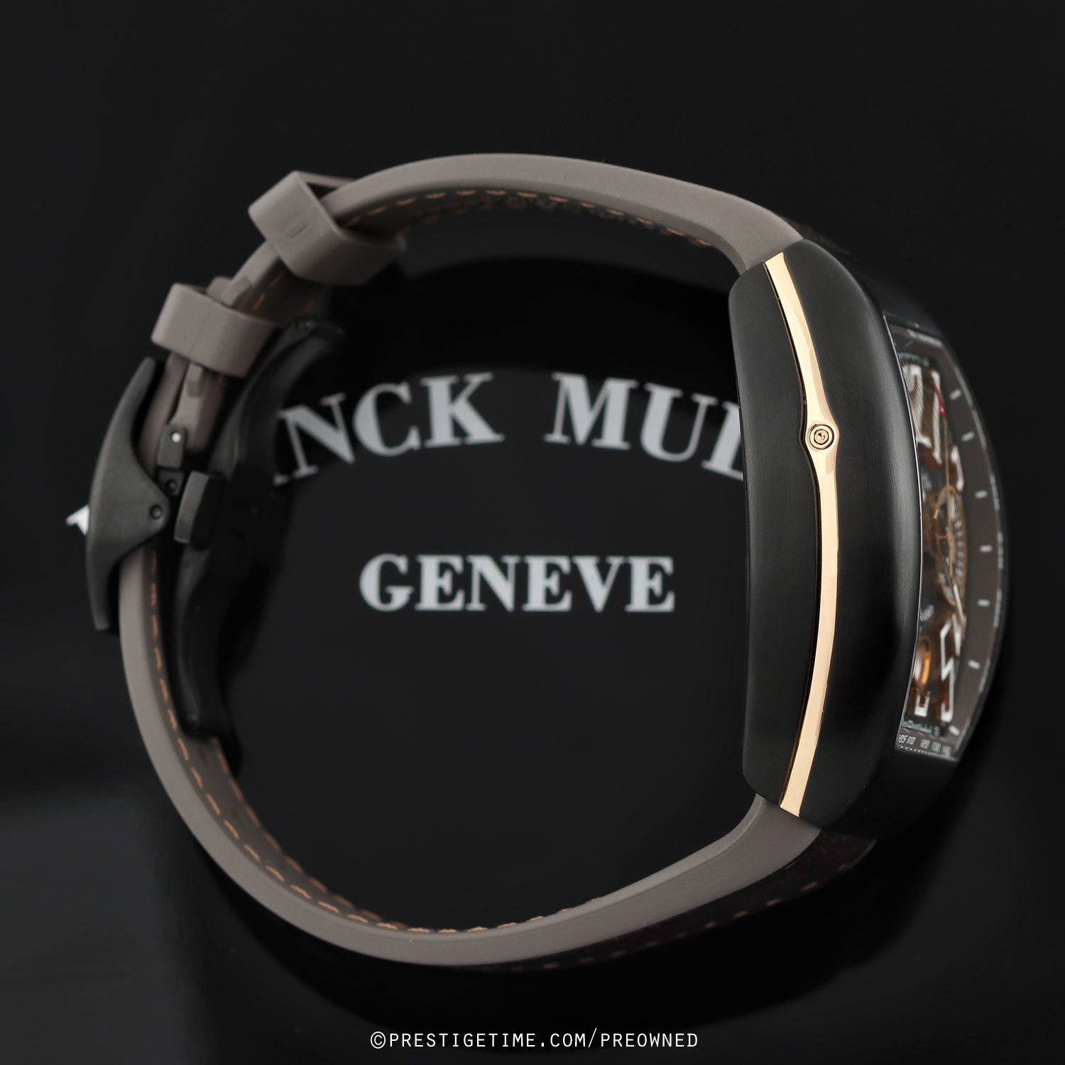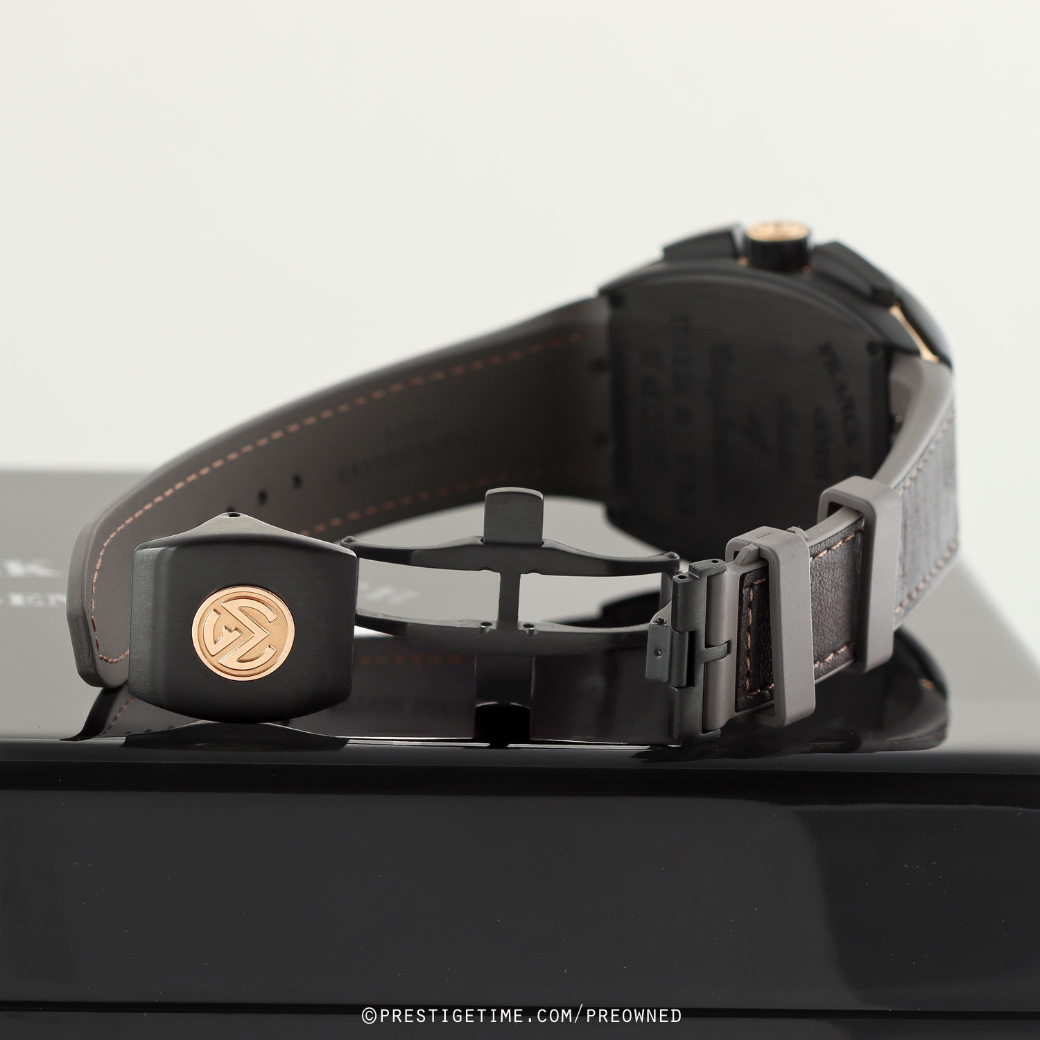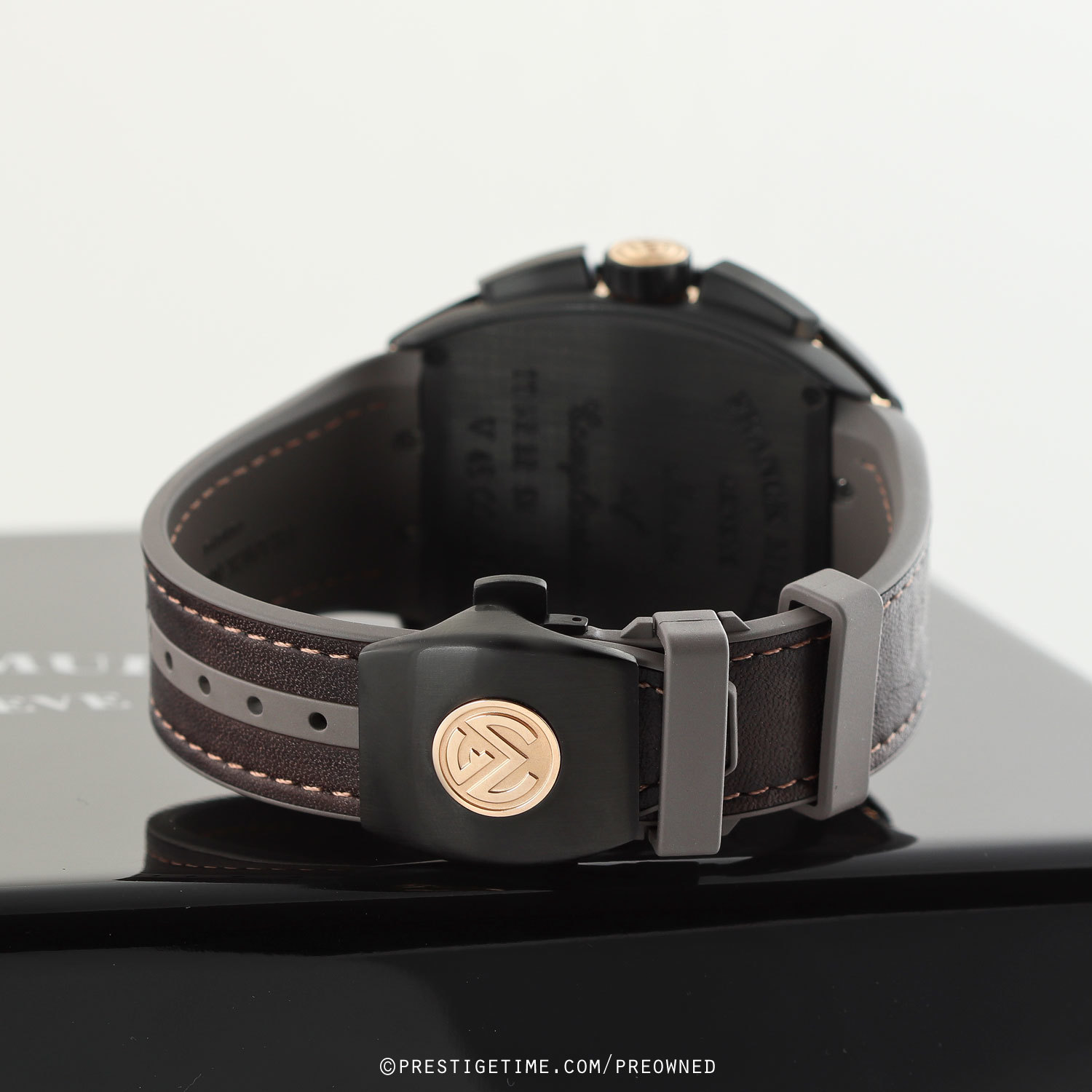 Strap: Fitted on its original mauve-grey rubber strap with soft brown calfskin top. The strap features a black PVD coated stainless steel push-button deployant clasp with a rose gold FM logo. The strap is in 98% condition with almost its full wear life-span remaining.