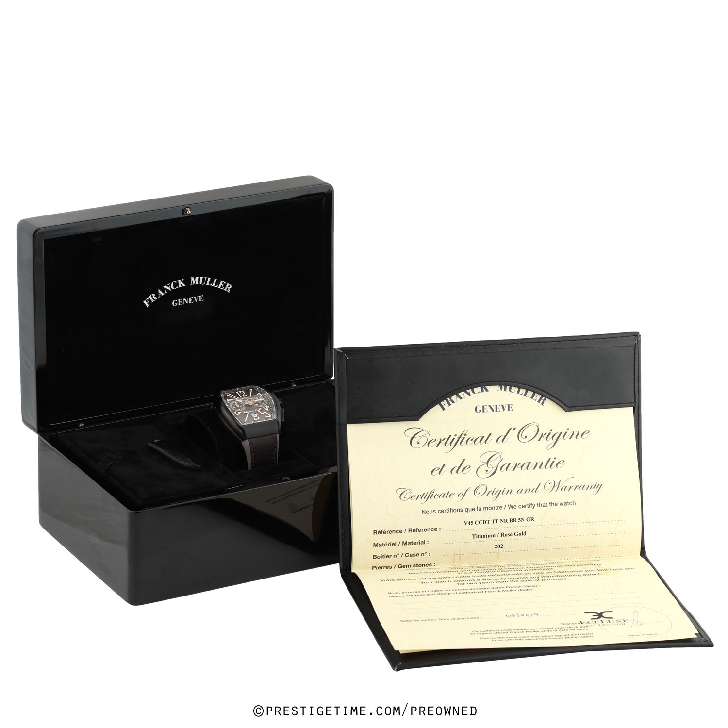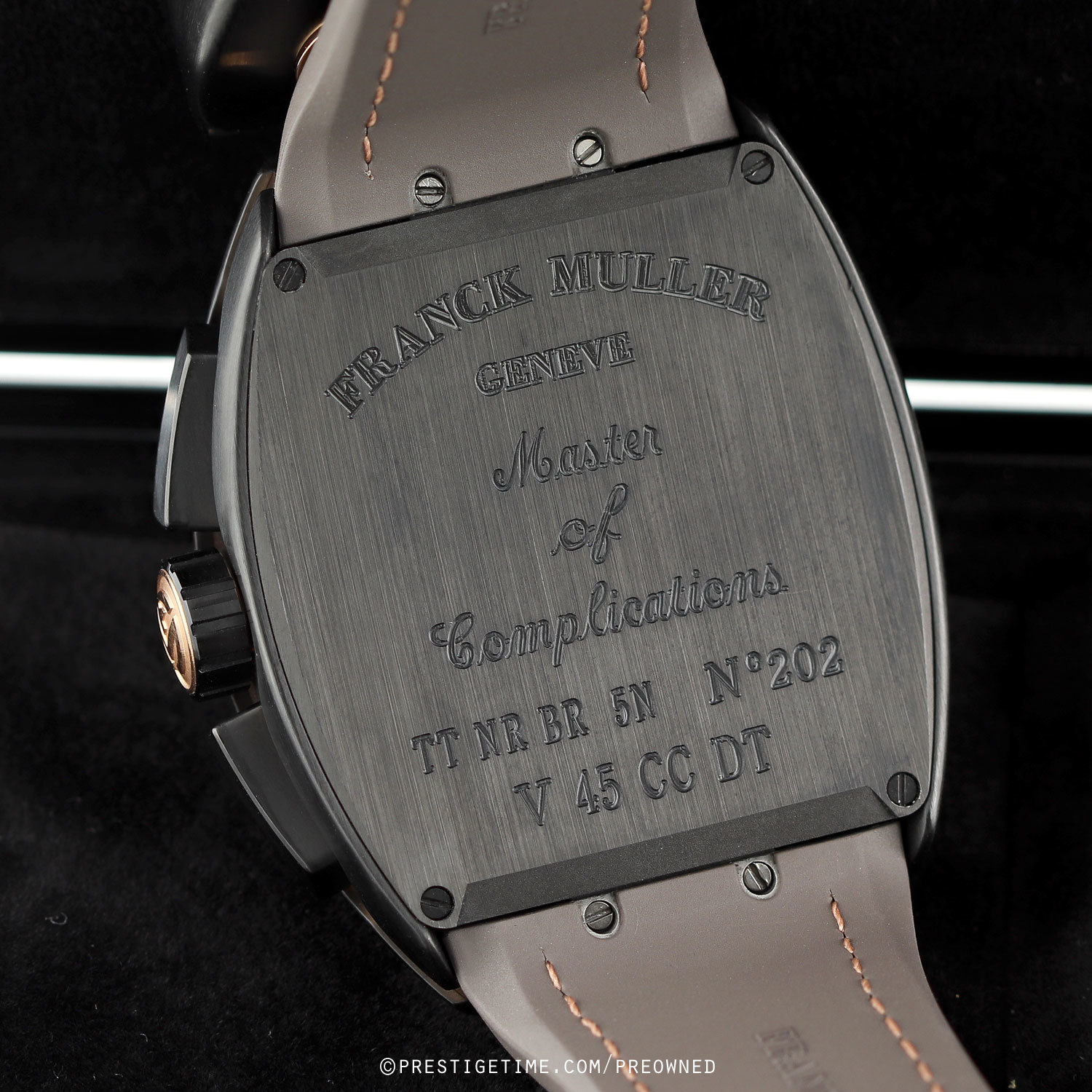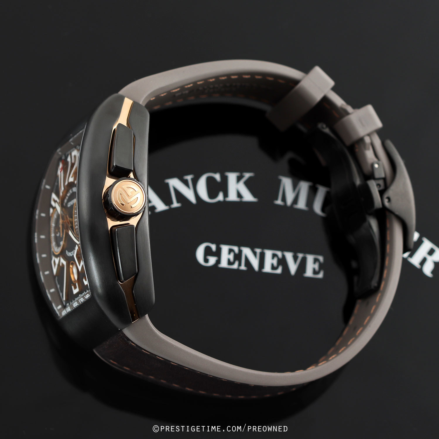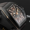 Strap: Fitted on its original mauve-grey rubber strap with soft brown calfskin top. The strap features a black PVD coated stainless steel push-button deployant clasp with a rose gold FM logo. The strap is in 98% condition with almost its full wear life-span remaining.
