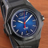 Case: Black PVD coated titanium case, brushed finished with polished beveled corners. Octagonal shaped fixed position bezel. Blue dial with a fine sunray finish. Darkened polished hour & minute hands with luminous fill. Red central seconds hand. Black recessed & luminous hour markers. Blue dial flange with fine printed minute/seconds & fractions of a second track. Date window at 6 o'clock.