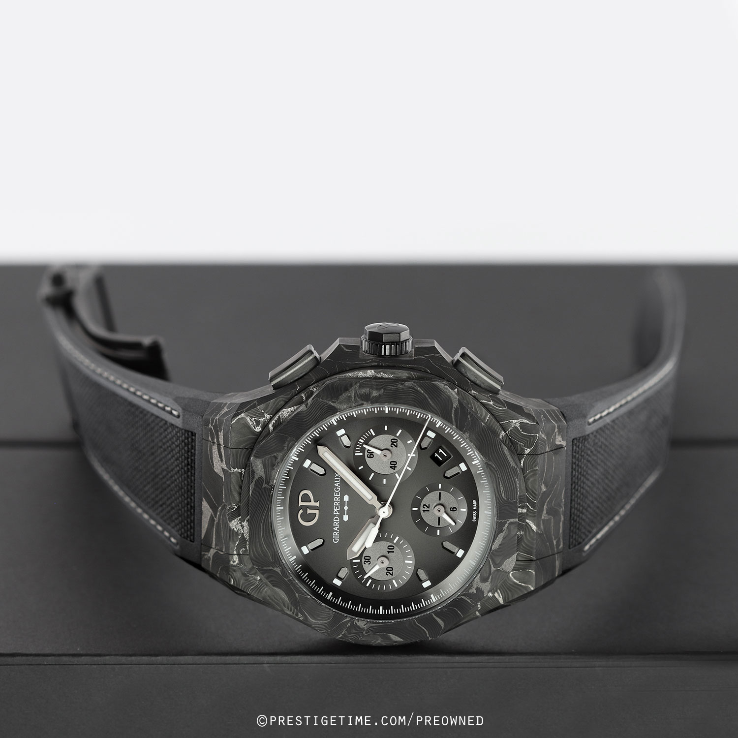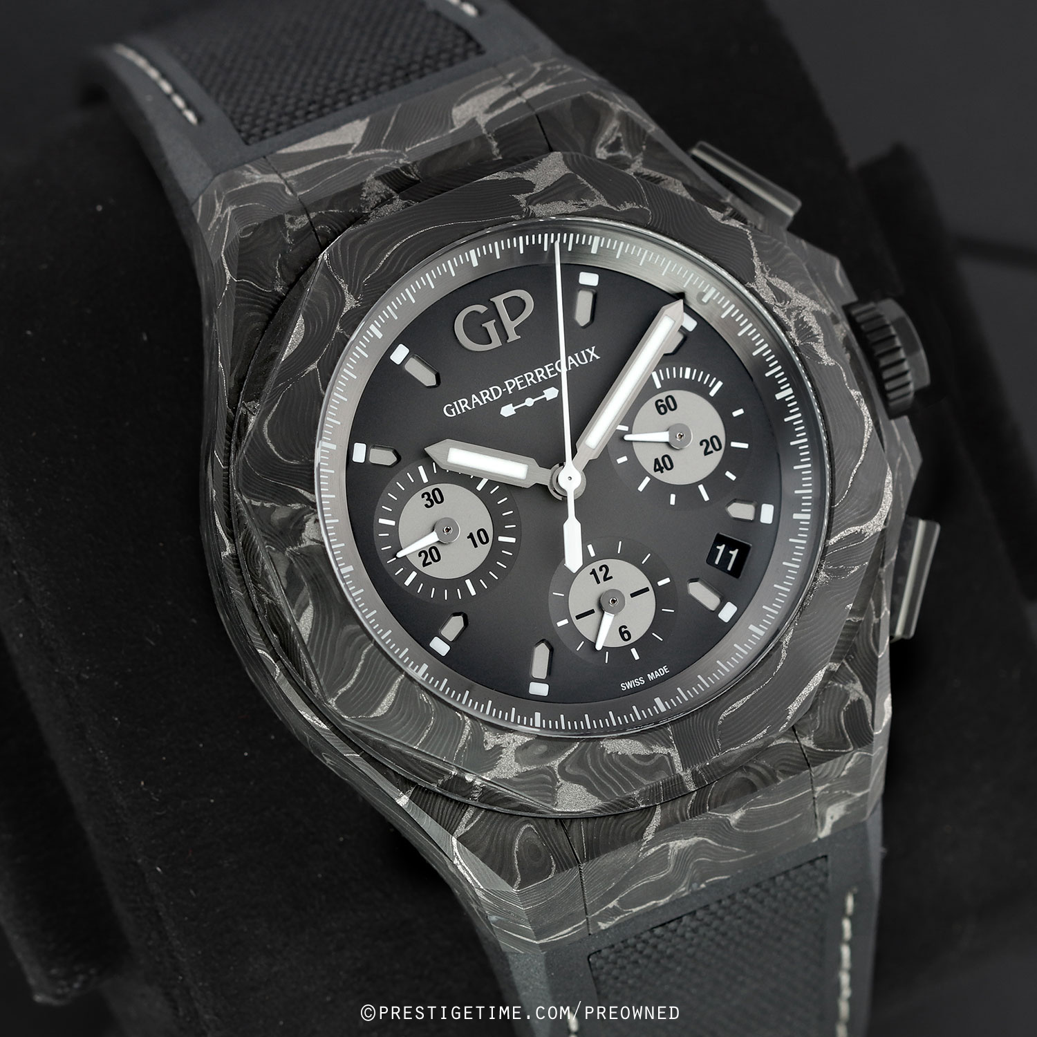 The Laureato Absolute 8Tech is crafted from Girard-Perregaux’s proprietary 8Tech material, a carbon-titanium composite formed by layering ultra-thin sheets infused with titanium powder. Once built up, the material is precision-milled, resulting in exceptional strength and a naturally unique, patterned finish