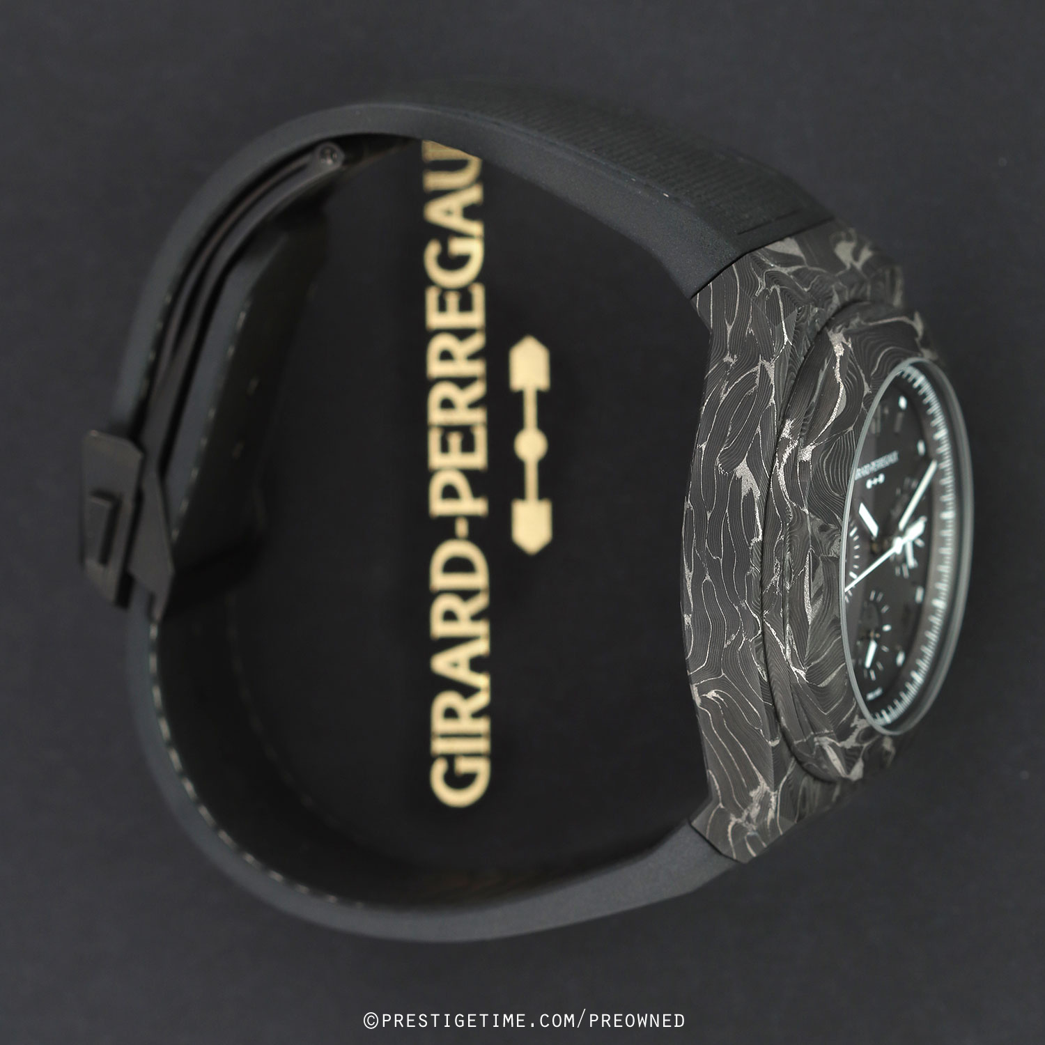 Strap: Fitted on its original GP black rubber strap with contrasting light-grey stitching & a black PVD coated titanium push-button deployant buckle. This strap is in excellent condition with the vast majority of its wear lifespan remaining. We would grade this strap in 98%+ condition.