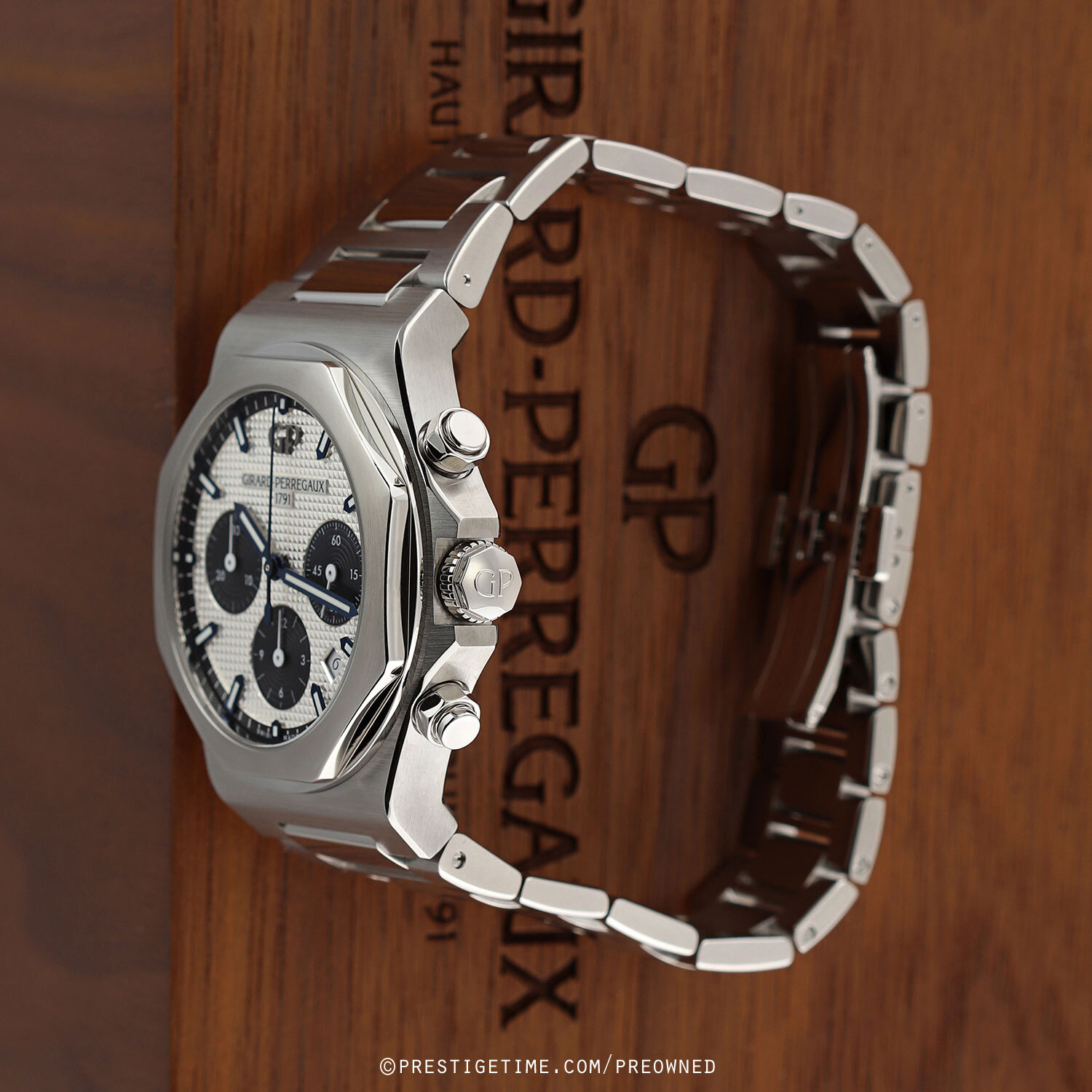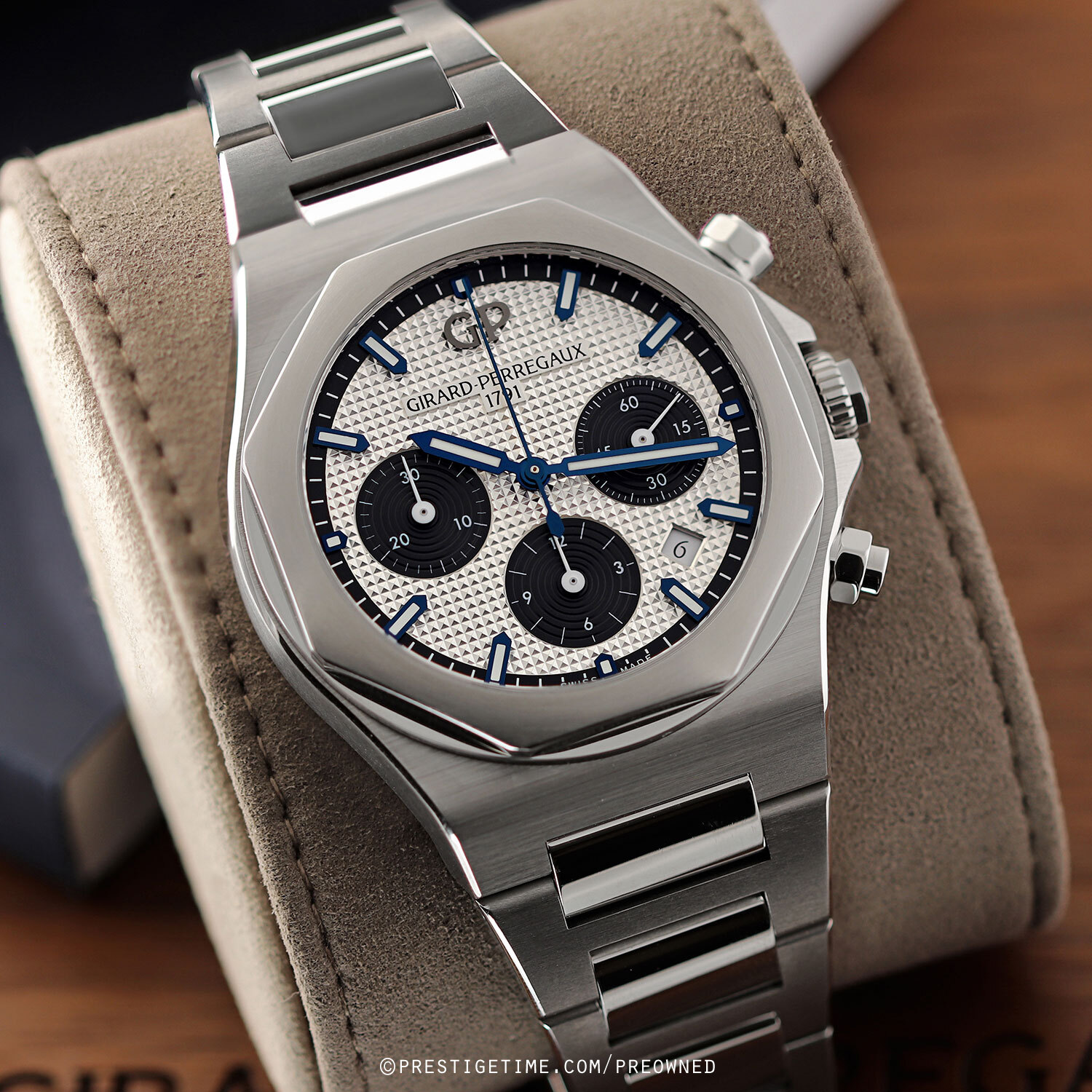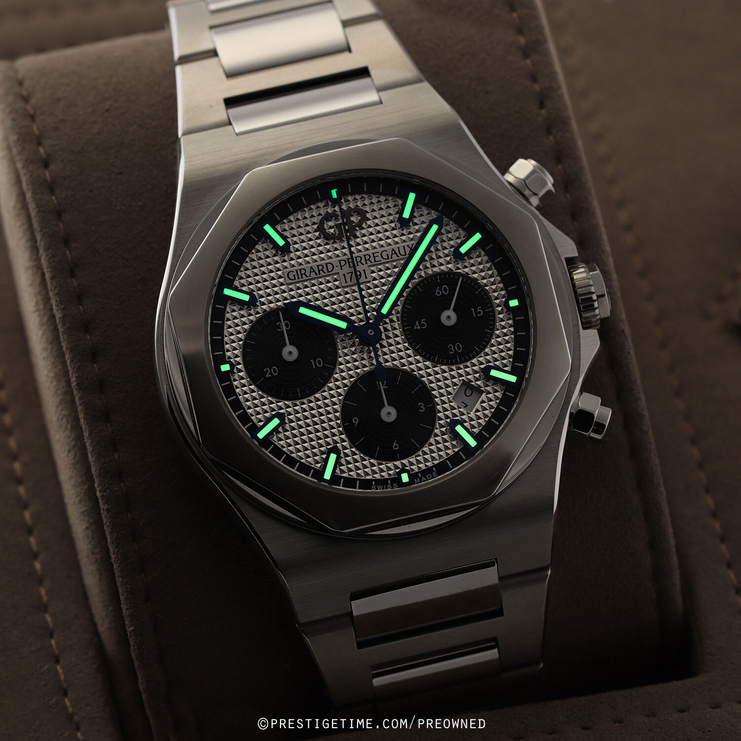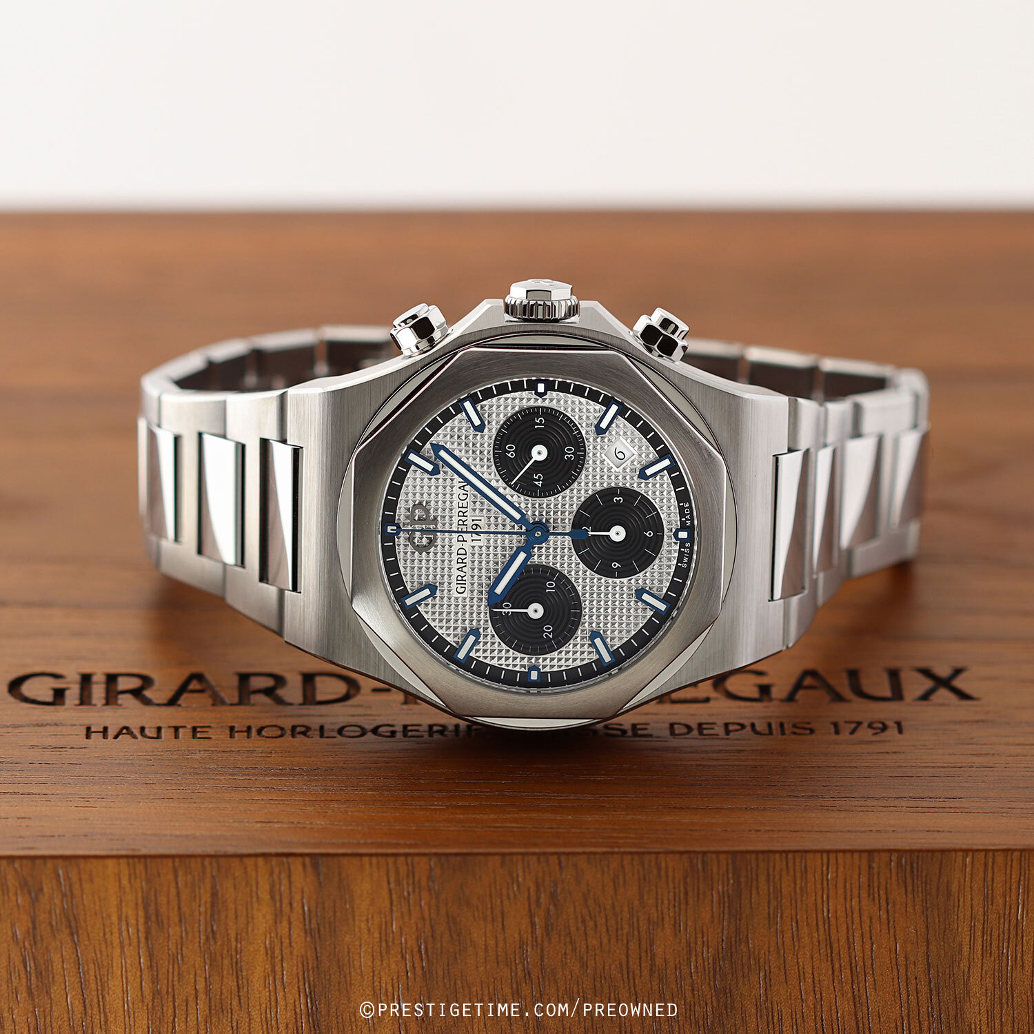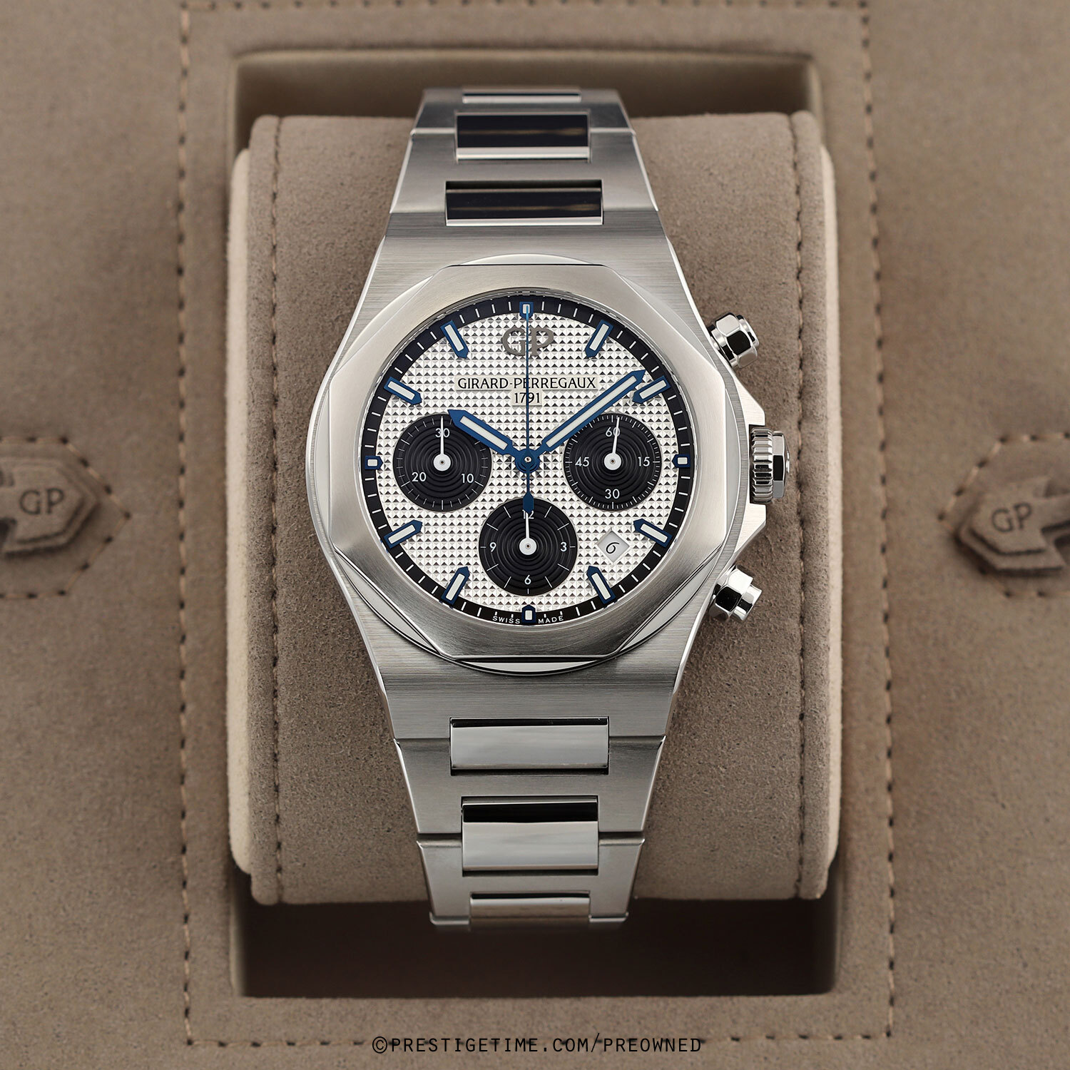 Case: Brushed stainless steel case with polished finished fine beveled corners. Octagonal-shaped brushed & polished stainless steel bezel. Silver dial with a fine hobnail guilloche pattern, Black sub-dials & dial flange. Blued steel central hands, the hour & minute hands with luminous fill. White sub-dial hands. Black dial flange with printed hour/minute track. Applied blued steel index hour markers with luminous fill. Date window at 4.30. Small continuous running seconds sub-dial at 3 o'clock.