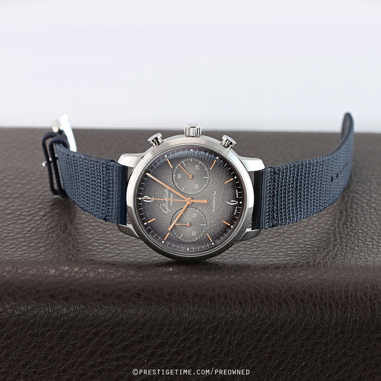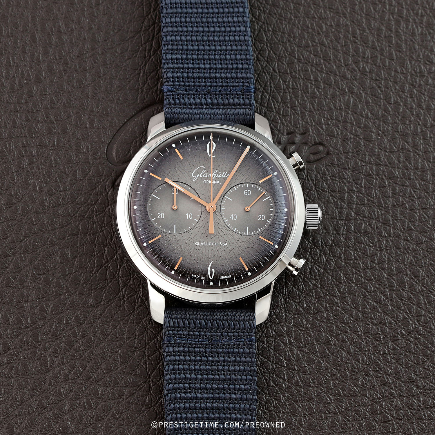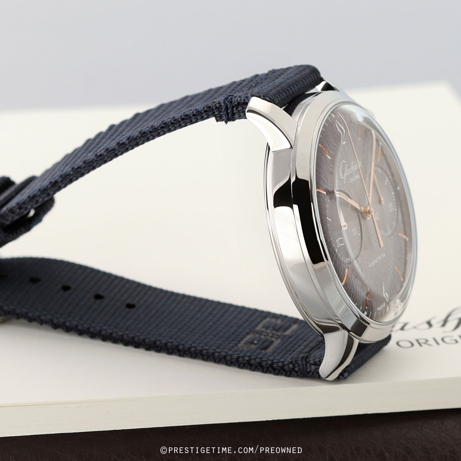 Strap: Fitted on its original Glashutte Original very dark blue fabric strap with a tang buckle. The strap is in excellent near new condition, with the vast majority of its wear-lifespan remaining. We would grade the strap as in 97% condition.