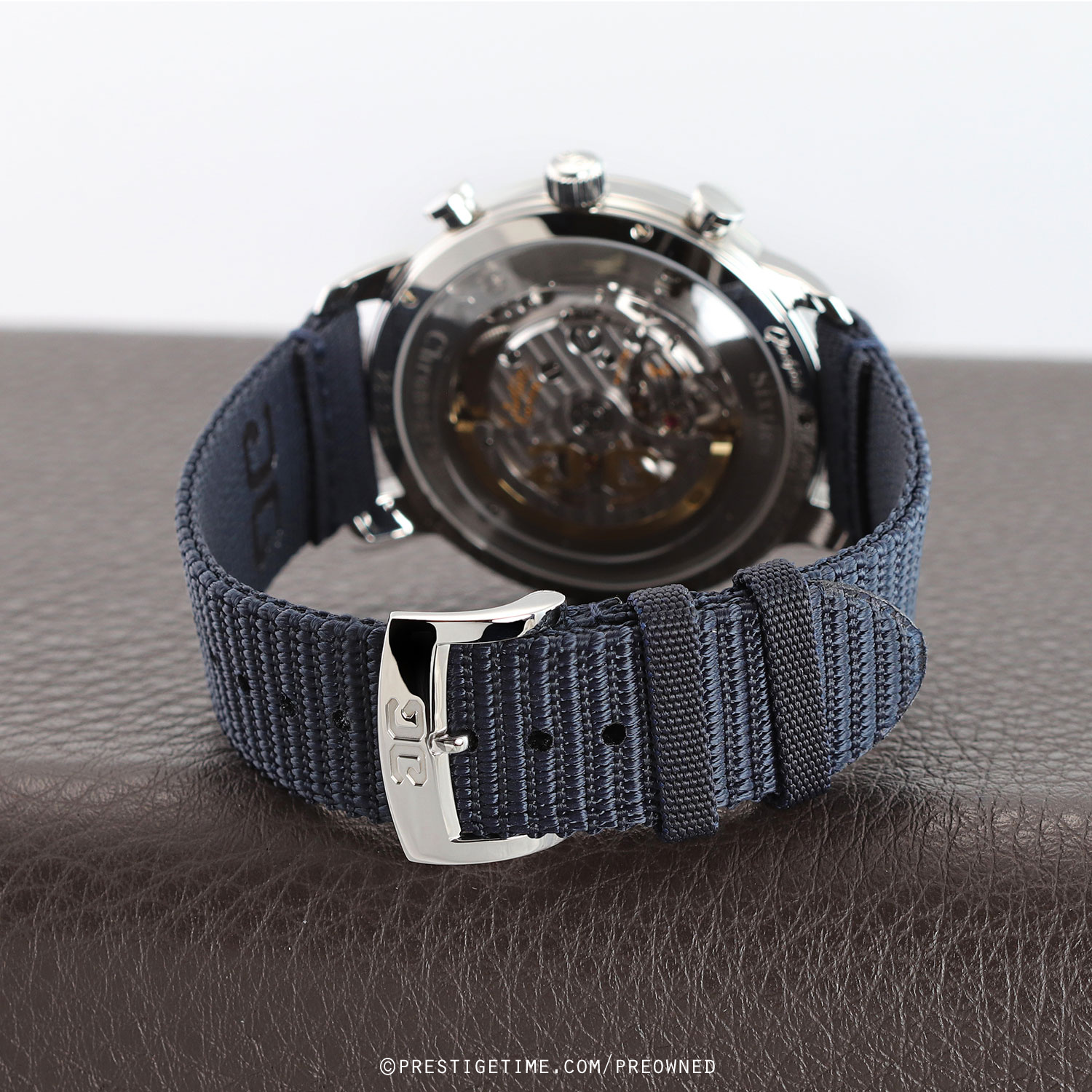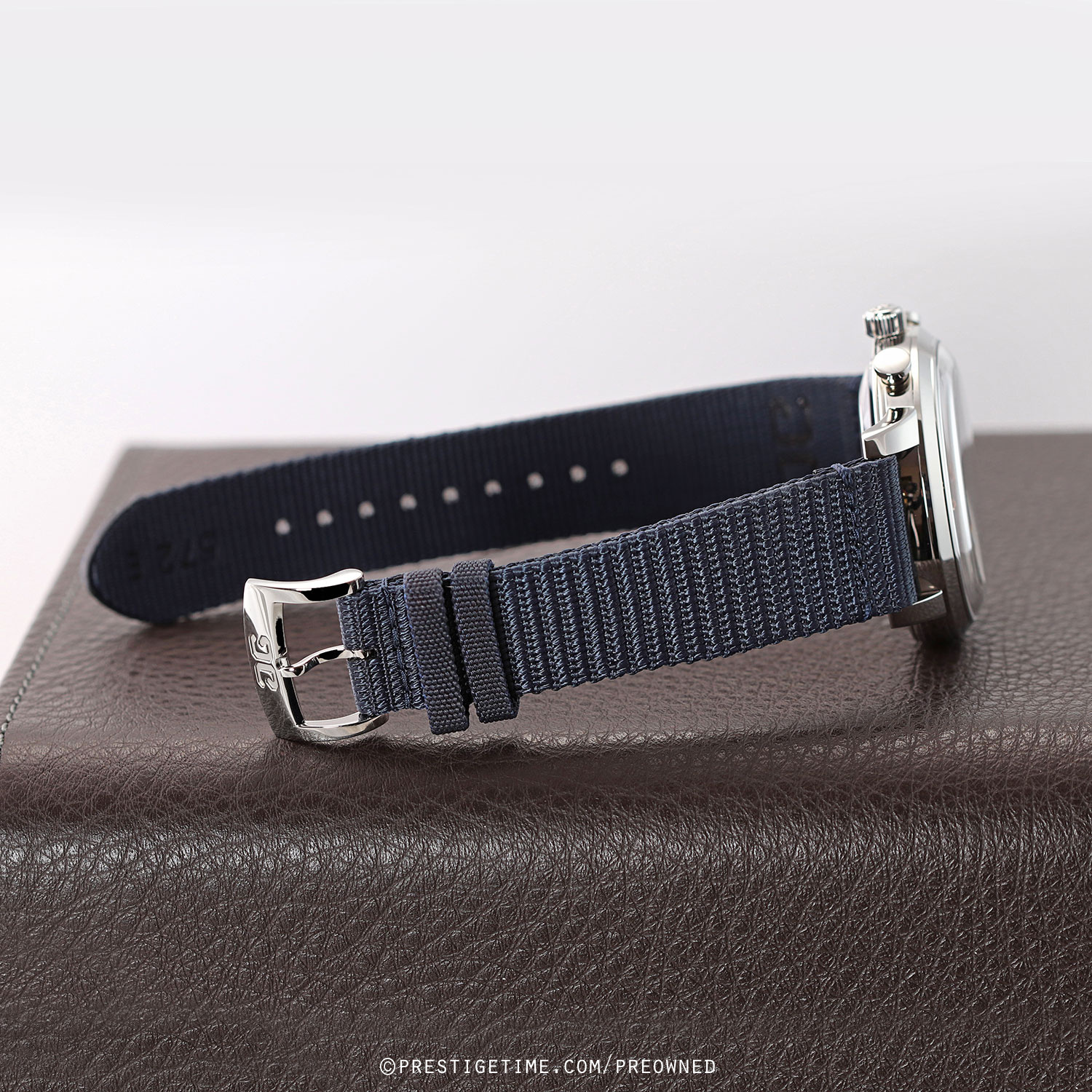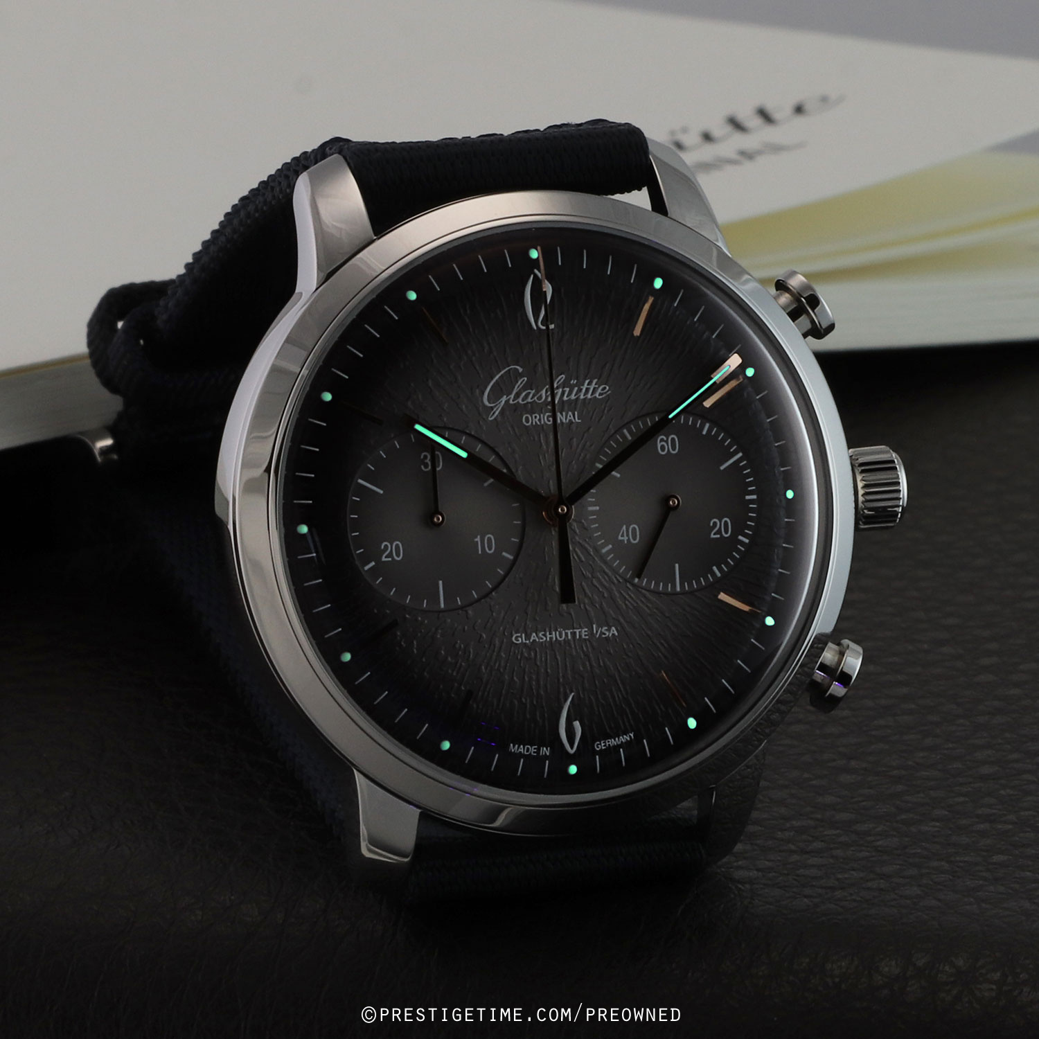 Strap: Fitted on its original Glashutte Original very dark blue fabric strap with a tang buckle. The strap is in excellent near new condition, with the vast majority of its wear-lifespan remaining. We would grade the strap as in 97% condition.