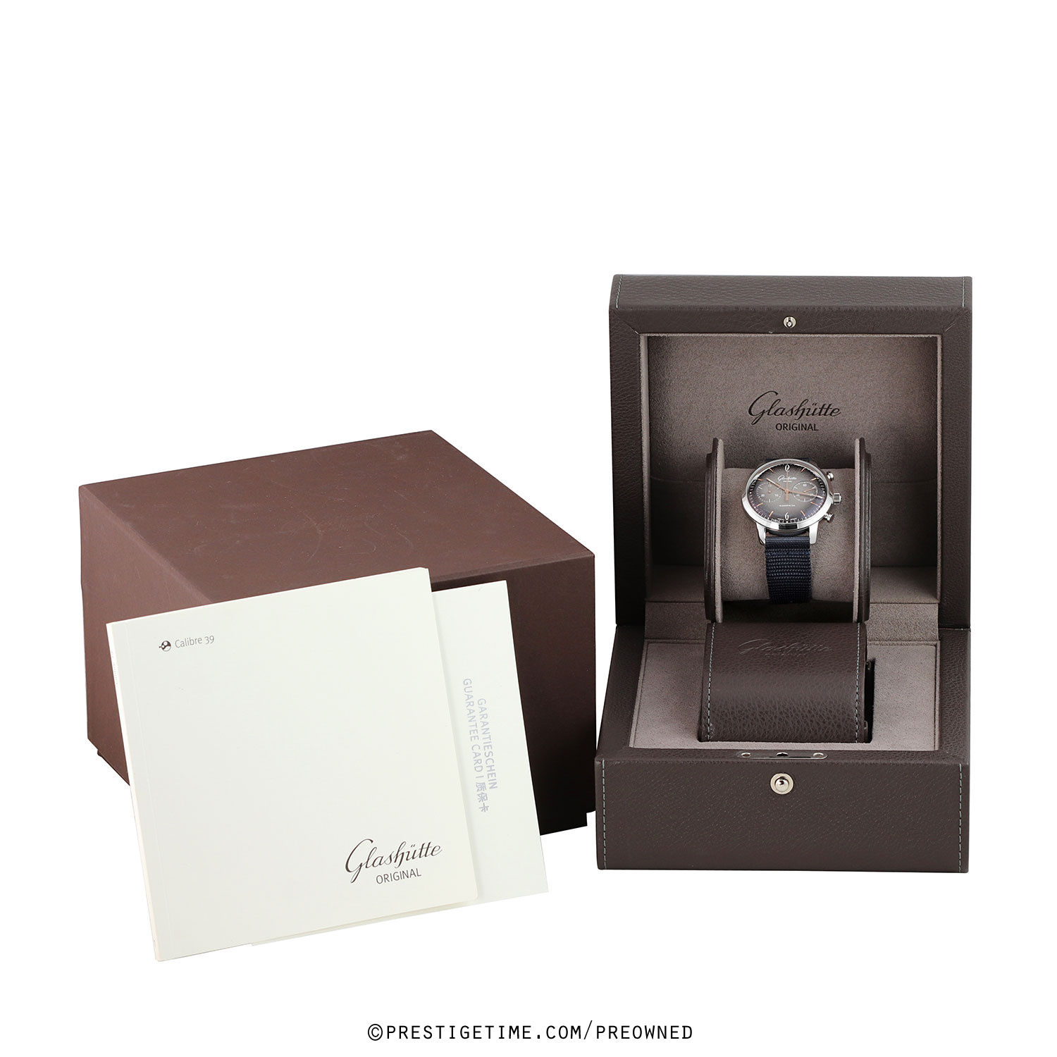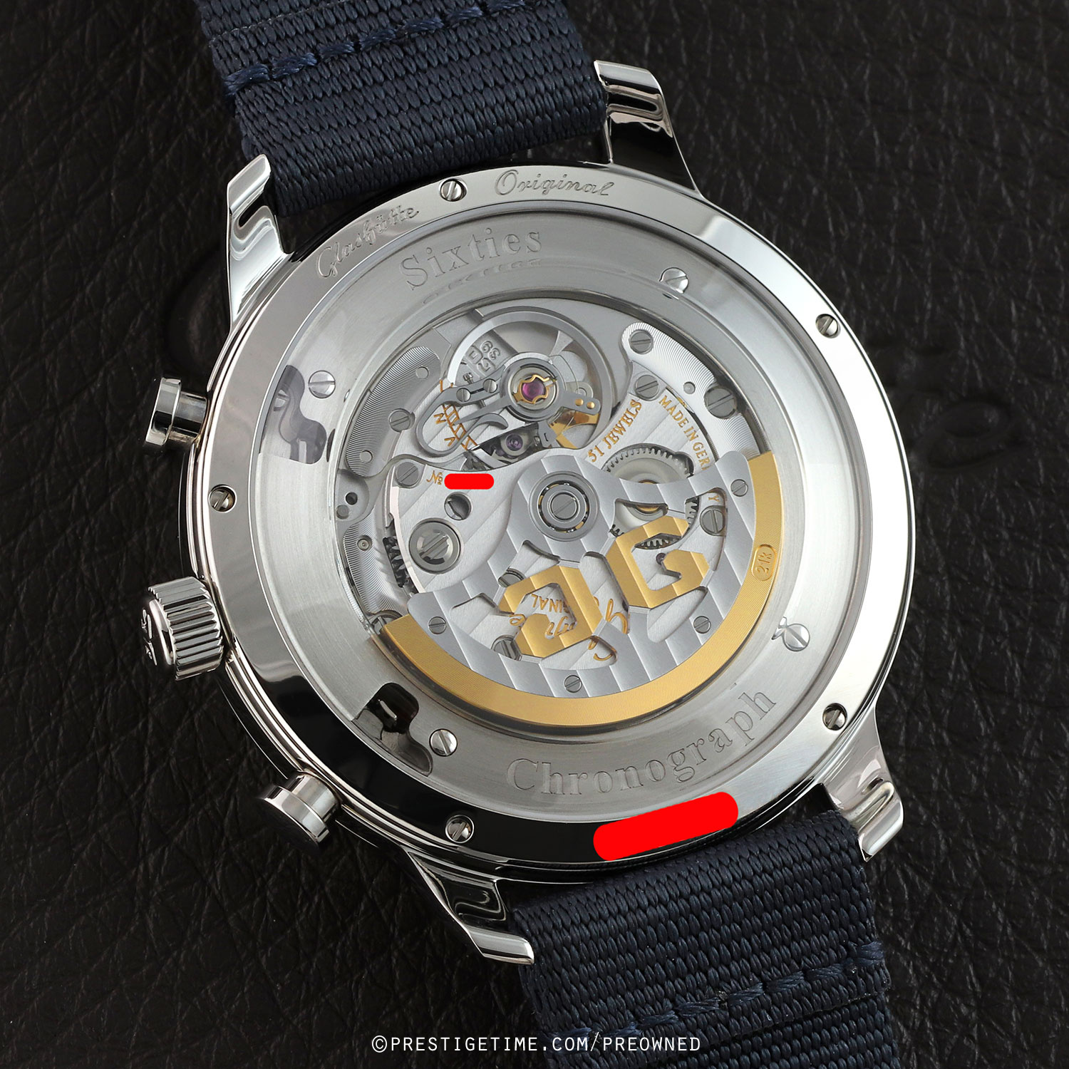 Movement: Powered by a Glashutte Original in-house caliber 39-34, beats at 28,800 vph (4Hz), contains 51 jewels & has a power reserve of 38 hours. The movement is exquisitely finished, the three-quarter plate is decorated with a Glashütte stripe finish & features a