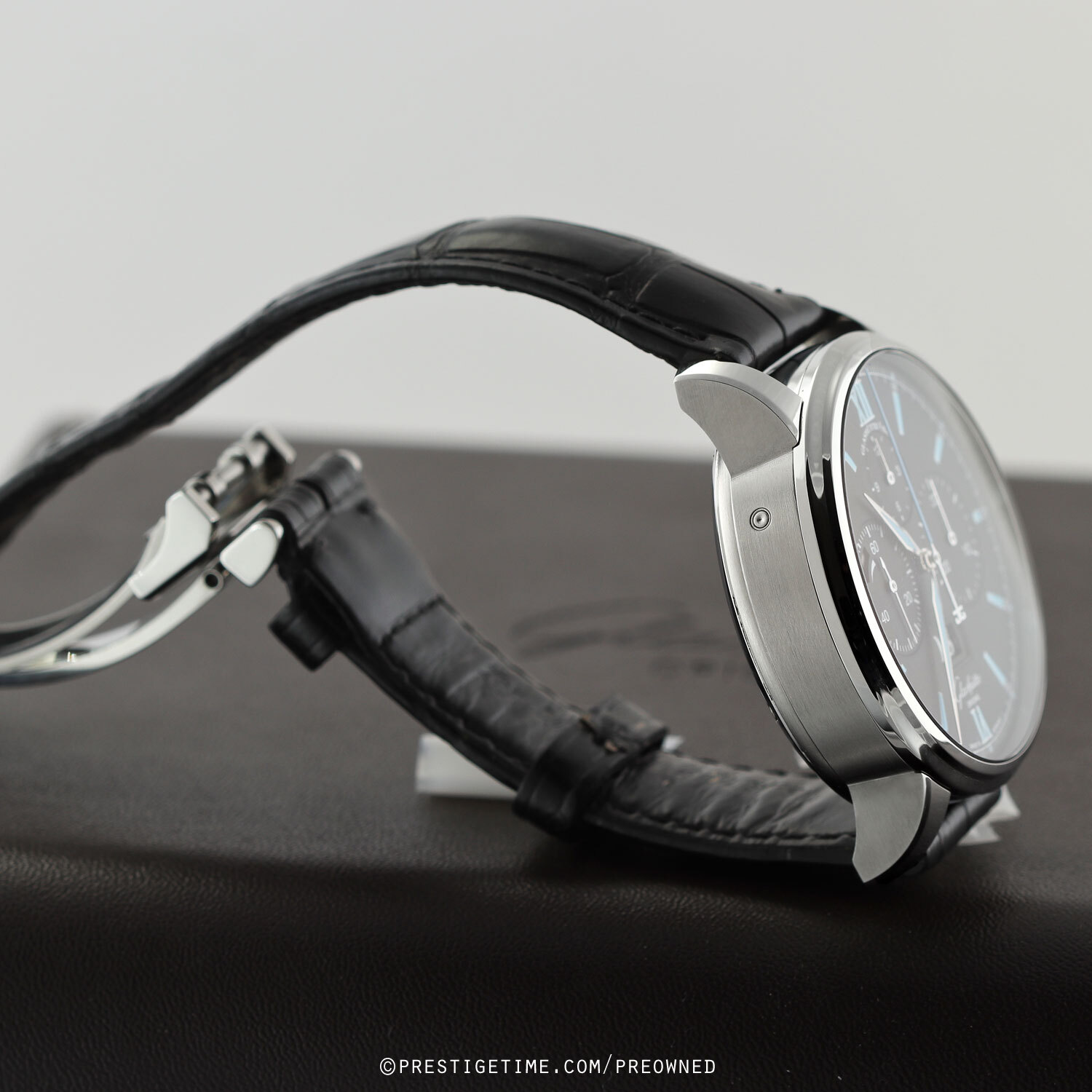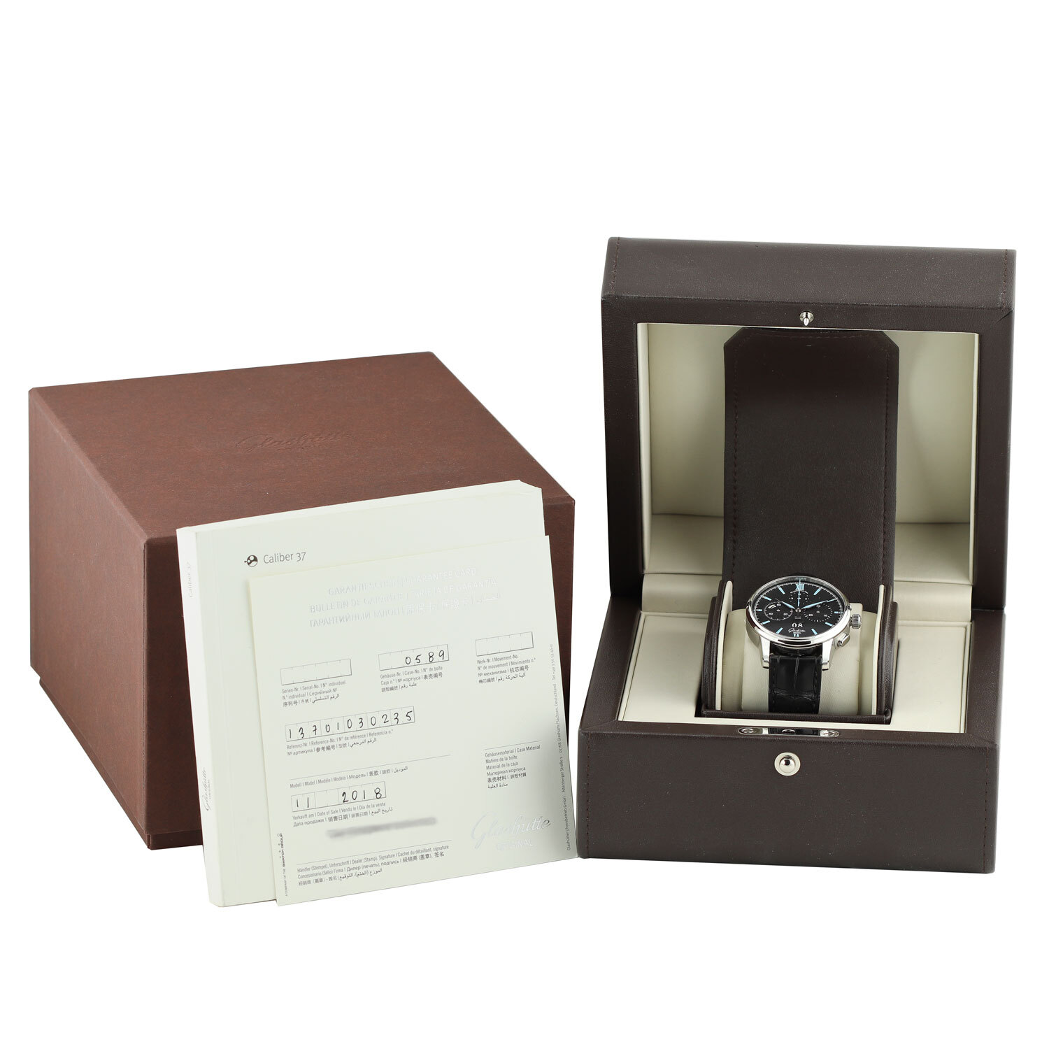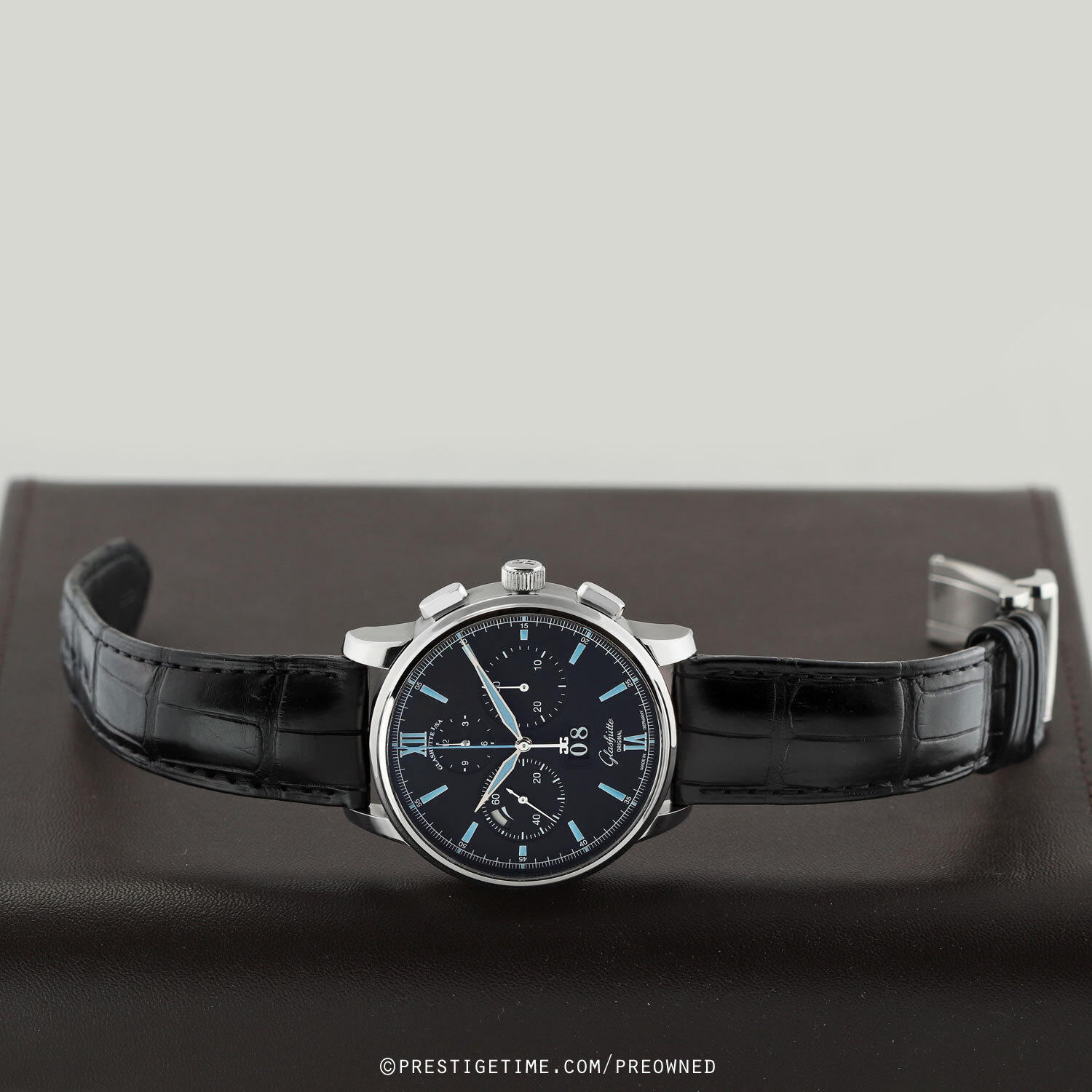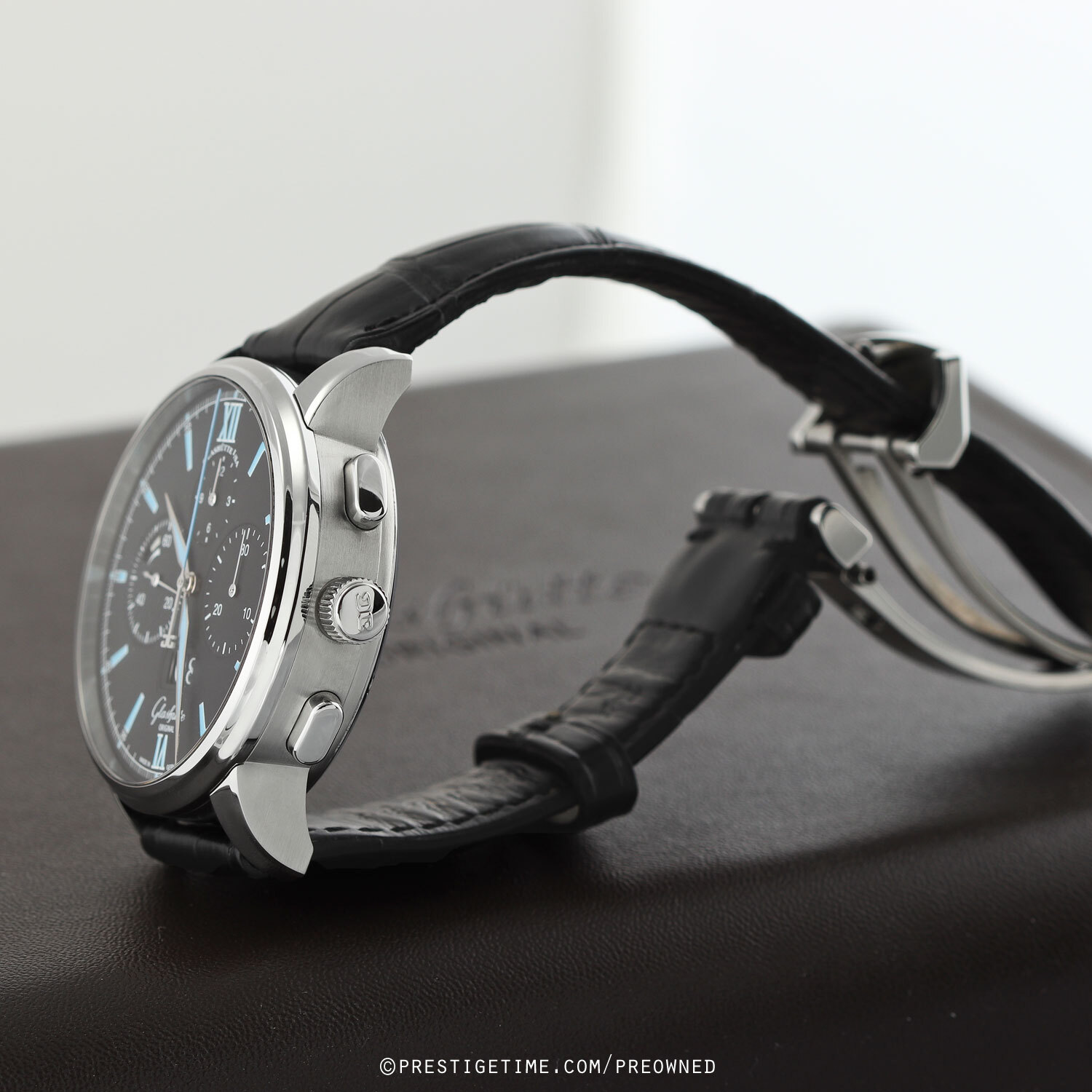 Strap: Fitted on an original/OEM Glashutte Original black alligator strap with deployant buckle. The strap is in excellent near-new condition with most of its wear life-span remaining. We would categorize this strap as being in 95% condition.