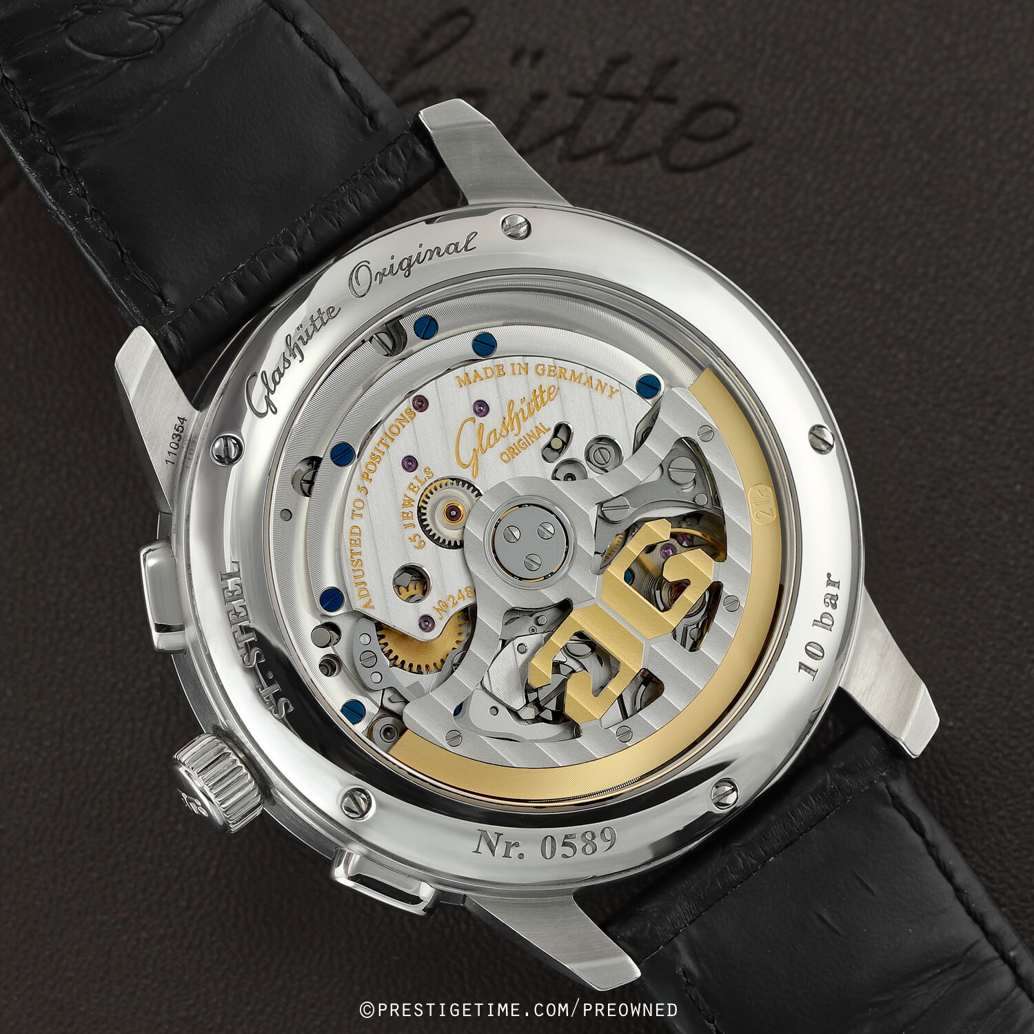 Movement: Powered by an in-house Glashutte Original caliber 37-01 which beats at 28,800 vph (4Hz), contains 65 jewels & has an power reserve of +/- 70 hours. The movement is exquisitely finished with beveled & polished corners, blued screws & Glashutte stripe finish. The rotor features a 21 ct gold edge & is skeletonized with the Glashutte logo.