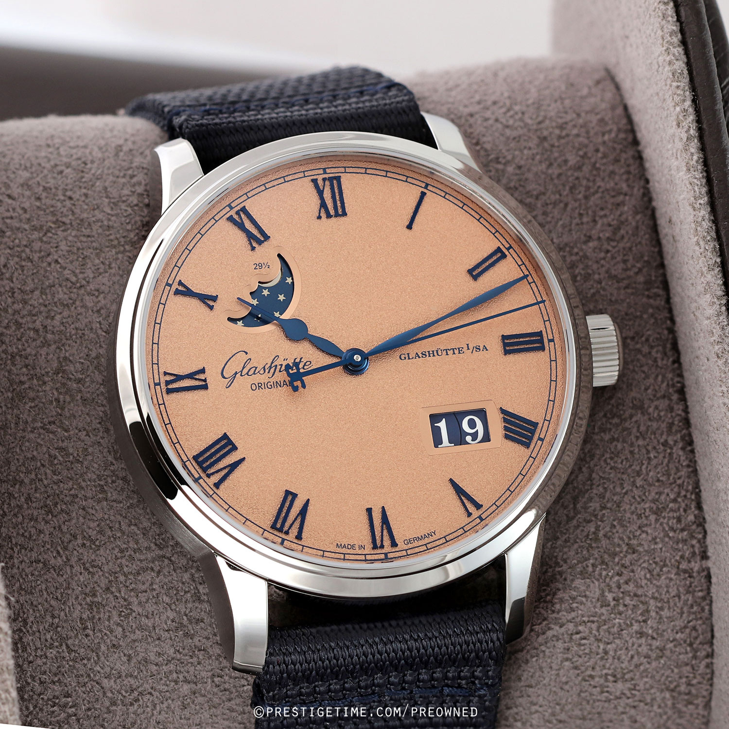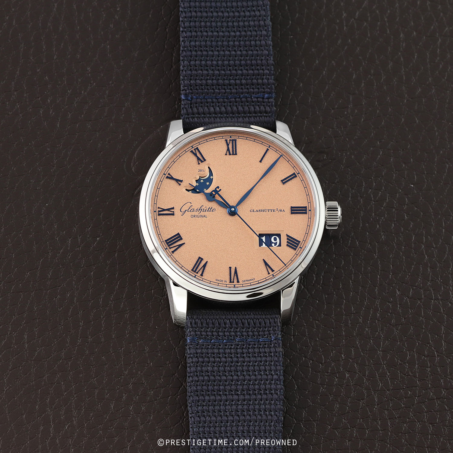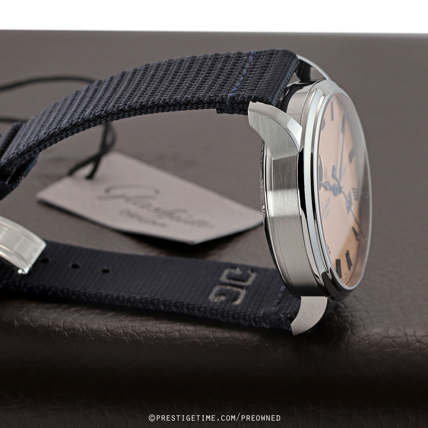Strap: Fitted on its original Glashutte Original navy-blue fabric strap with a stainless steel deployant buckle. The strap is unworn, in new condition with its full wear lifespan remaining.