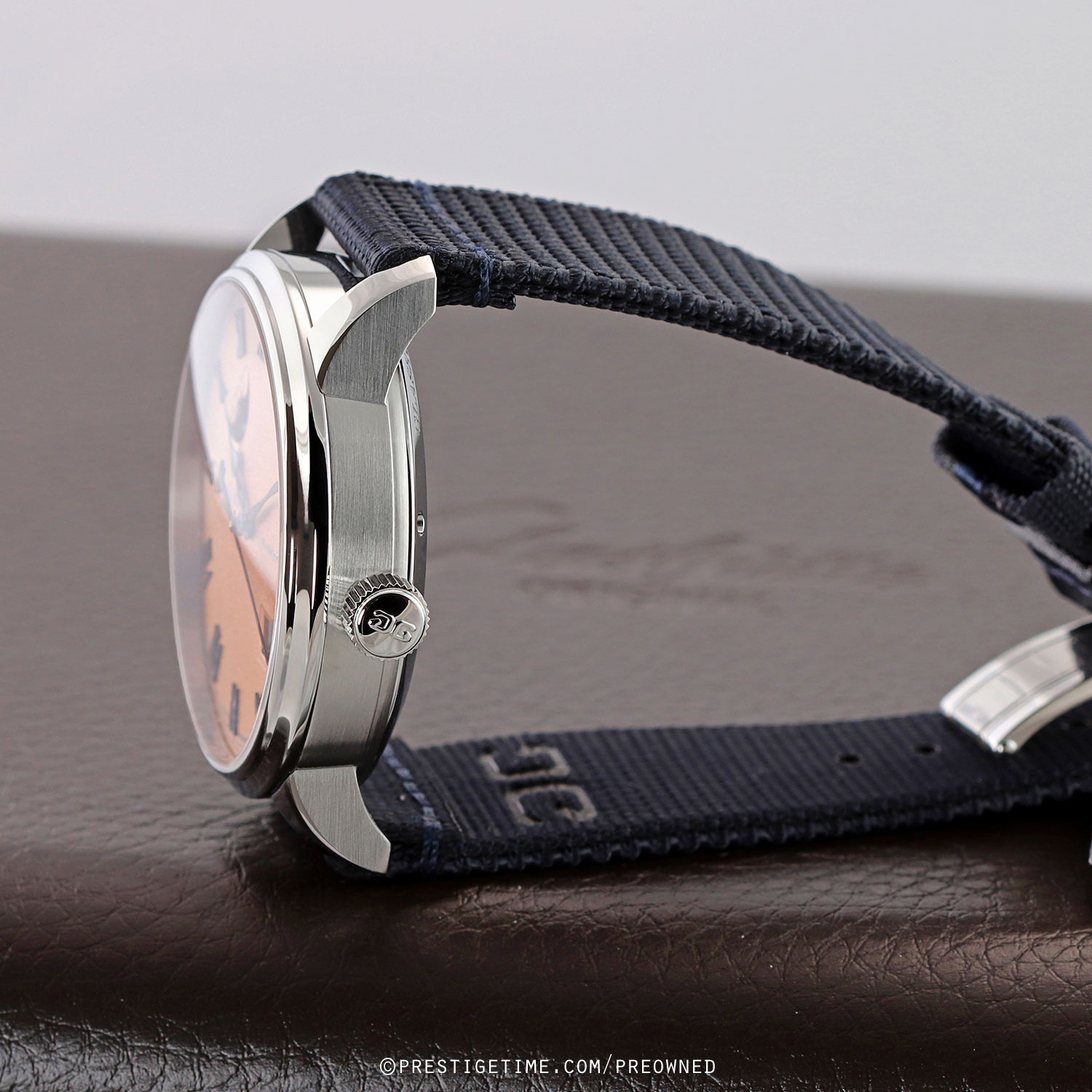 Case: Brushed & polished stainless steel case. Copper(pink/salmon) colored dial with a fine frosted finish. Blued steel hands. Applied blue PVD coated white gold Roman numeral hour markers. Fine printed minutes/seconds track.