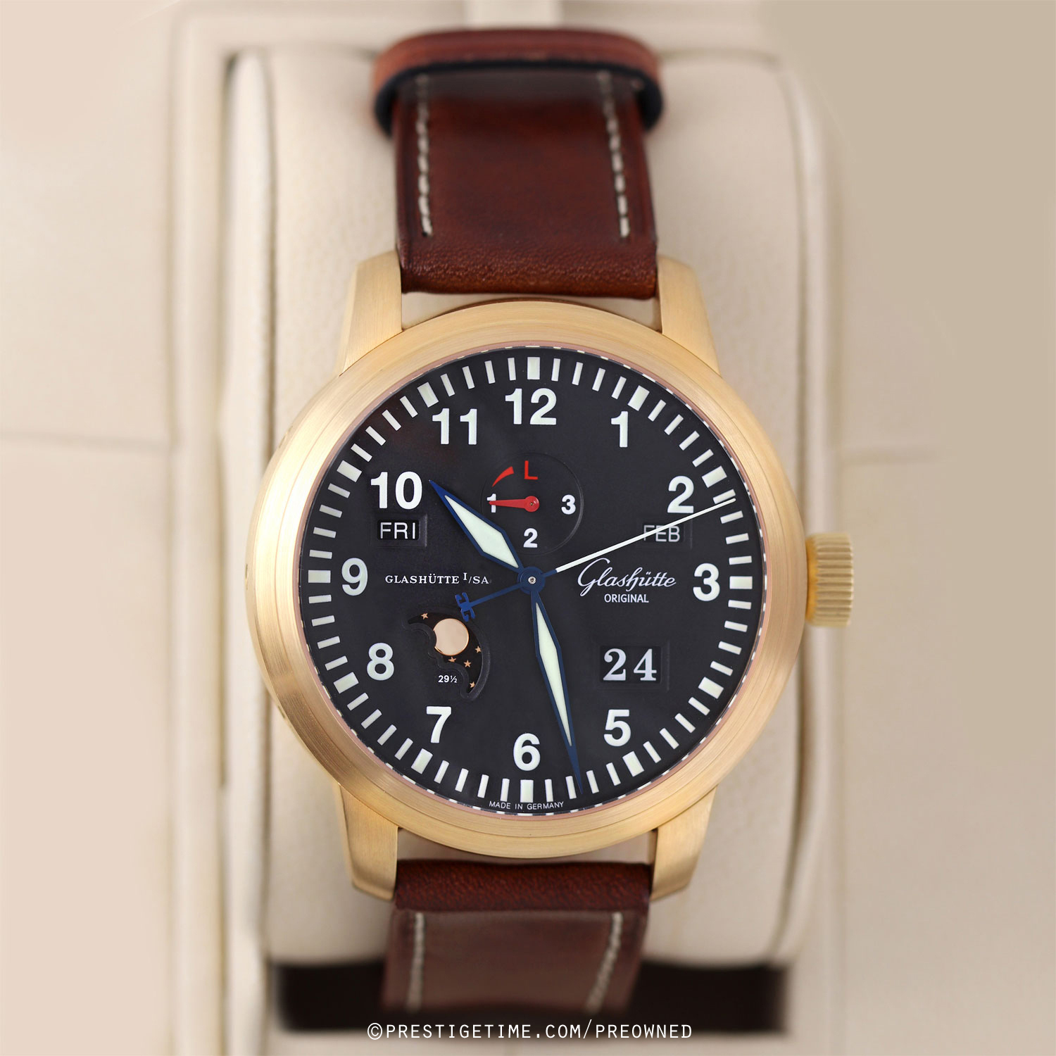 - Leap year indicator sub-dial beneath 12 o'clock.