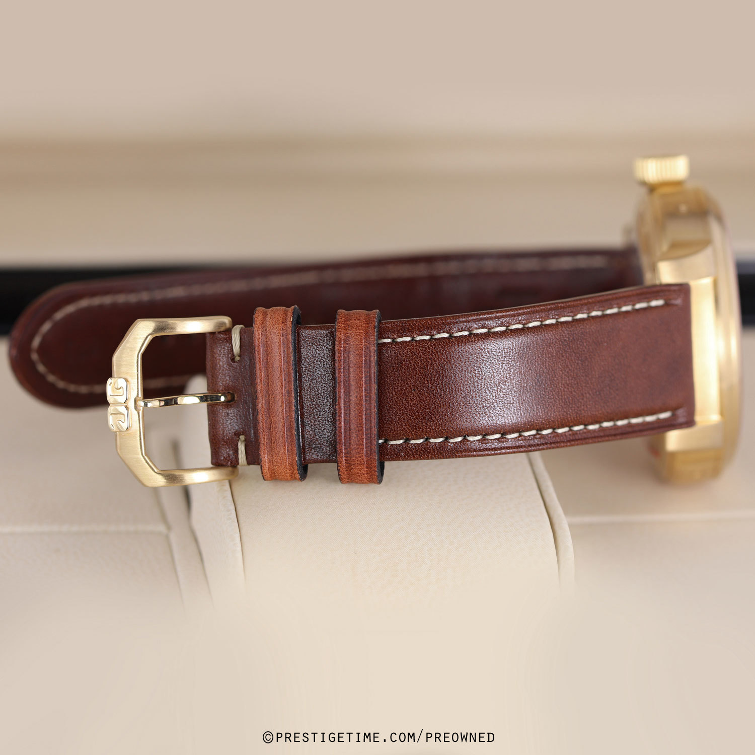Strap: fitted on an unworn stressed brown calfskin strap with a rose gold tang buckle.