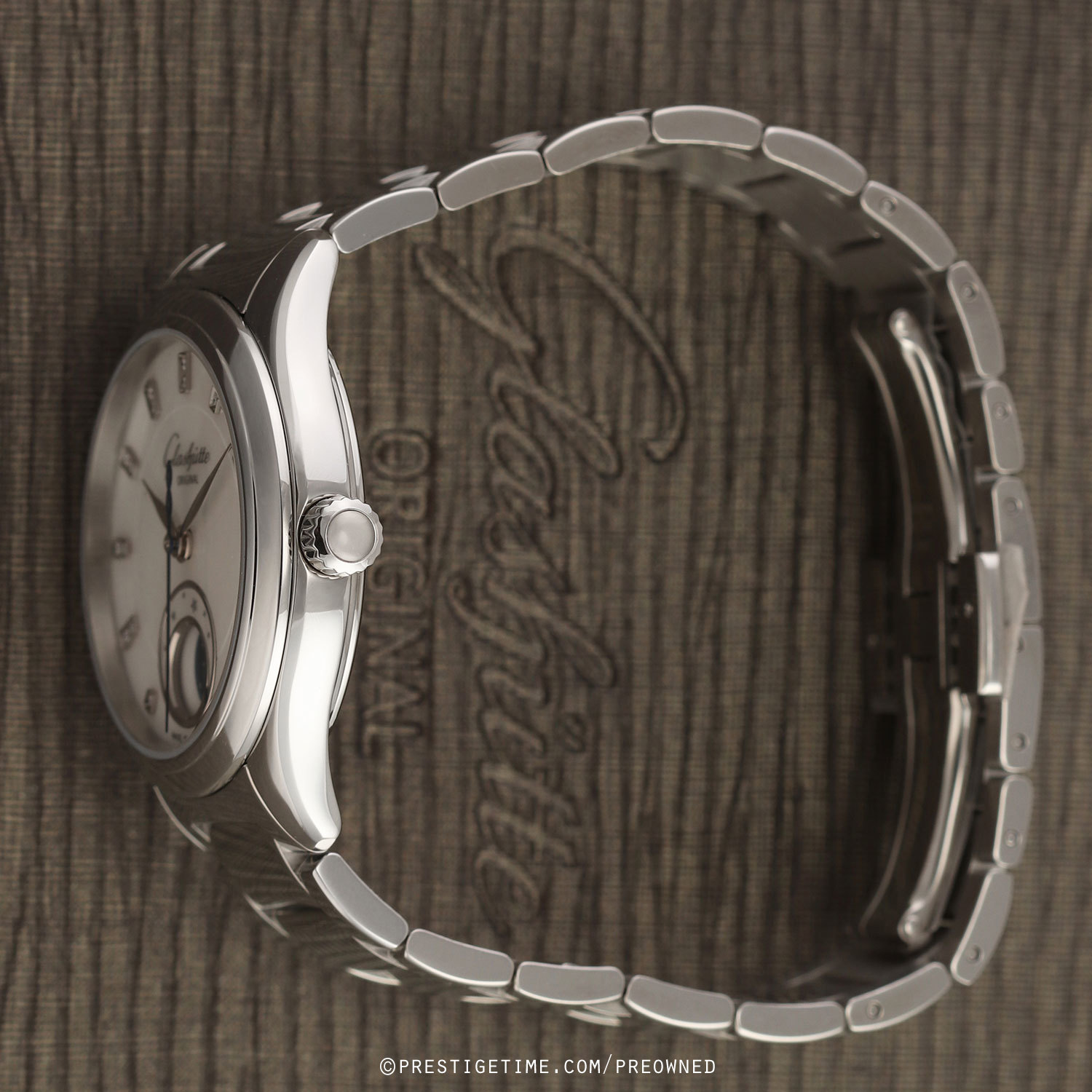 Case: Polished stainless steel case. Polished stainless steel crown set with a natural colored moonstone. Natural white mother of pearl dial. Polished hour & minute hands, blued steel seconds hand. Applied polished index hour markers set with 20 diamonds weighing a total of +/- 0.052 carats.