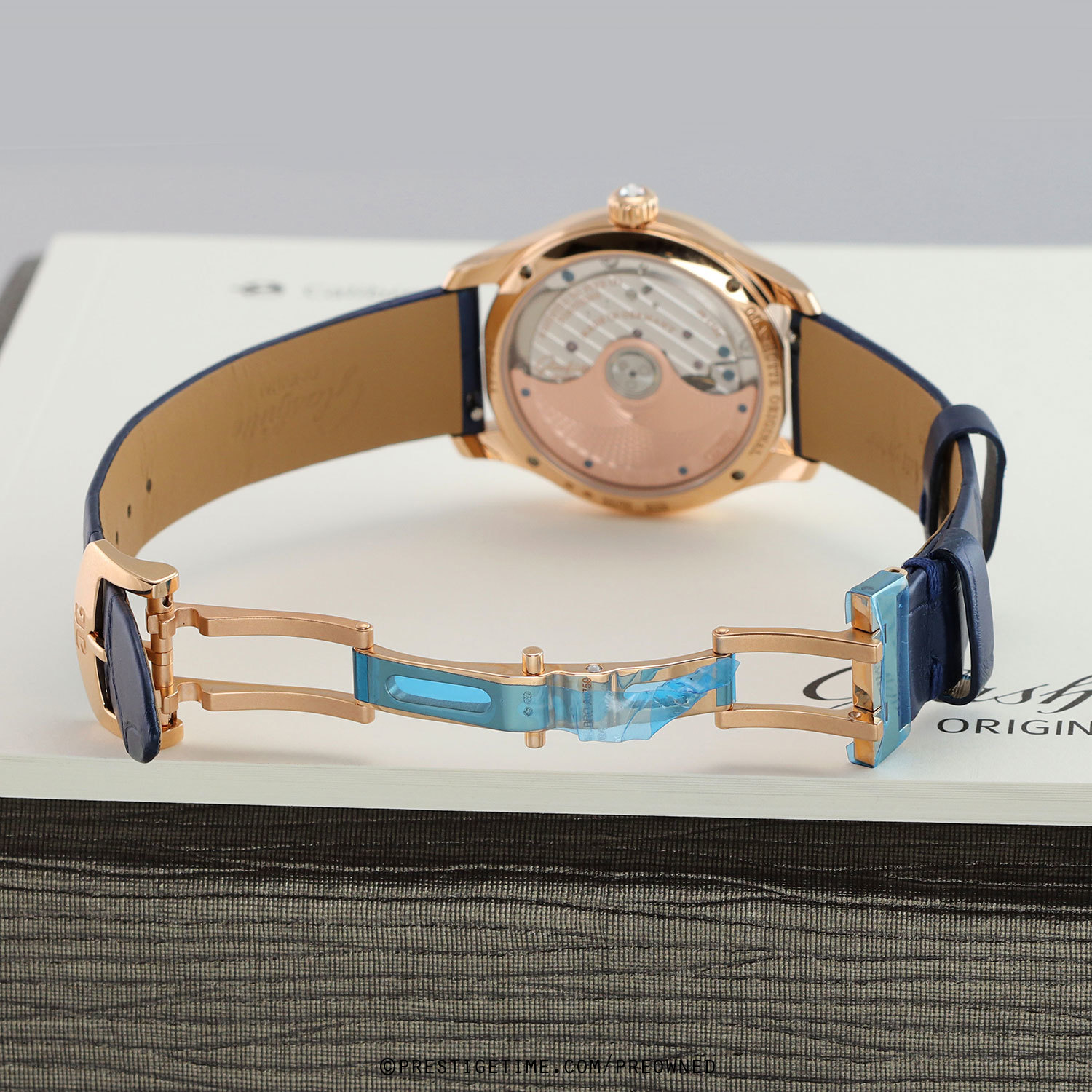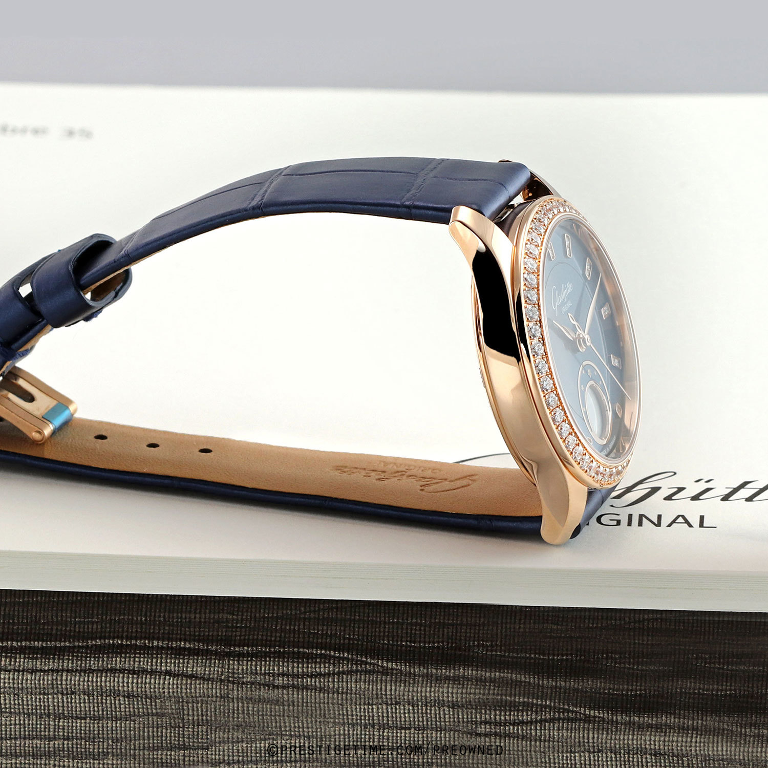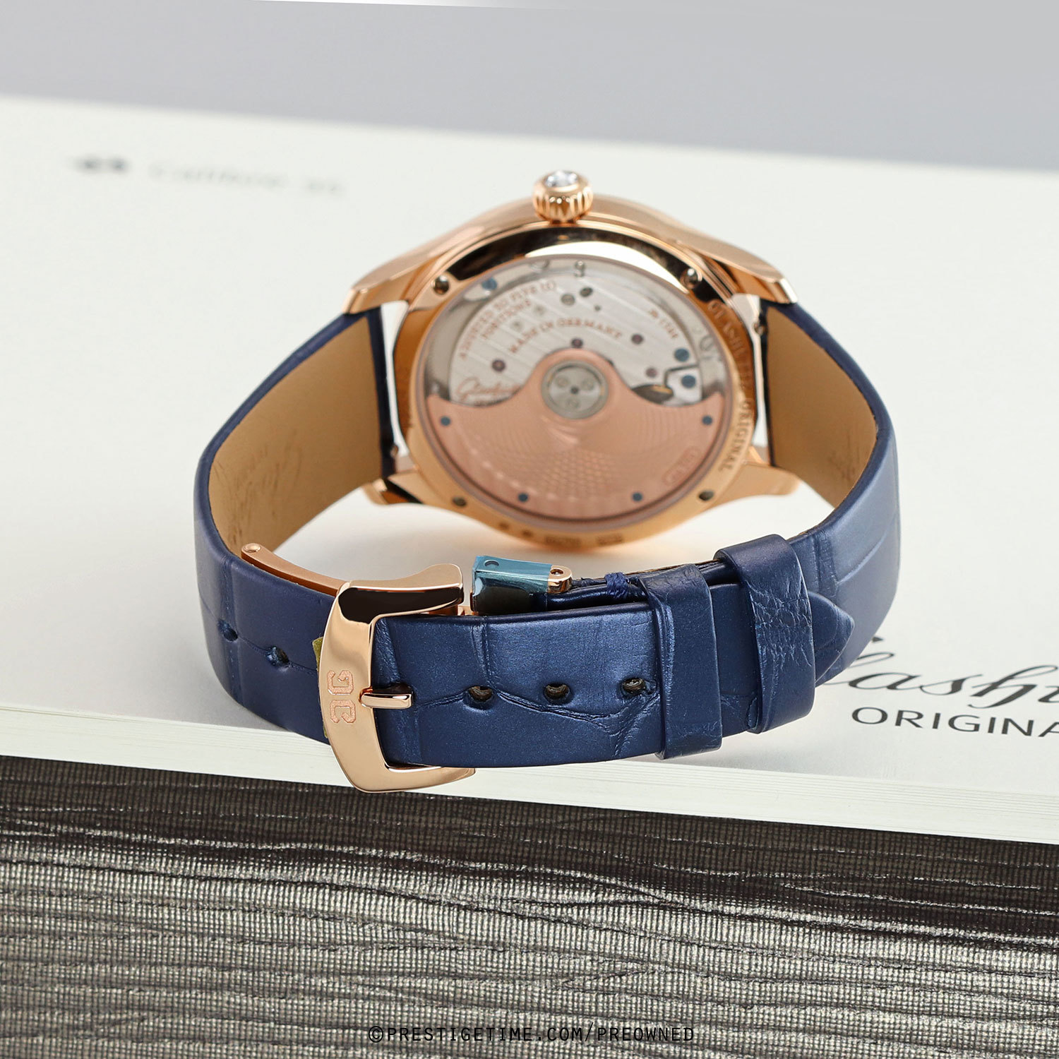 Strap: Fitted on its original Glashutte Original blue alligator leather strap with a polished solid 18kt rose gold push-button deployant buckle. The strap is unworn in new condition with its full wear lifespan remaining.