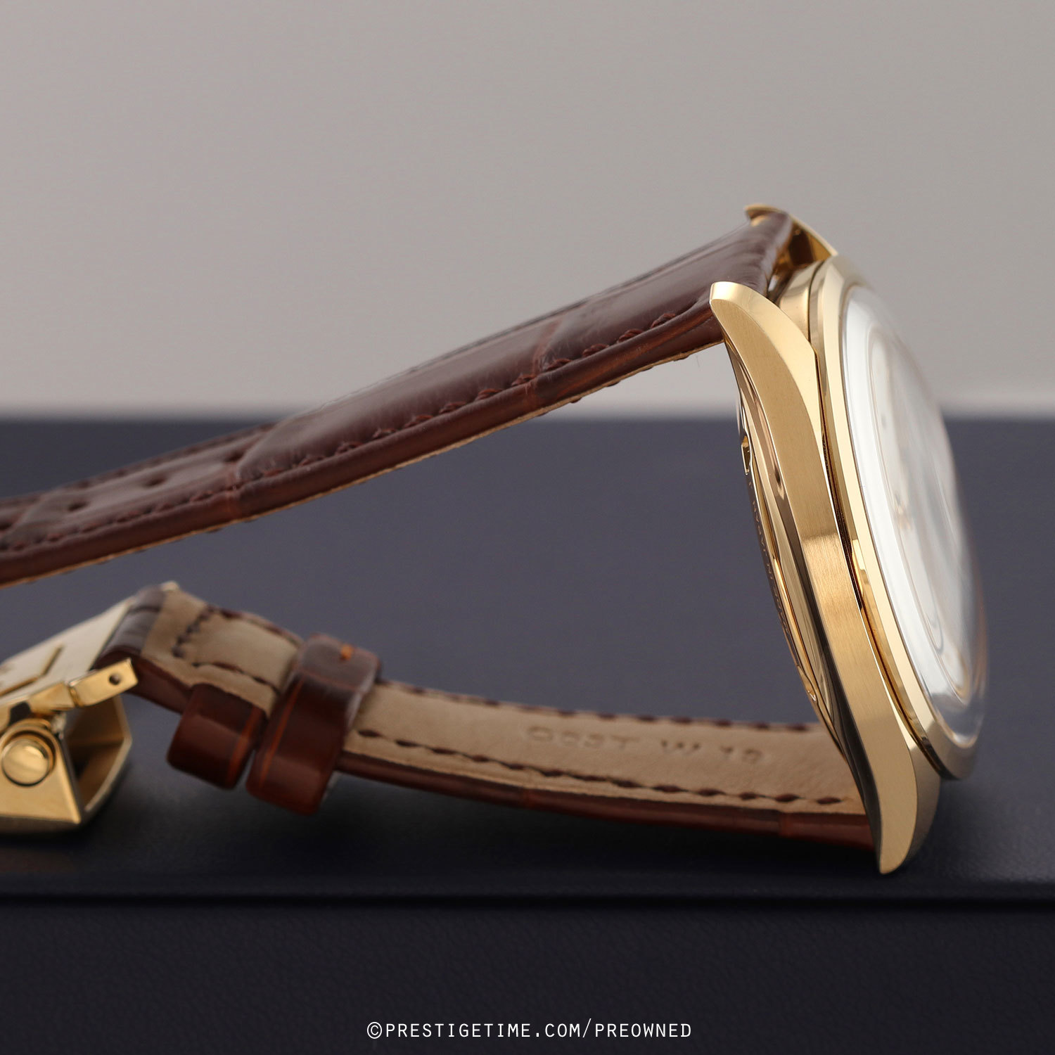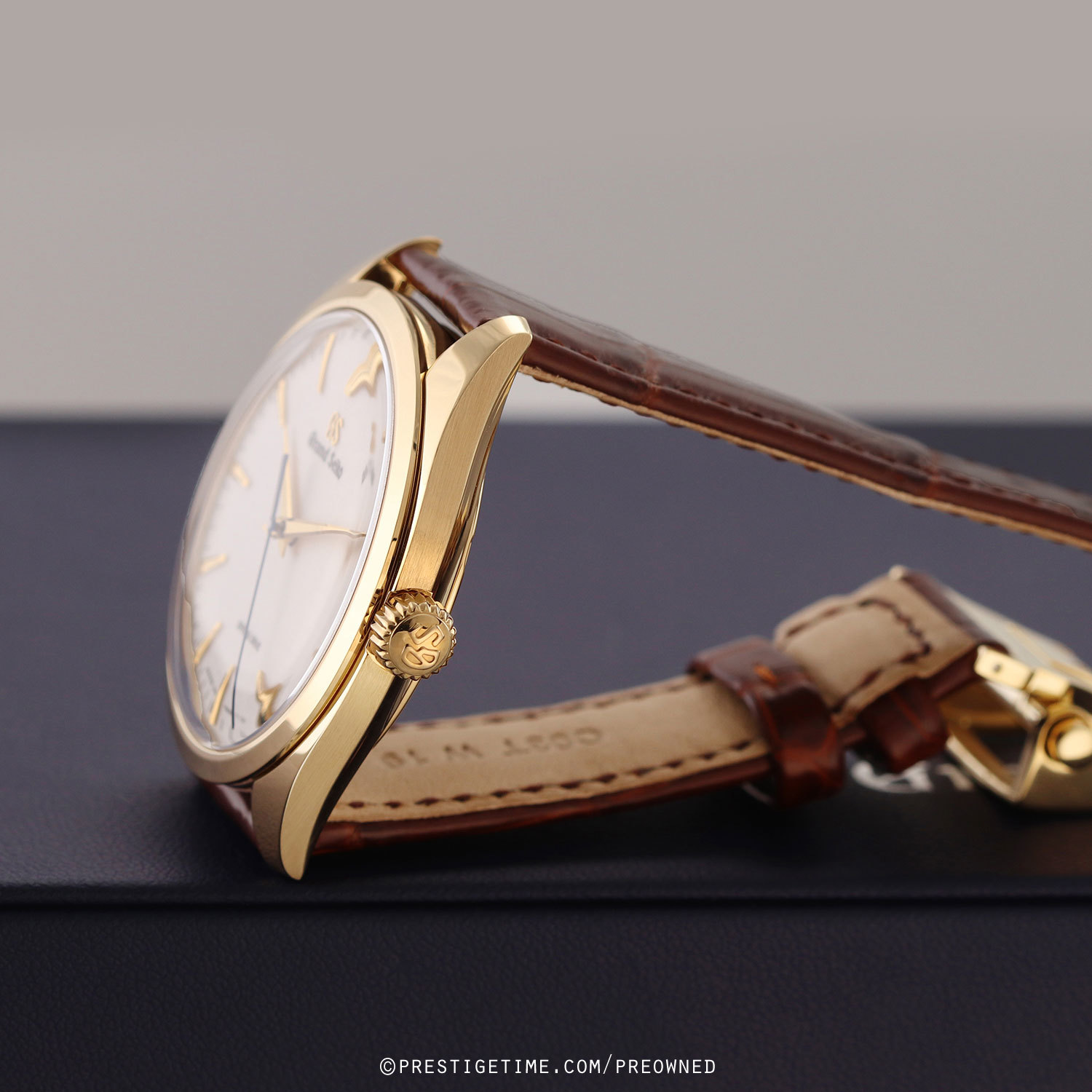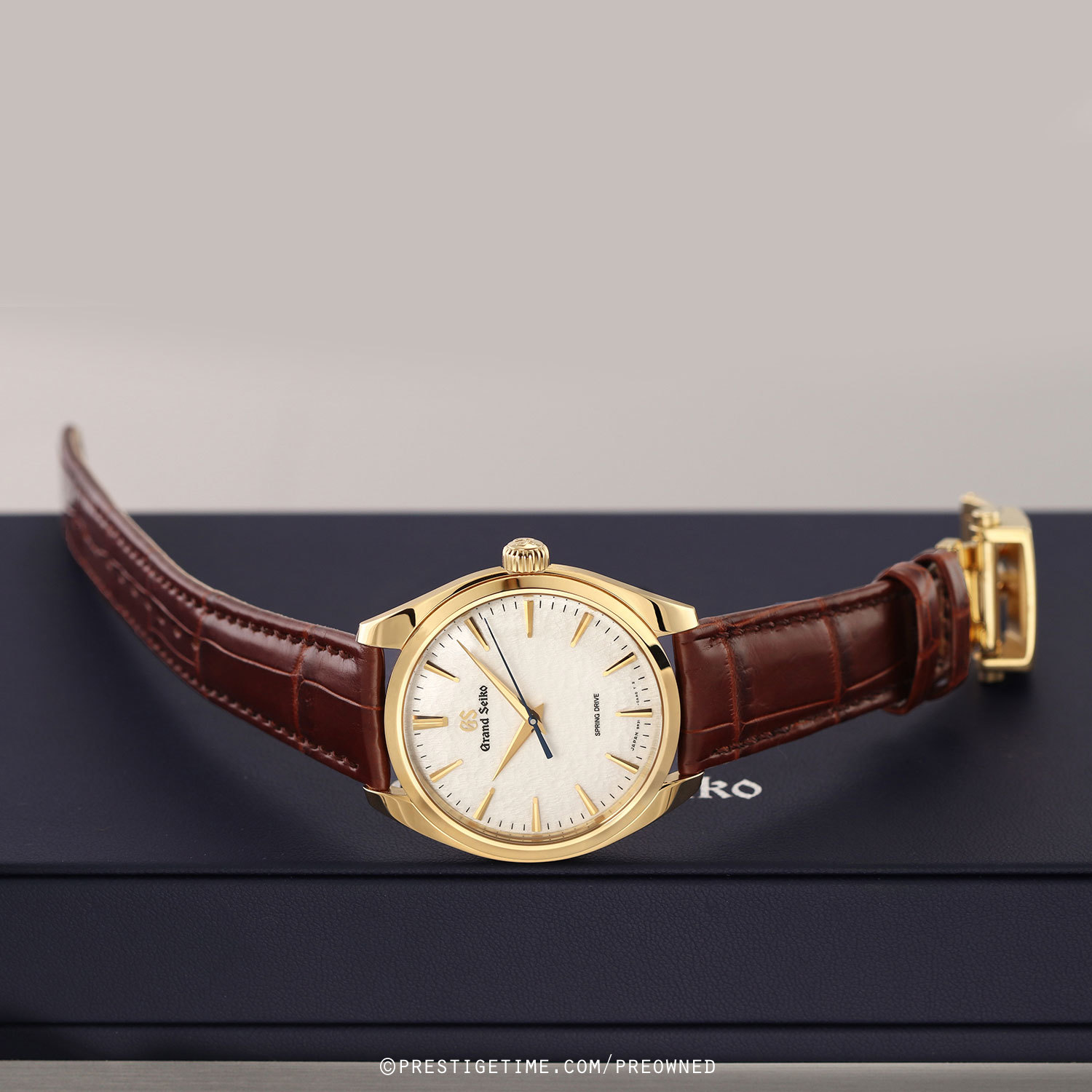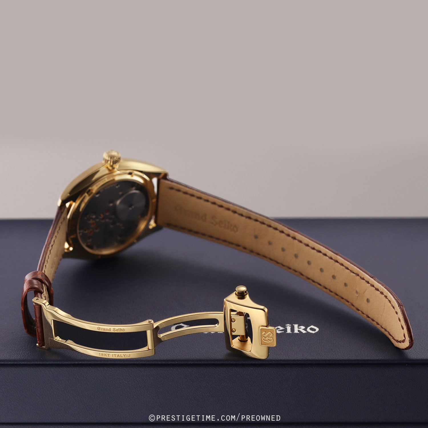 Strap: Fitted on brand new GS original brown alligator leather strap with a solid 18kt yellow gold push-button deployant buckle. The strap is brand new in unworn condition with its full wear lifespan remaining.