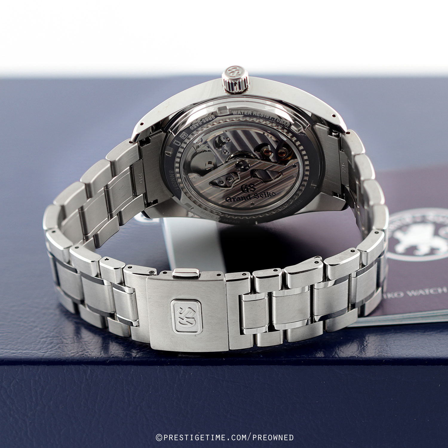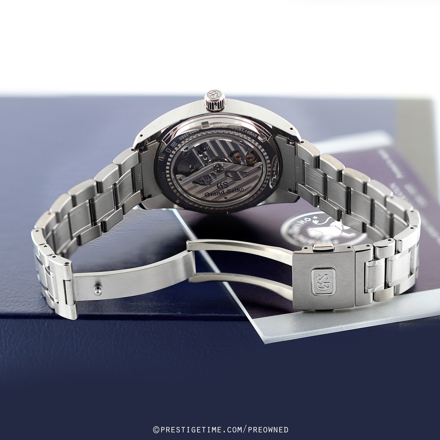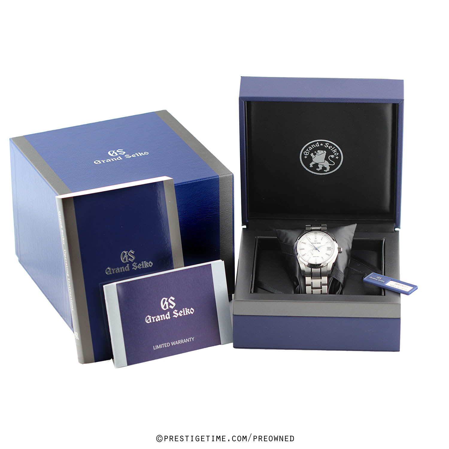 Case: Brushed & polished titanium case. The dial features Grand Seiko's very unique snowflake textured dial. Faceted brushed & polished hour & minute hands. Blue steel central seconds hands. Applied brushed & polished faceted index hour markers. Fine printed minute/seconds track. Date window at 3 o'clock.
