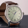 Case: Polished stainless steel case. Light mint green dial with a very fine shimmering texture. Polished hands. Applied polished index hour markers. Fine printed minute/seconds track. Boxed (domed) sapphire crystal.