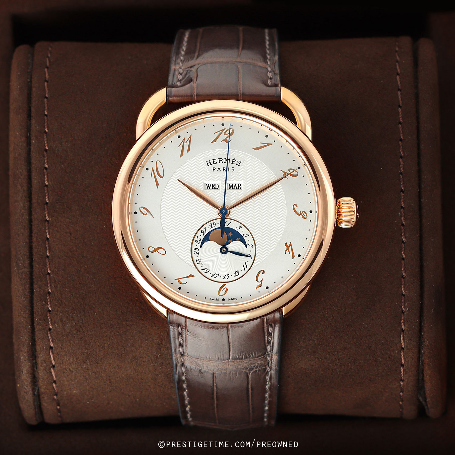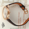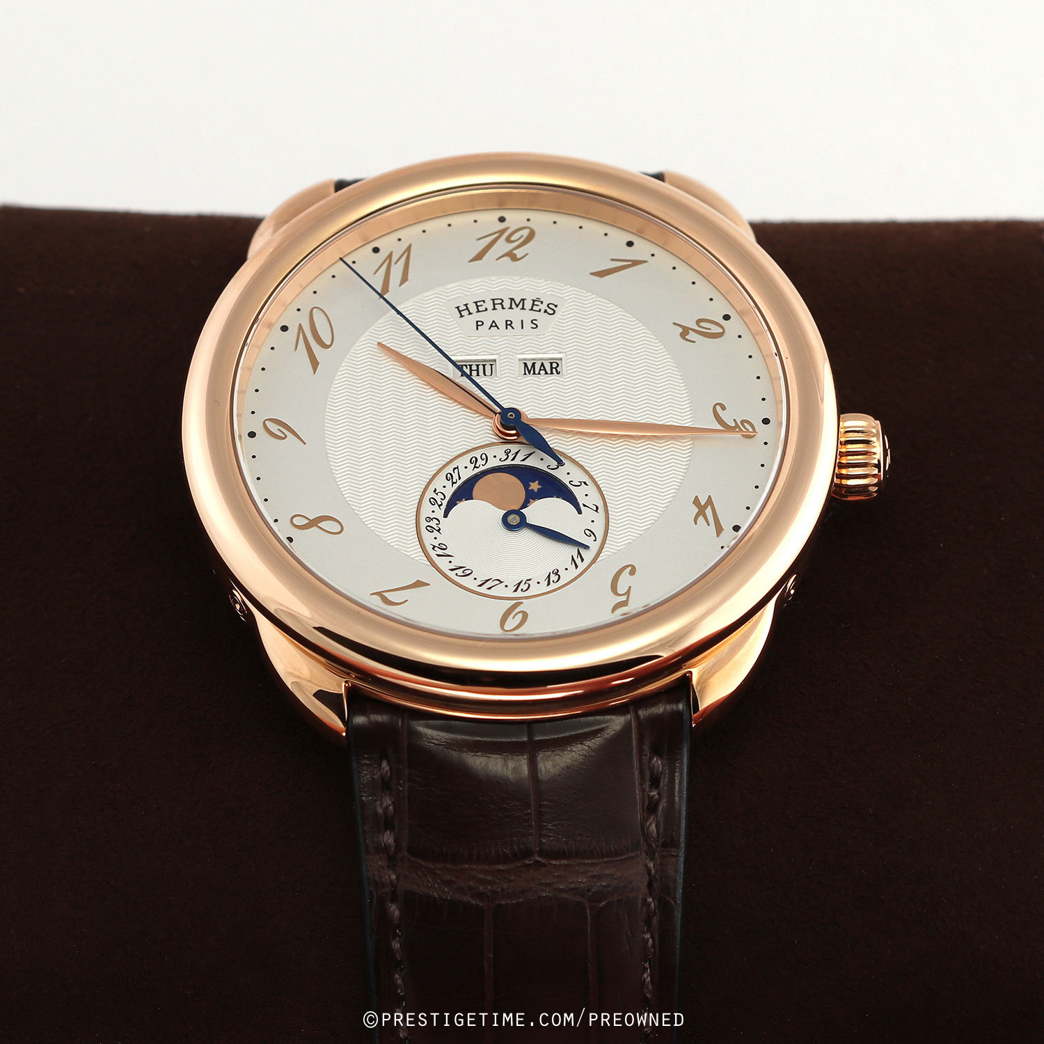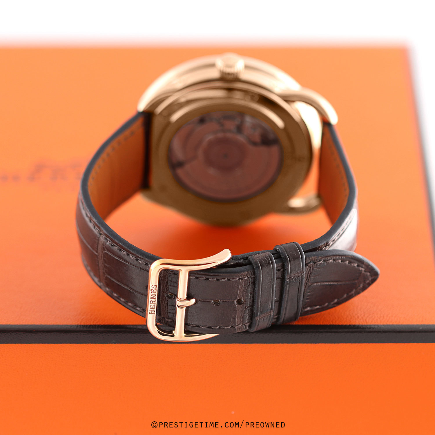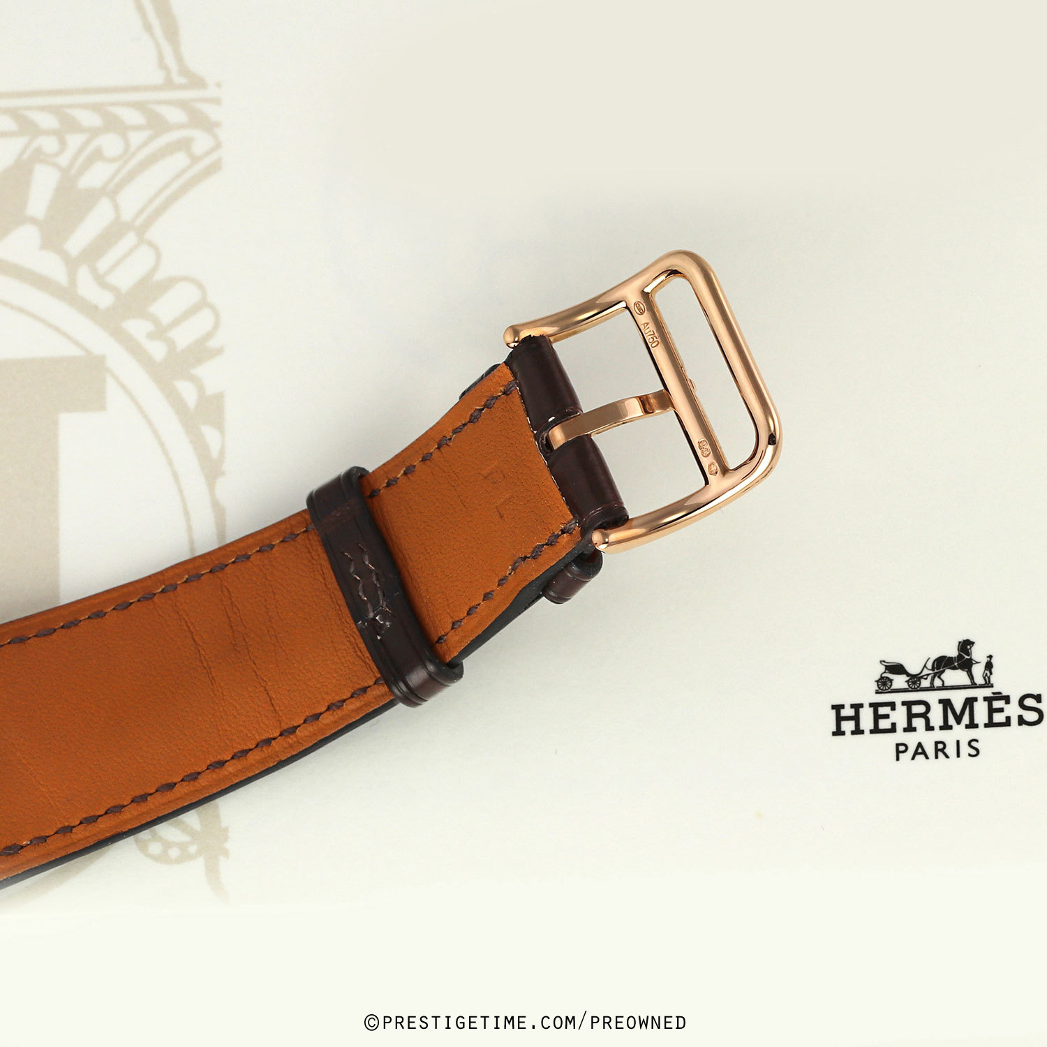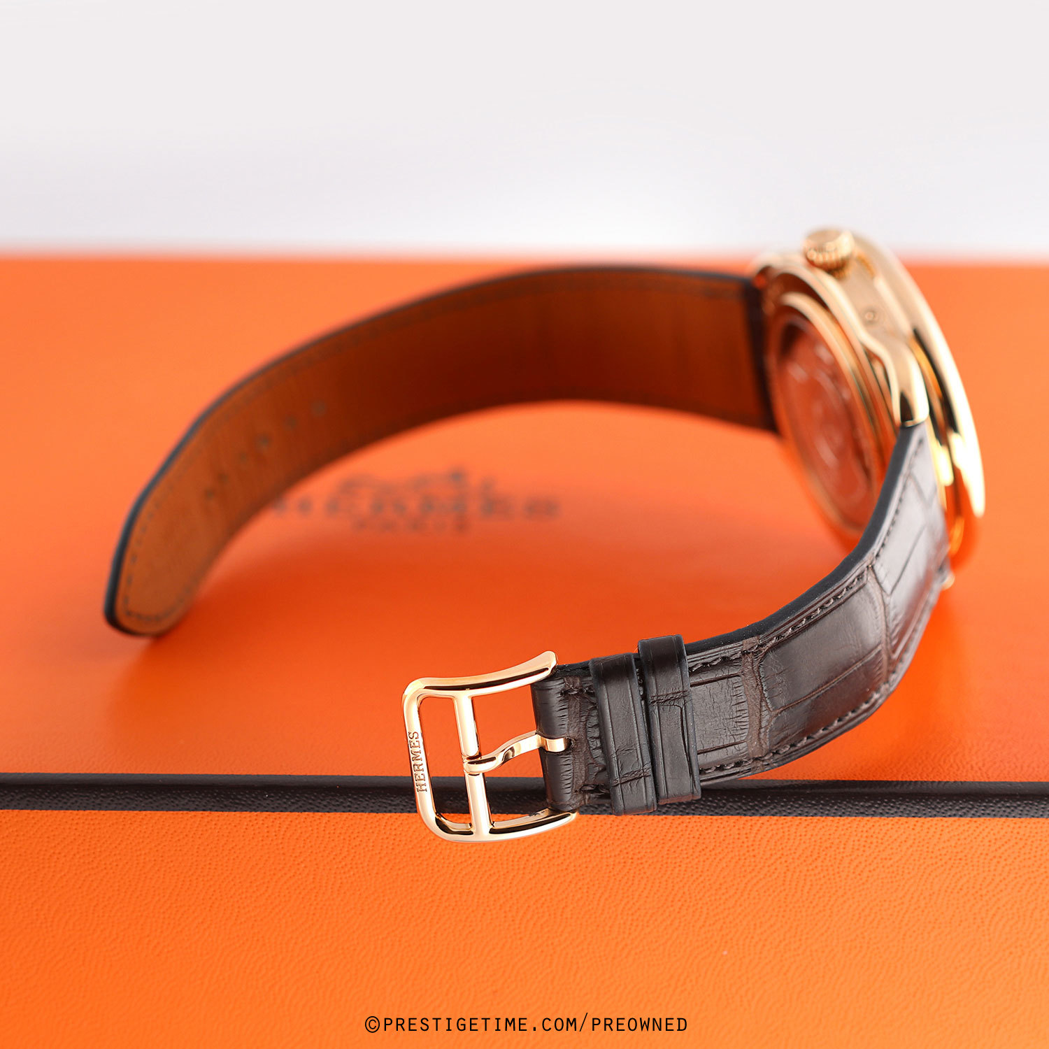 Strap: Fitted on its HERMES original Havana-brown alligator leather strap with a 18kt rose gold tang buckle. The strap is in excellent, near new condition with almost no signs of wear & its full wear lifespan remaining. We would rate the strap as in 98% condition.