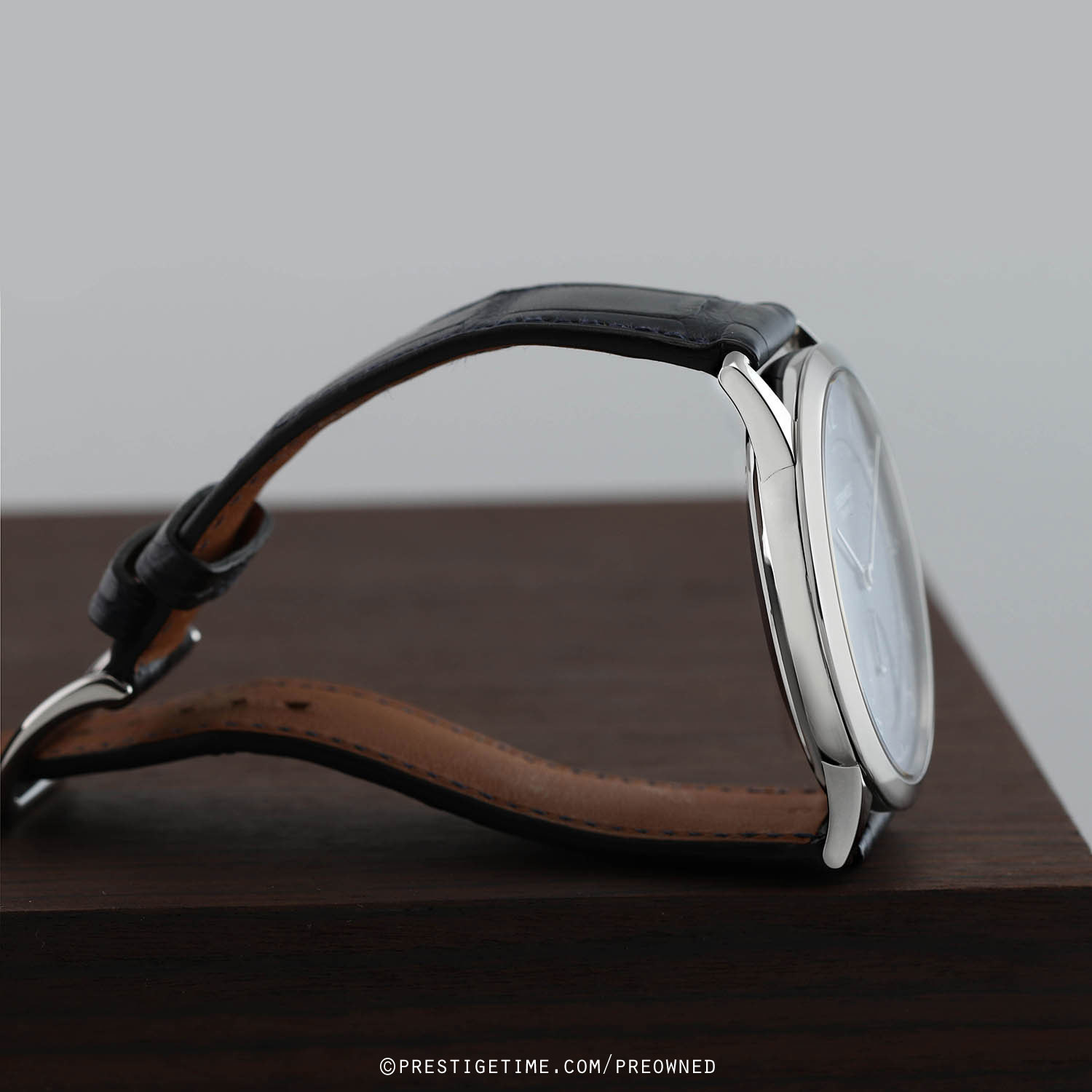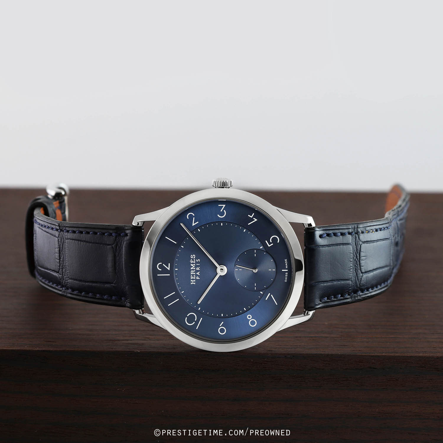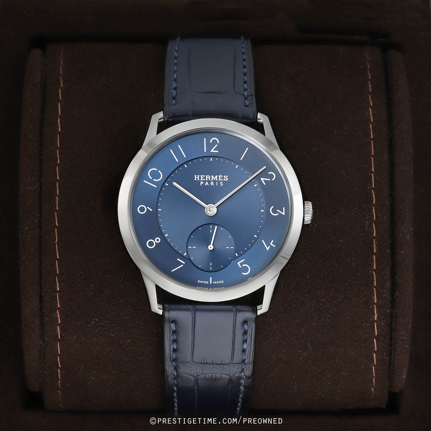Strap: Fitted on its Hermes original blue alligator leather strap with a stainless steel tang buckle. The strap in excellent condition with plenty of wear lifespan remaining. We would rate the strap as in 95% overall condition.