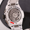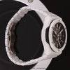Case: Brushed & polished white ceramic case & bezel. The bezel is secured with with 6 H-shaped titanium screws. Titanium crown & chrono buttons with black rubber grips. Transparent sapphire crystal dial showcasing the movement. Brushed hands with luminous fill. Applied index hour markers with luminous fill. Black dial flange & sub-dial rings with minutes/seconds tracks in red & white. Skeletonized date wheel, the current date highlighted with a black background at 3 o'clock. Small seconds sub-dial at 9 o'clock.