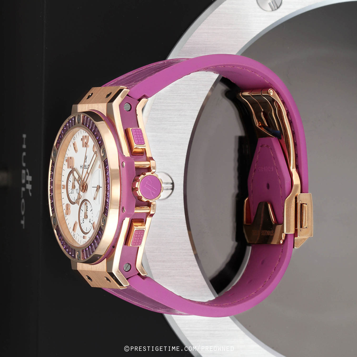 Strap: Fitted on its original Hublot purple gummy-alligator strap (alligator leather top & rubber lining) with a push-button deployant clasp. The strap is new & unworn with its full wear lifespan remaining.