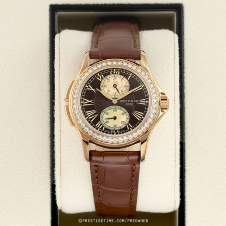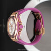 Case: Brushed & polished solid 18kt rose gold case. Solid 18kt rose gold crown & buttons with purple rubber tips. Solid 18kt rose gold bezel with 48 baguette cut purple amethyst mineral stones. Purple composite resin lower-bezel ring & lateral case inserts. White dial. Polished rose gold hands with luminous filled tips. Applied brushed & polished rose gold applique hour markers. Fine printed minute/seconds track. Date window between 4 & 5 o'clock. Small seconds sub-dial at 3 o'clock.
