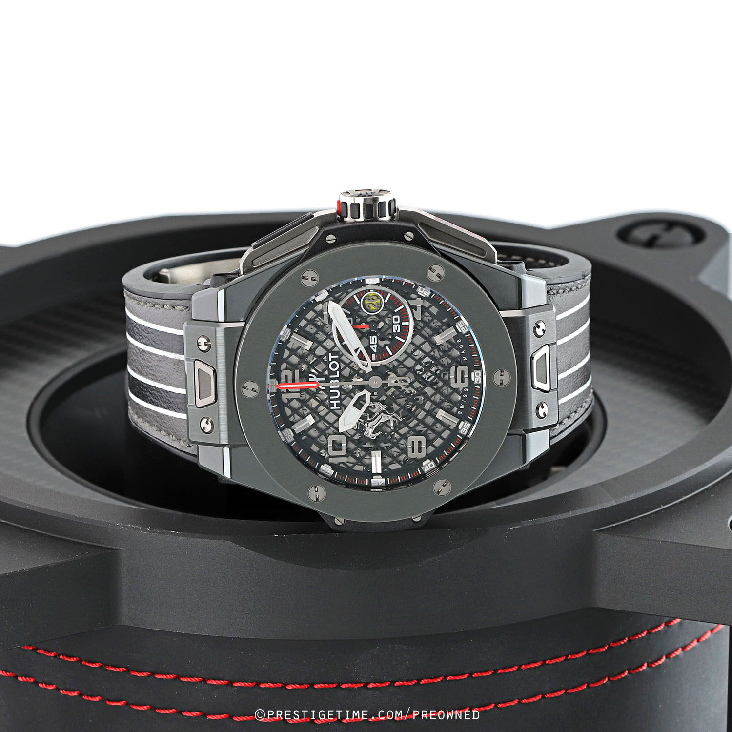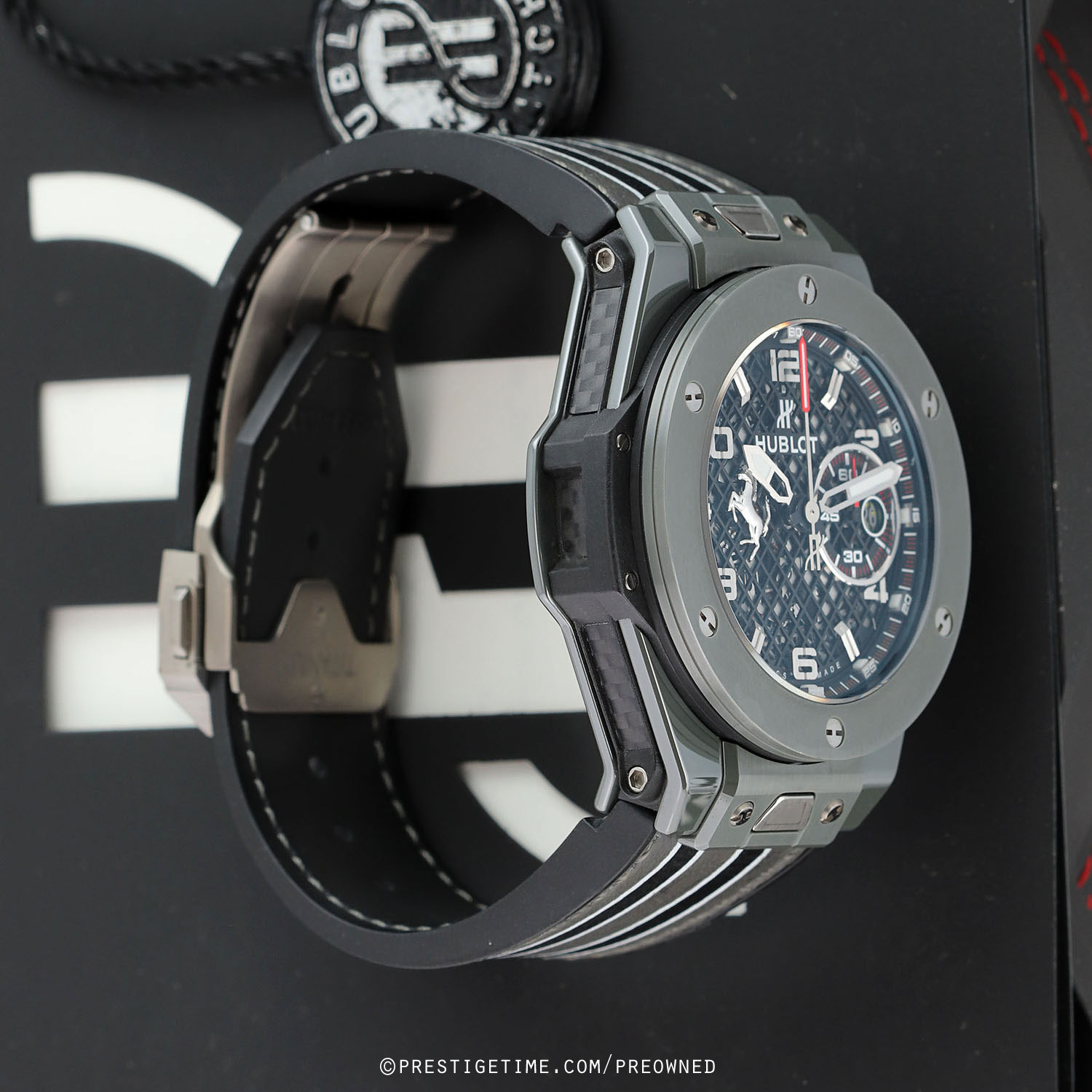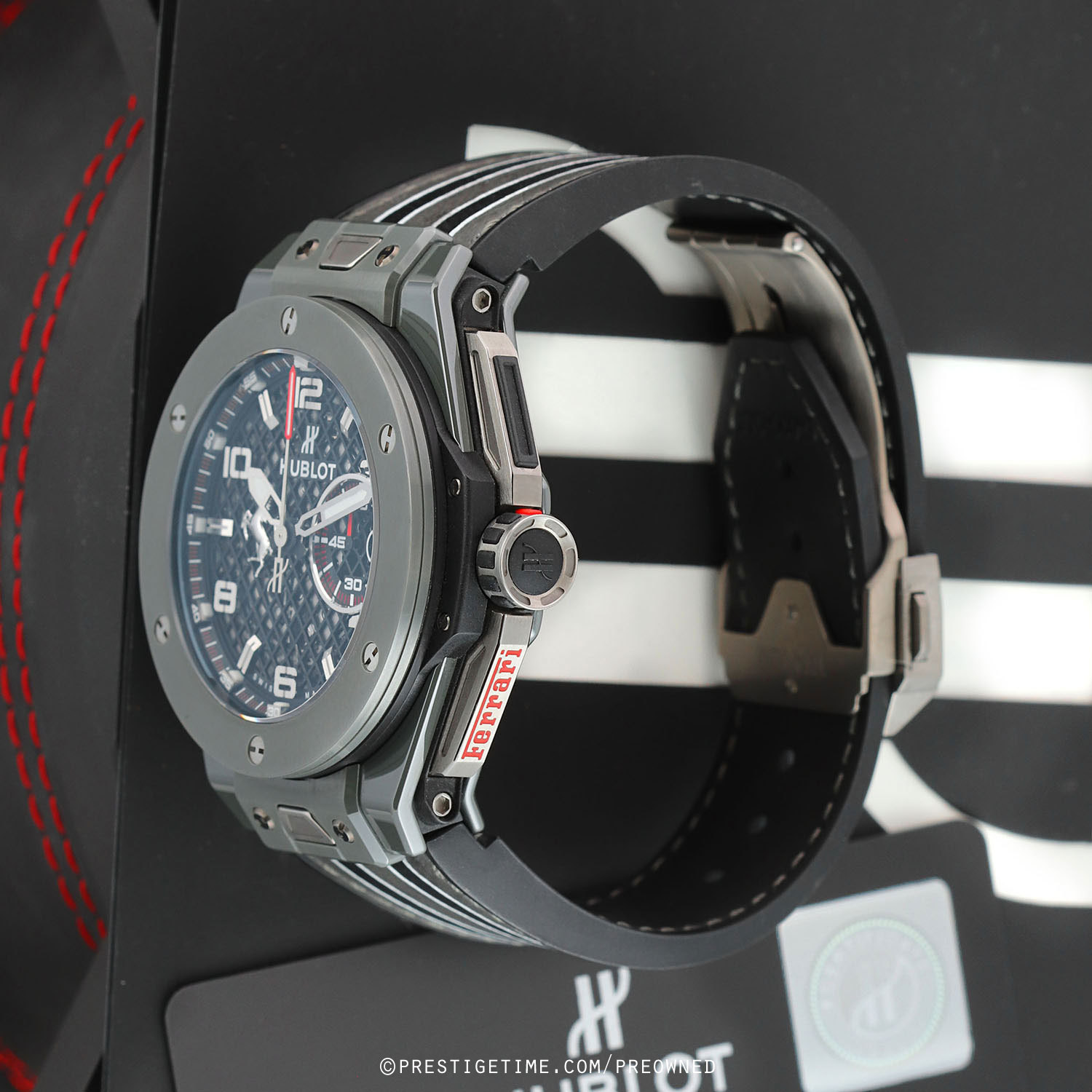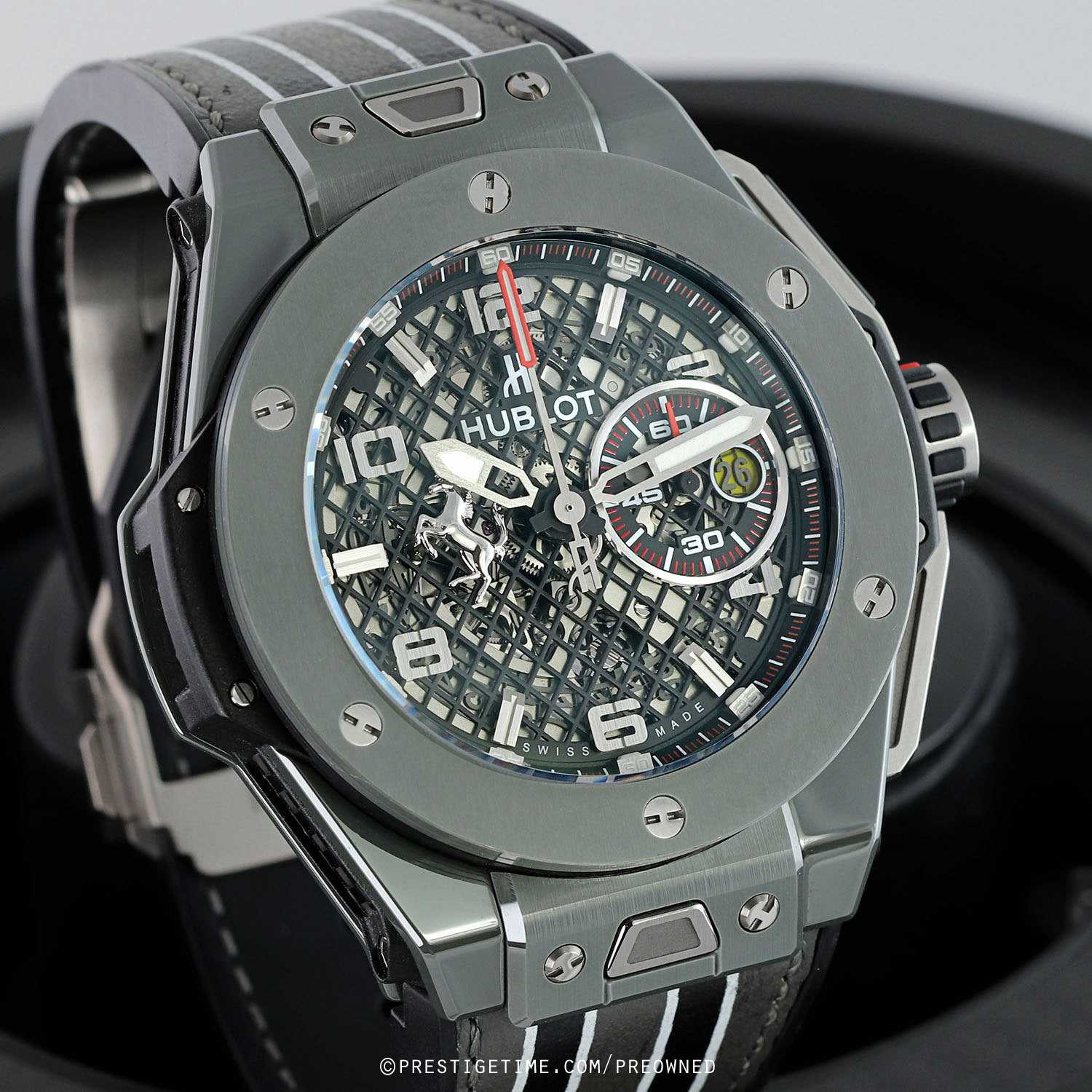 Big Bang Unico FERRARI featuring the famous prancing horse logo on the dial at 9 o'clock. Limited & numbered edition of 250 pieces.