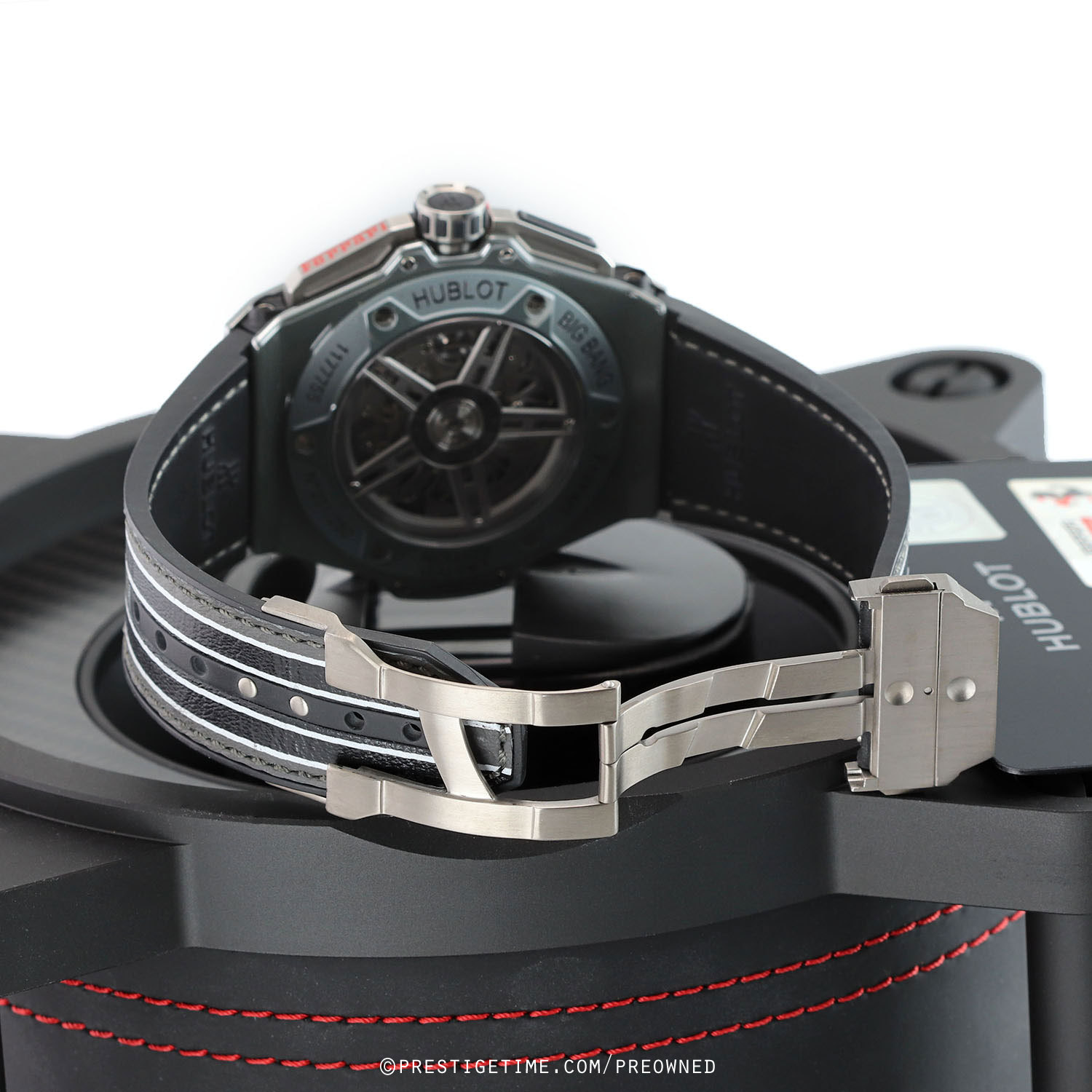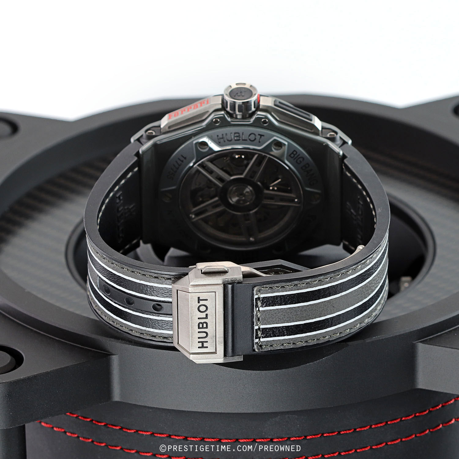- Fitted on its original Hublot grey, white & black striped leather strap with black rubber lining & titanium push-button deployant buckle. This strap is unworn but has some shop-wear from being displayed, yet with its full wear lifespan remaining. We would be comfortable grading the strap in 98%+ overall condition.