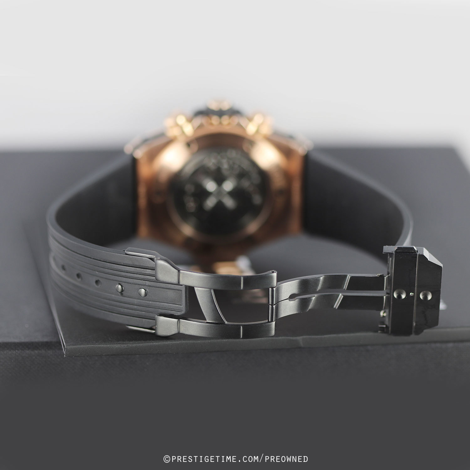 - Fitted on its original black rubber strap & a push-button deployant buckle made of black PVD titanium with 18kt king gold name plate insert. The strap is in perfect near new condition, we would be comfortable in rating the strap at 99% condition.