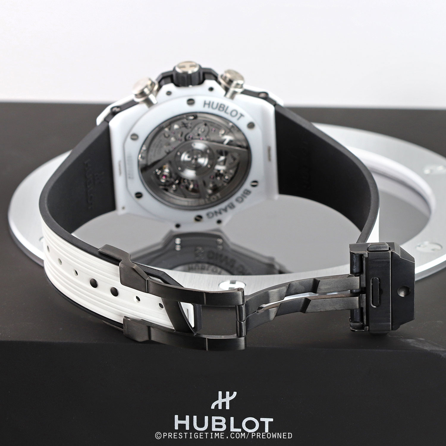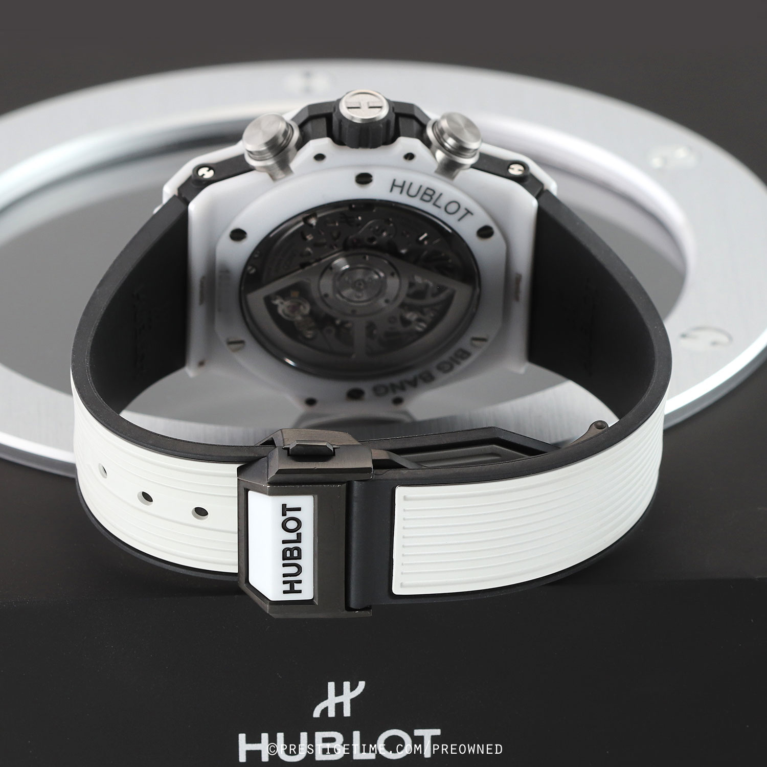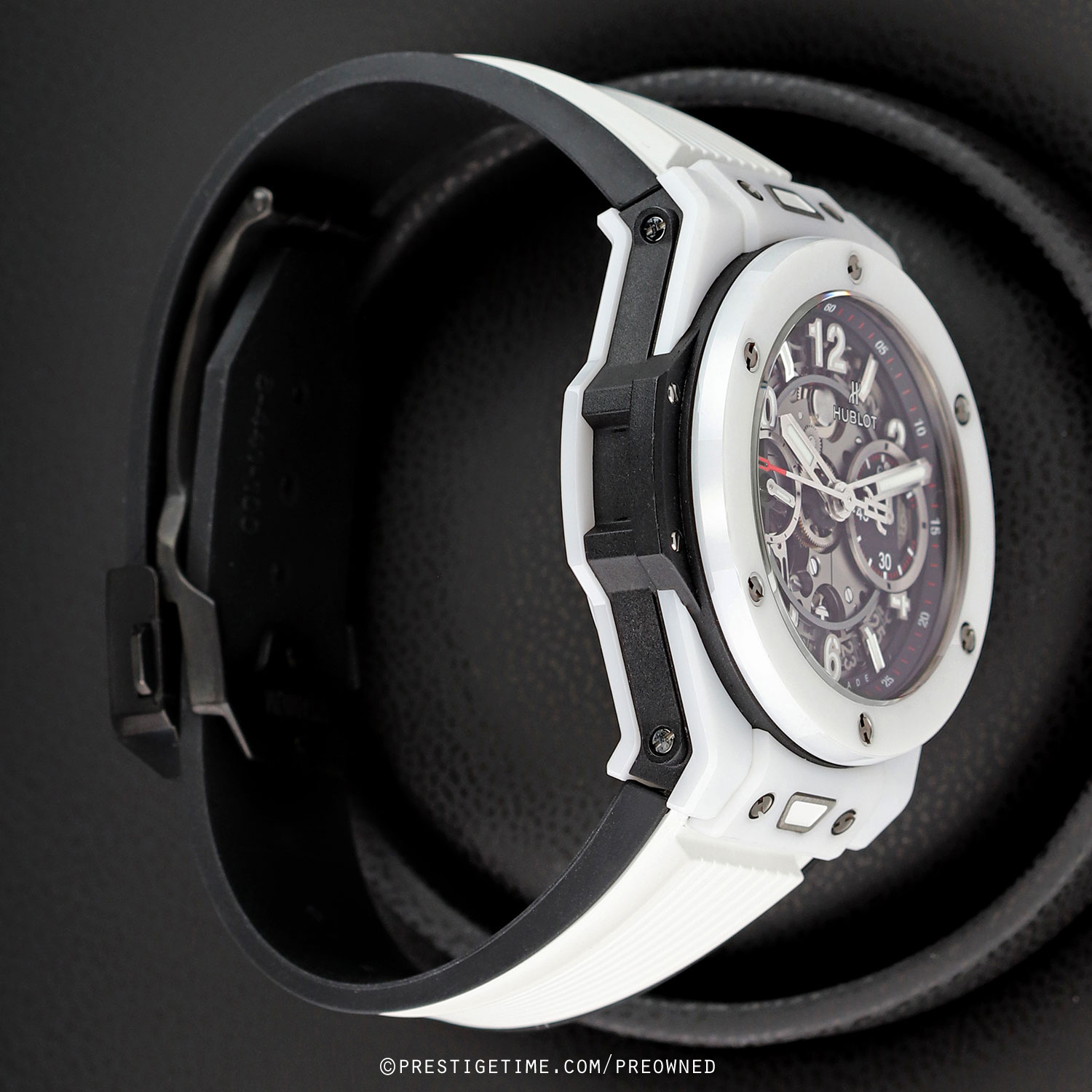 Strap: Straps are easily interchangeable via a unique quick-release push-button system. The buttons are located on the top & bottom central lugs. The watch is fitted on its original white rubber strap with black lining and a push-button deployant buckle.