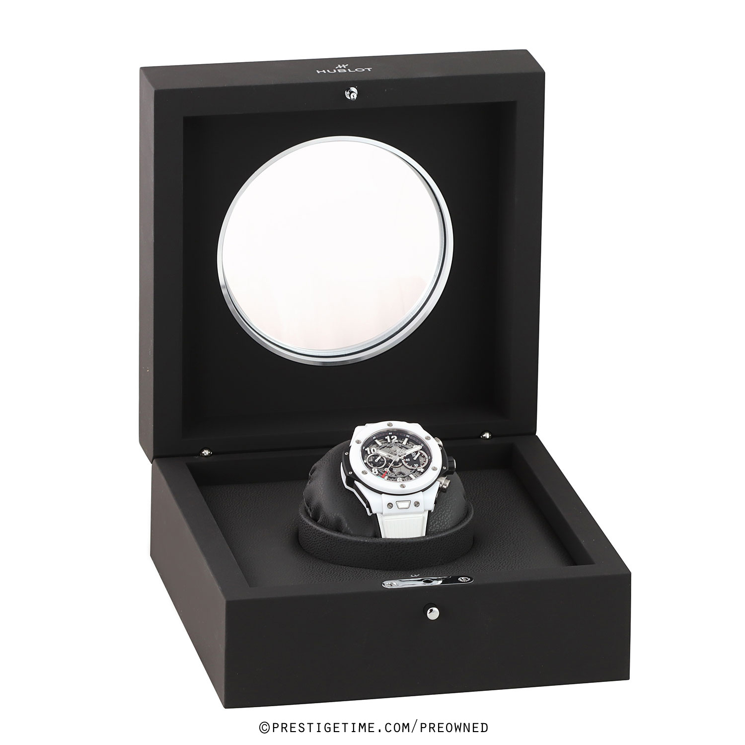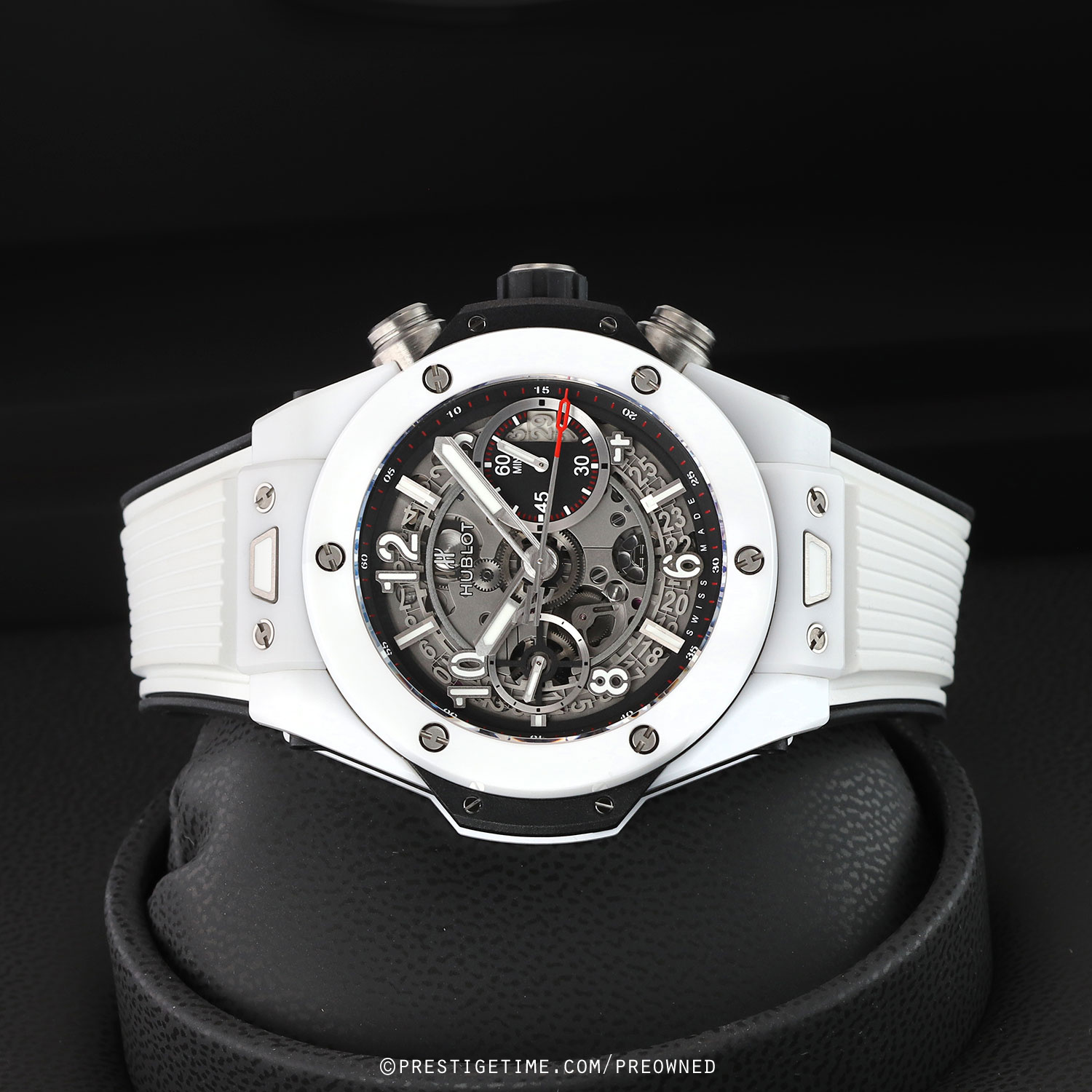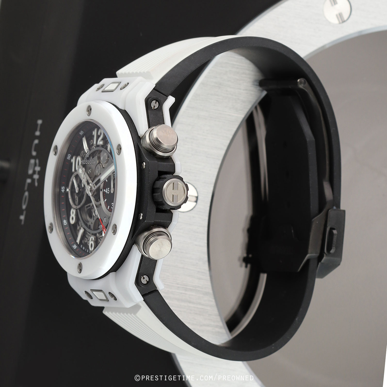 Strap: Straps are easily interchangeable via a unique quick-release push-button system. The buttons are located on the top & bottom central lugs. The watch is fitted on its original white rubber strap with black lining and a push-button deployant buckle.